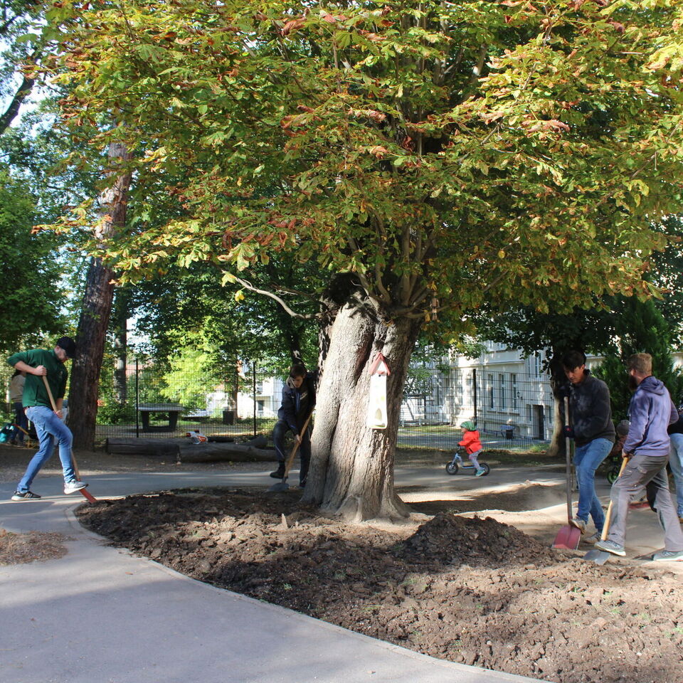 Unsere großen Rasenflächen wurden von Ästen und Blättern befreit und der Bereich um unsere große Kastanie bekam neue Erde und Rasensaat.