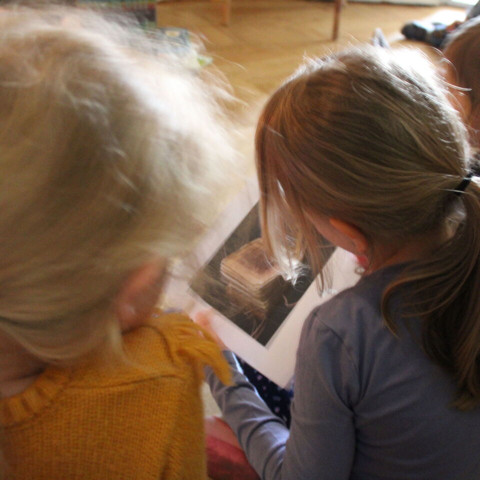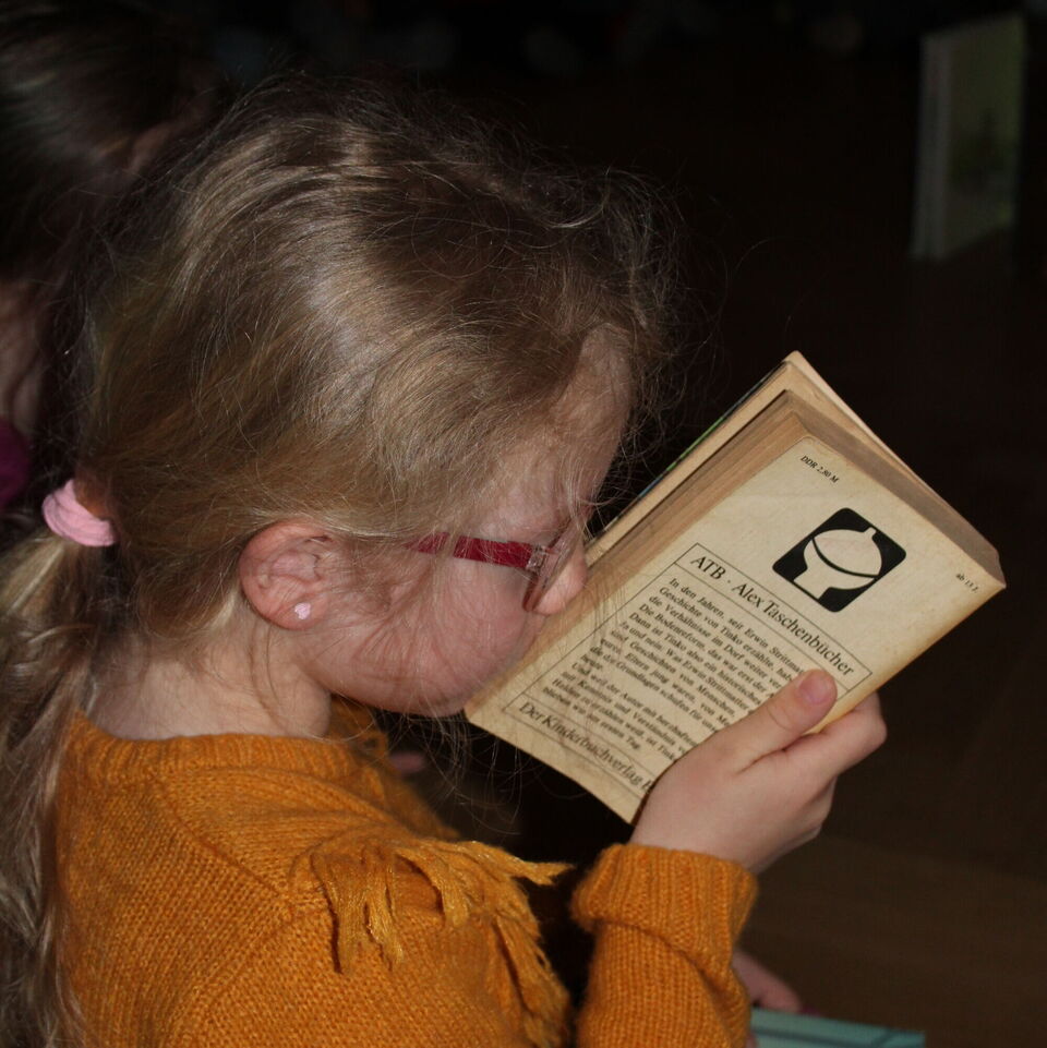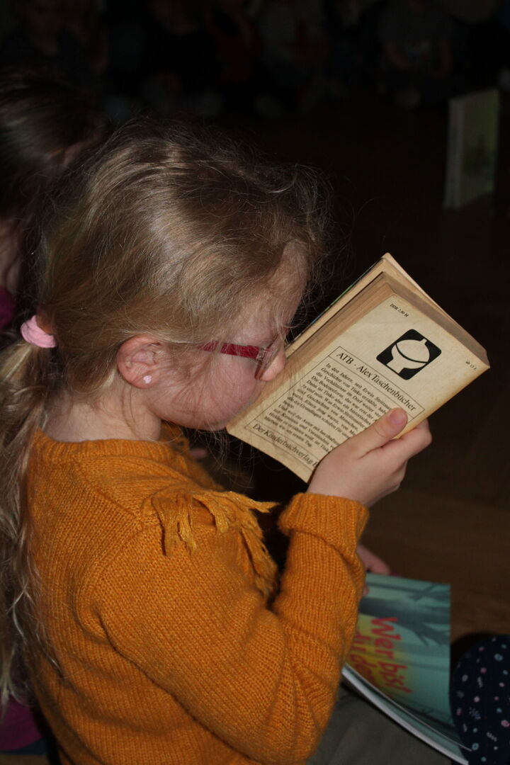 Gemeinsam schauten wir uns ganz alte Bücher an, manche waren sogar über 60 Jahre alt. Wir stellten fest, dass die alten Bücher etwas komisch rochen, manche Kinder sagten es riecht nach „Alt“. Auch die Seiten fühlten sich sehr rau an und die Bilder waren noch nicht bunt.