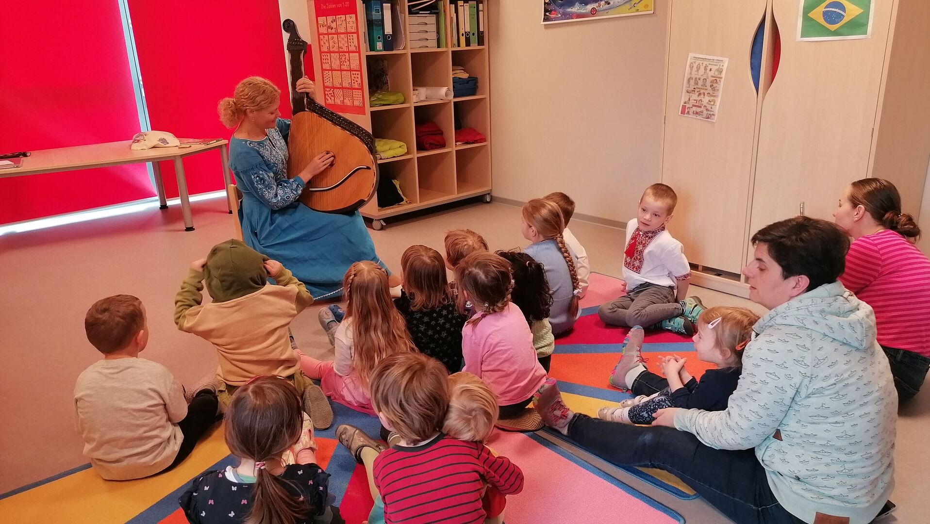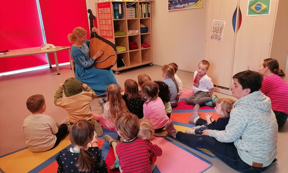 Die Kinder des Roten Bereichs in der Kita „Villa Kunterbunt“ befinden sich auf Weltreise, diese Woche in der Ukraine. Wir haben viel Wissenswertes erfahren: Wie kam das Salz ins Land? Welche Sprachen werden gesprochen? Unsere ukrainische Ehrenamtliche Tetiana brachte ihre Bandura mit, sang mit uns ukrainische Lieder und zeigte den Kindern einen landestypischen Tanz, um den Winter zu vertreiben. Danach konnten die Kinder sich am Musikinstrument ausprobieren. Unsere ukrainischen Eltern haben uns ein unglaublich vielfältiges und leckeres Büffet ermöglicht, wofür wir uns herzlich bedanken. Wir waren gerührt von so viel Einsatz! „Vielfalt als Chance“ - immer wieder gerne.