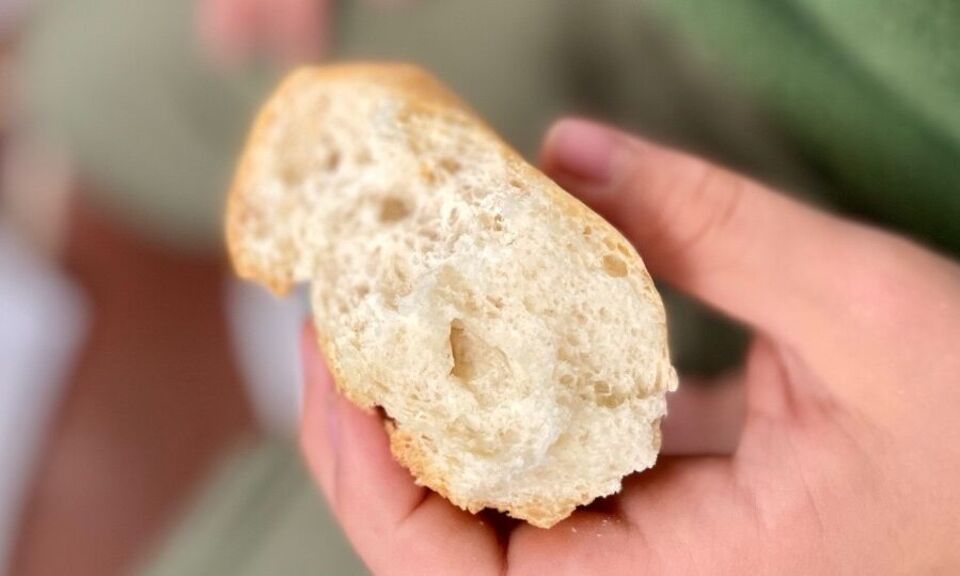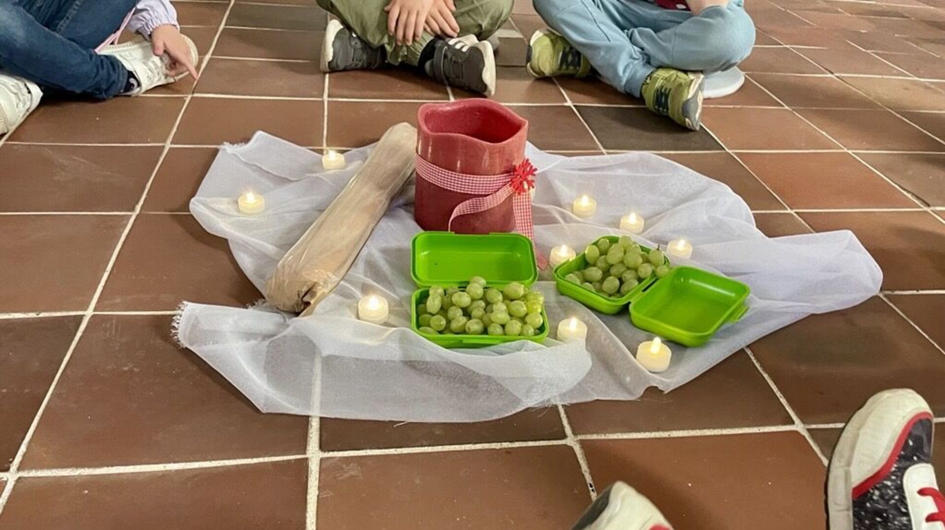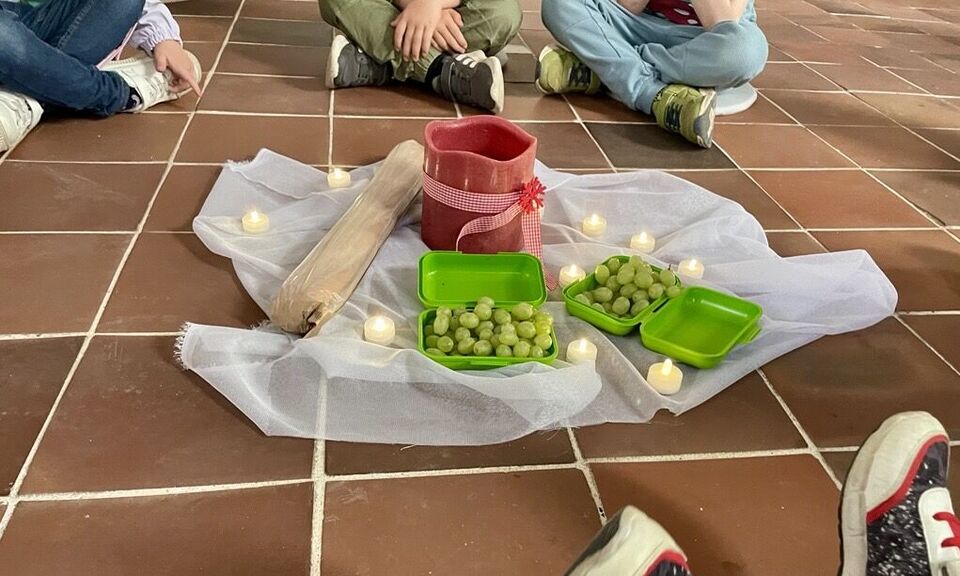 Mit einem schnell gebastelten Fernrohr gingen die Kinder in den Räumen auf Erkundungstour. Viel gab es zu sehen, die Engel, die Altarkerzen, den Taufstein, Jesus am Kreuz, Klavier, Liederbücher und den Roboter, der die Krümel wegsaugt. Der war auch notwendig, denn wir haben vor dem Altar Brot und Trauben geteilt, ganz genau wie Jesus damals, der mit seinen Freunden gern zusammen gesessen, gegessen und philosophiert hat.