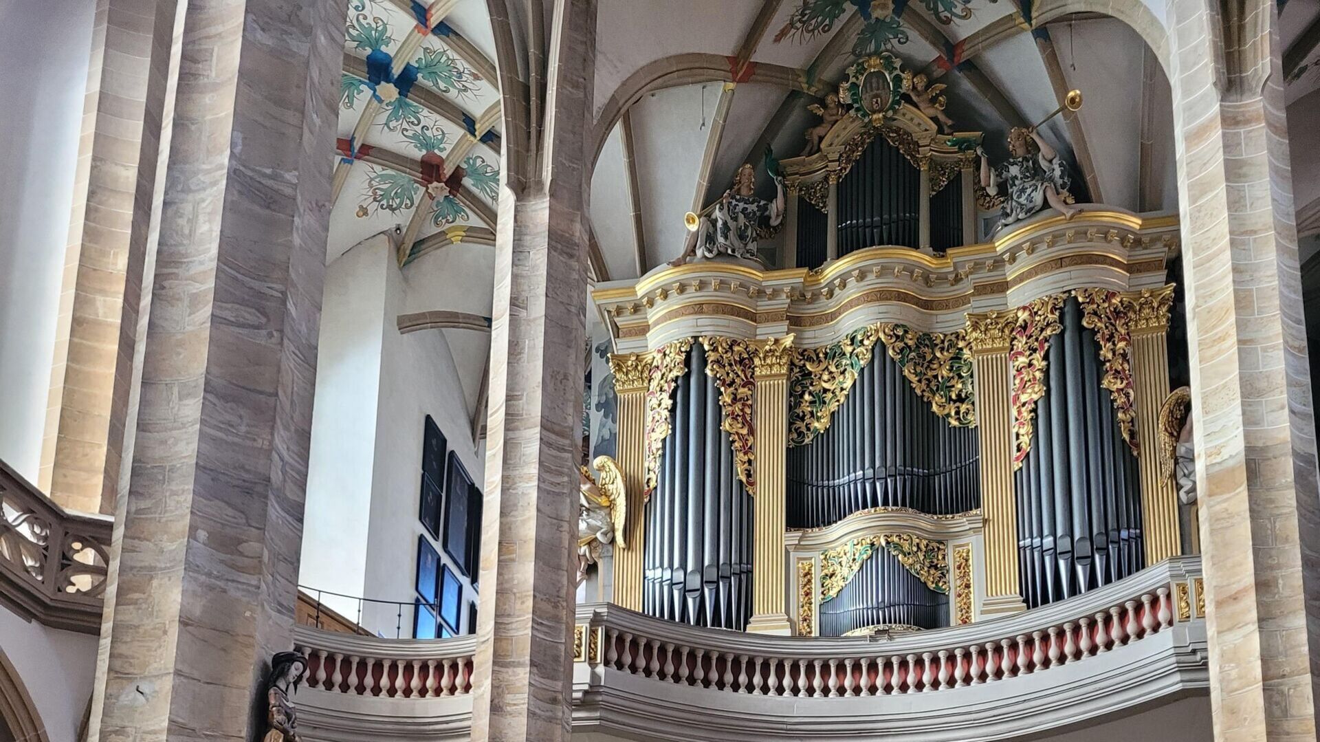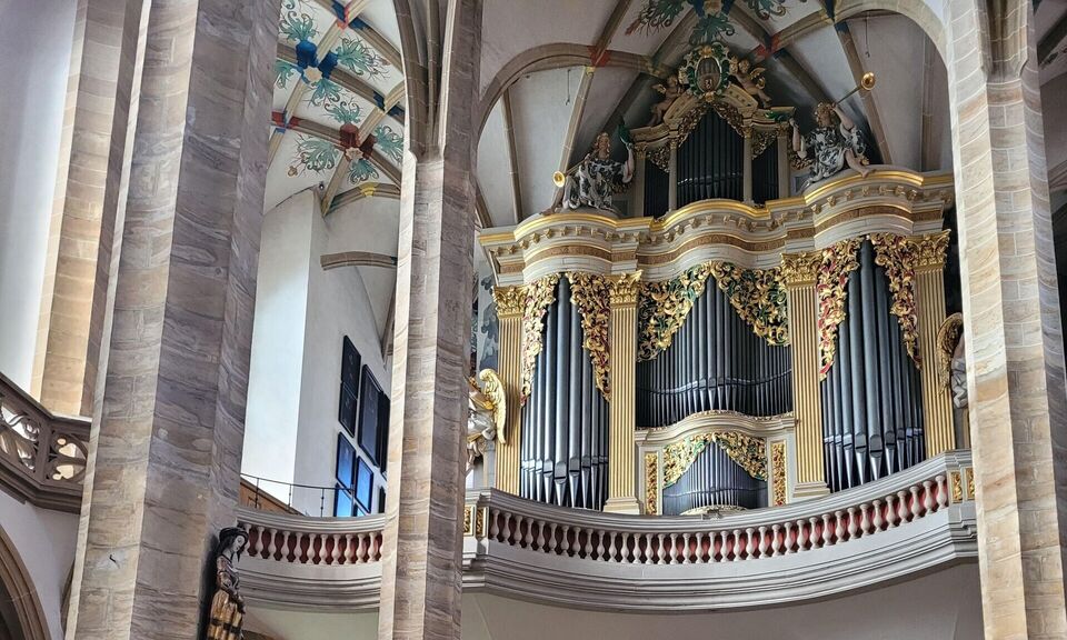 An mehreren Vormittagen immer mit kleinen Gruppen von ca. 15 Kindern – auch schon mit den Kleinsten – durften wir in die Annenkapelle, durch den Kreuzgang, über die berühmte "Goldene Pforte" in den Dom. Die Kinder erkundeten diese Räume unabhängig von den vielen Sehenswürdigkeiten und Attraktionen, die den Dom so bekannt machen. Da war z.B. eine überdimensional große und schwere Tür, die man nicht öffnen konnte, da die Klinke zu hoch war. Eine Türklinke sah wie ein Drache aus. Da gab es die Orgel, die man in der Werkstatt des Orgelbauers gesehen hatte (die Vorschüler*innen durften dort vor einigen Wochen eine Orgelpfeife bauen).