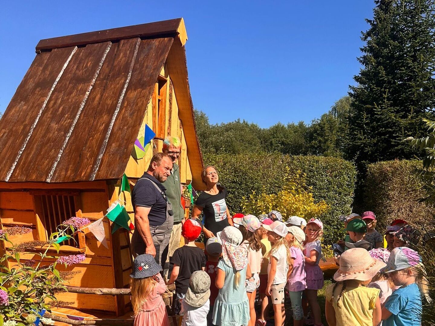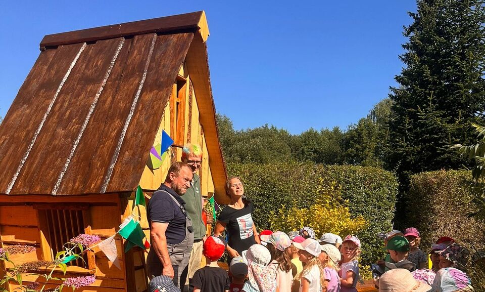 „Komm wir spielen Verstecker.“, ruft Paul zu Anton. Aber wo, wenn die Büsche im Garten noch nicht hoch genug sind. Und eine Hütte für die kleineren Kinder für Rollenspiele wäre auch toll. Das stand beim Team vom Naturkinderhaus Mulda schon länger auf der Wunschliste. Durch die Kreativität und Initiative des Hausmeisterteams konnte dieses Projekt diesen Sommer umgesetzt werden. Von der Skizze bis zum Kinderhauslogo und Deko steckt in der Hütte ganz viel Herzblut. Gleichzeitig ist sie jetzt auch ein Blickfang im Eingangsbereich der Kita. Möglich geworden ist dies auch durch eine sehr großzügige Holzspende von Herrn Bellmann und einer Spendensammlung von Besuchern im ehemaligen Genesungsheim von Mulda, aufgestockt vom neuen Besitzer des Rittergutes Herrn Welzel. Pünktlich zum Kitajahrstart konnten die Kinder endlich das Haus eröffnen und bespielen. Dazu gab es leckeres Fladenbrot aus den neuen von den Vorschuleltern geschenkten Feuerschalen. Herzlichen Dank dafür.