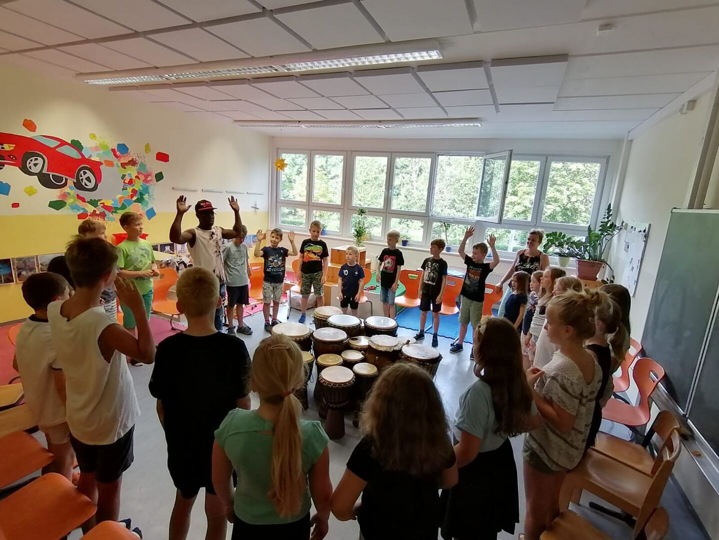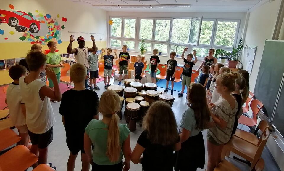 „Funga alafia.“ ein afrikanisches Begrüßungslied, schallte mit vielen Trommeln in den Sommerferien durch den Naturhort. Bereits zum 2. Mal konnten wir Herrn Odametey – Musikpädagoge mit afrikanischen Wurzeln – im Hort zum Trommelworkshop begrüßen. Mit seiner fröhlichen Art und Rhythmusgefühl hatte er sofort alle Kinder begeistert. Ausgestattet mit vielen Trommeln konnten alle Kinder gleich mit einsteigen, probieren und vor allen Spaß haben. Spielte mal jemand langsamer, passte er sich dem Tempo an oder veränderte schnell das Lied. Zwischendrin erzählte er Anekdoten aus seinem Berufsleben und baute kleine Späßchen ein. Für die Ferienkinder war es eine tolle Erfahrung, mit allerlei neuen Wissen über afrikanische Instrumente und Musik, aber vor allem auch laut und lustig.