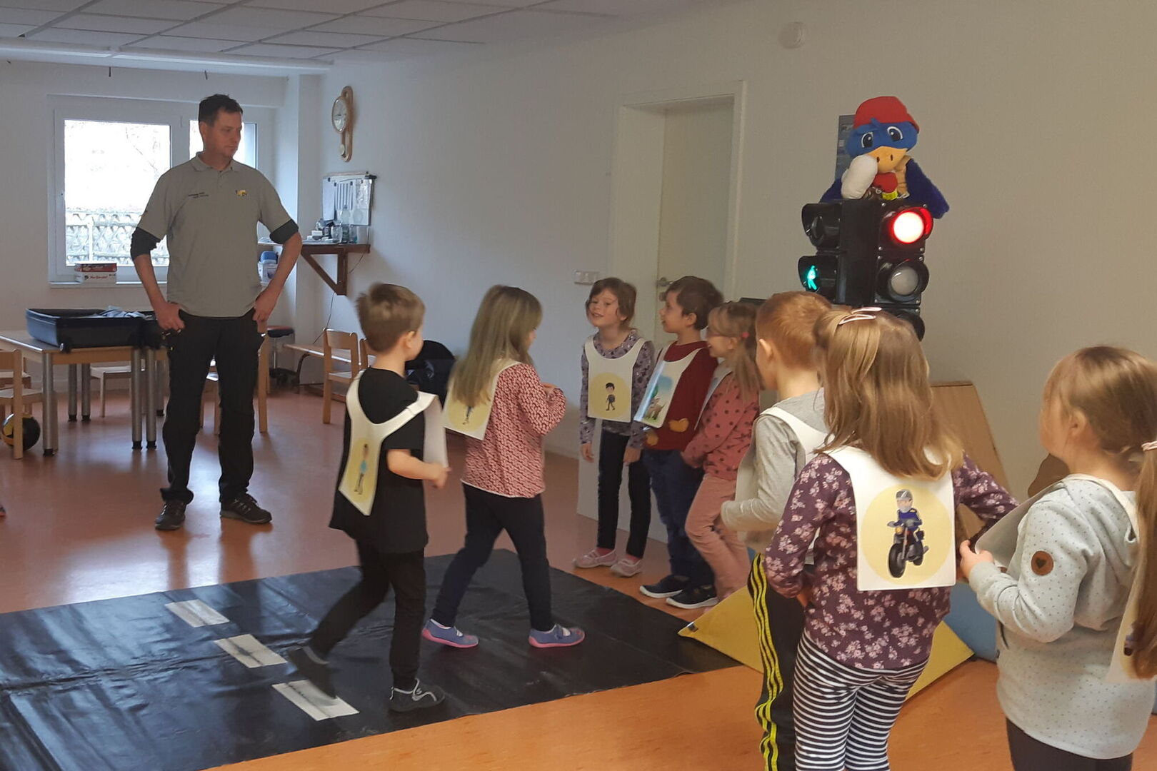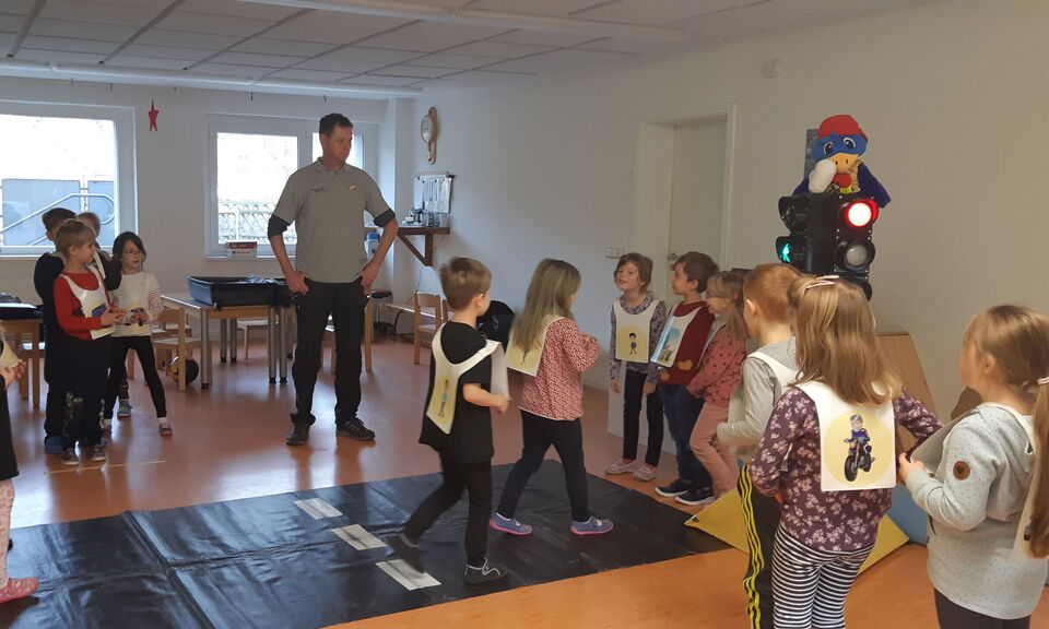 Eine Woche später kam Adacus nach Mulda geflogen. Adacus, der Rabe, ist das Maskottchen vom ADAC. Dieser besucht uns ebenso regelmäßig und übt mit den Kindern das richtige Verhalten im Straßenverkehr. Schon von klein an lernen die Kinder mit den Eltern und uns Pädagogen wie sie richtig über die Straße gehen. Links, rechts, links wissen alle Kinder. Adacus hat den Vorschülern aber noch erklärt warum sie erst nach links schauen müssen und vor allen dass sie dies an der Fussgängerampel bei grün auch tun müssen. Mit einer funktionierenden Ampelanlage, Straßenteppich und Kindern als Autofahrer und Fußgänger wurde dies mehrfach geübt. Konzentration war gefordert, da der Impuls bei grün los zu laufen oft stärker war als das kurze Abwarten und schauen ob die Autos wirklich stehen. Für unsere kommenden Ausflüge mit den Vorschülern war dies nochmal eine wichtige Übung, die nicht oft genug wiederholt und im Alltag geprobt werden kann. Dabei sind allerdings auch wieder alle Straßenverkehrsteilnehmer aufgefordert mit zu helfen. Auf dem wöchentlichen Weg zur Vorschulstunde im Hort können die Kinder manchmal schlecht nach links und rechts schauen, wenn auf dem Fussweg und im Halteverbot „Elterntaxis“ stehen. Besonders in der Bringzeit vor der ersten Schulstunde passiert dies wieder häufiger. Vielen Dank an Alle, die die Parkplätze am Spielplatz und gegenüber nutzen. Da ist sicher auch noch Platz für alle Anderen.