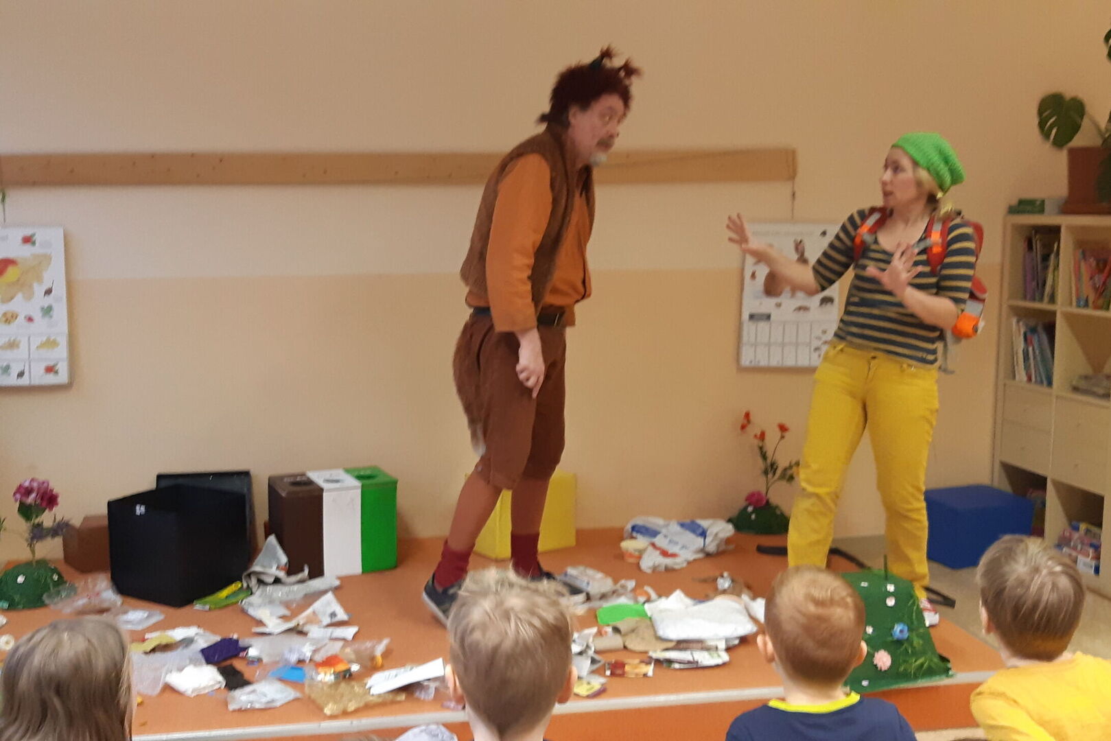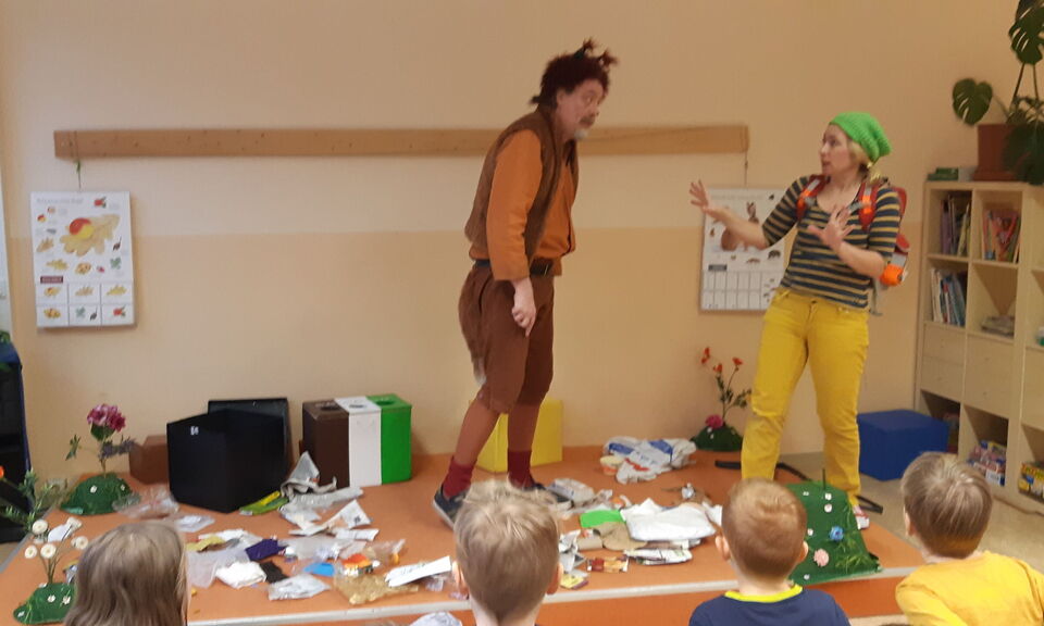 … räumen die Vorschüler freiwillig auf und gehen sicher über die Straße. Pfiffikus, der schlaue Fuchs, von den Entsorgungsdiensten Mittelsachsen besuchte die Vorschüler und die 1. Klasse vor den Ferien. Gemeinsam mit der Waldfee wollte er ein großes Fest feiern. Aber auf der Waldlichtung war lauter Müll. Dieser musste natürlich erst eingesammelt werden. Spielerisch mit einem kleinen 2-Mann-Theaterstück lernten die Kinder welcher Müll in welche Tonne gehört. Da wir auch in den Kitas und der Grundschule mit den kleinen farbigen Mülltonnen arbeiten hatten die Kinder ein gutes Vorwissen und konnten Pfiffikus beim Aufräumen helfen. In welchen Container rotes und blaues Glas gehört war für einige Kinder neu und manche Eltern werden mit den Kindern die Batteriesammelstelle im nächst gelegenen Supermarkt suchen müssen, um diese fachgerecht zu entsorgen. Die Vorschüler als Zethau wendeten ihr Wissen im Anschluss gleich an und sammelten eine kleine Tüte Müll auf dem großen Spielplatz ein. Vielen Dank dafür. Die Kinder würden sich freuen, wenn gar nicht so viel Müll liegen bleiben würde. Hier sind alle Gäste und Nutzer des Platzes gefragt und können einen kleinen Beitrag zum Umweltschutz leisten.