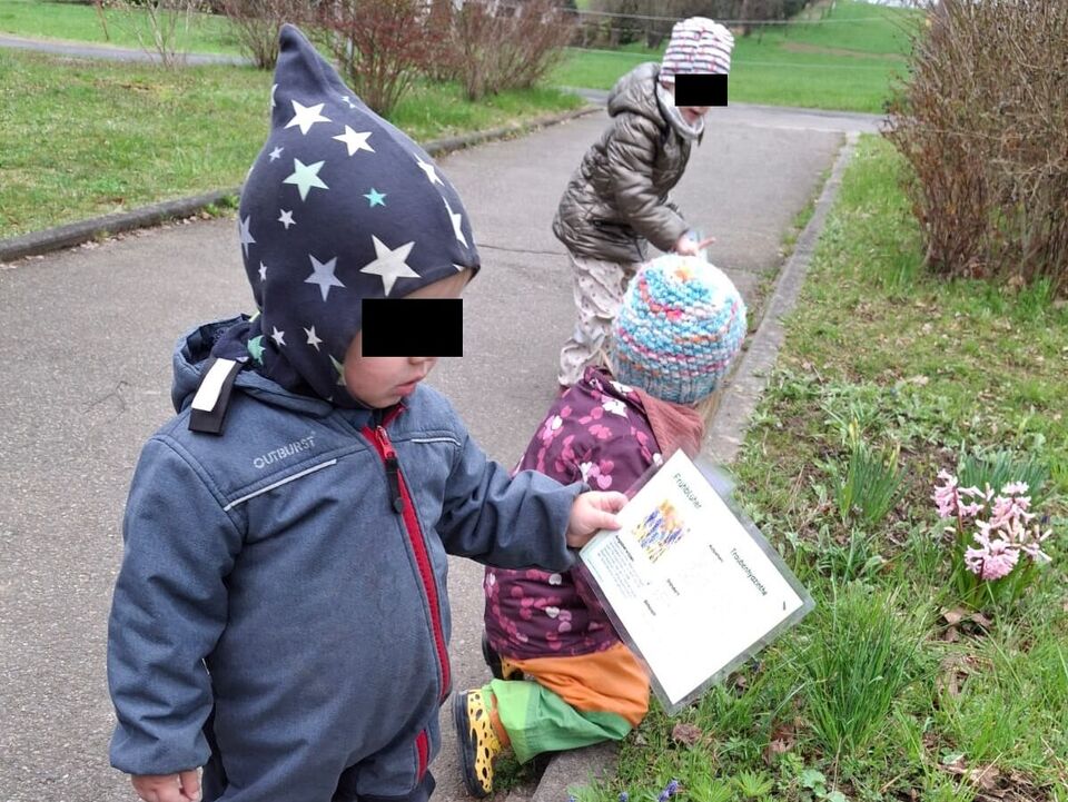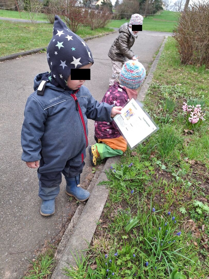 Heute haben wir, nachdem wie Ostereier bemalt haben, Frühblüher in Naundorf gesucht. Dazu sind wir über den Friedhof gelaufen. Alle Kinder haben sich von unseren Wissenskarten der Frühblüher, ihren Frühblüher ausgesucht und diesen dann draußen gesucht. Dies war spannend für die Kinder und hat super geklappt. Eine Entdeckung war zudem: Die Hyazinthe gibt es nicht nur in pink gibt, sondern auch in weiß und lila. Am Ende des Ausflugs haben alle ihren Frühblüher von der Karte in der realen Welt gefunden: Krokus von ihrer Karte nicht mit dem weißen Krokus, Osterglocke, Blaustern, Gänseblümchen und Traubenhyazinthe.