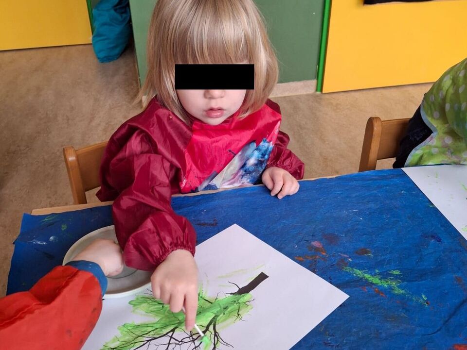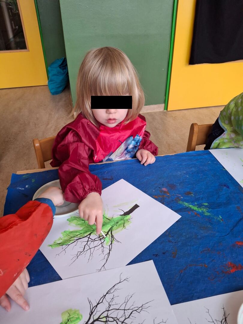 Diese Woche haben wir das Thema Frühblüher. So haben wir rausgefunden, dass Bäume auch erblühen. Dies haben wir mit Blüten und Blättern an Bäumen nachgemalt. Um die Farbe auf das Blatt zu bekommen, nutzten wir Wattestäbchen und Stempel in Blütenform. Das Tupfen und Stempeln ohne schmieren oder streichen, will gelernt sein...