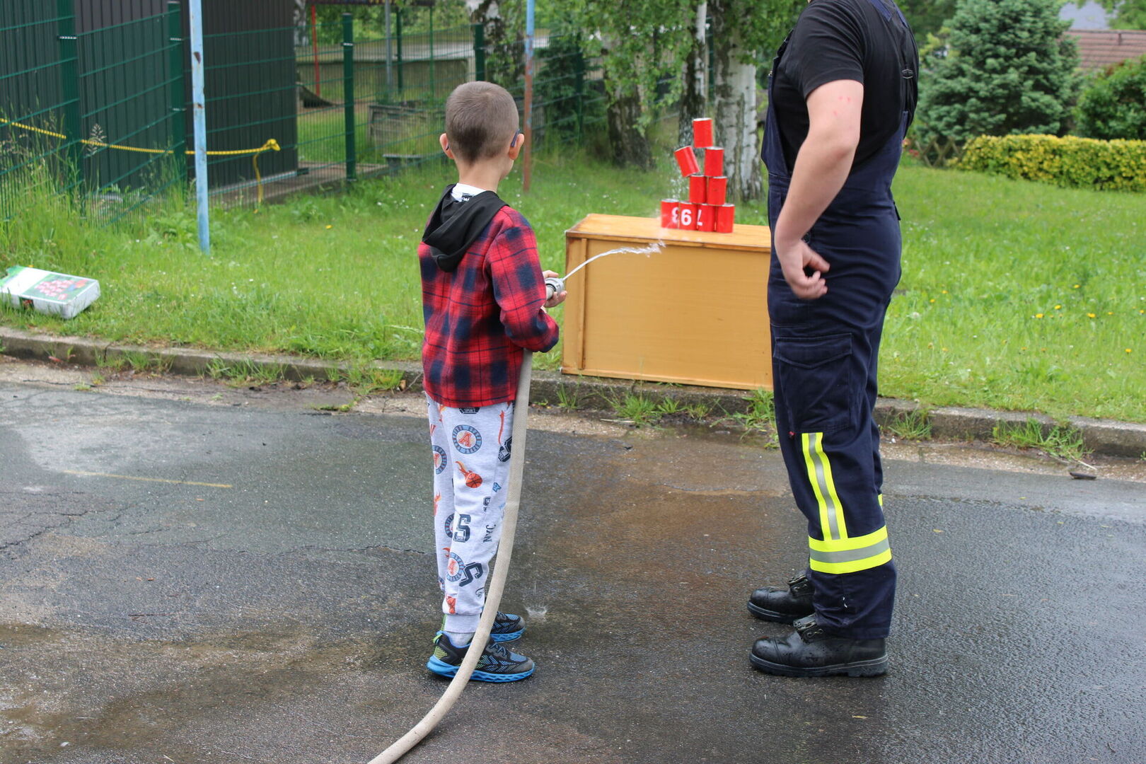 Nach so viel Aufregung folgte nun Spiel und Spaß: Die Kinder konnten sich in die Feuerwehr setzen, mit einem echten Feuerwehrschlauch löschen, Zielspritzen und einen Tischtennisball durch den Schlauch befördern!