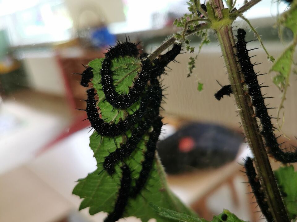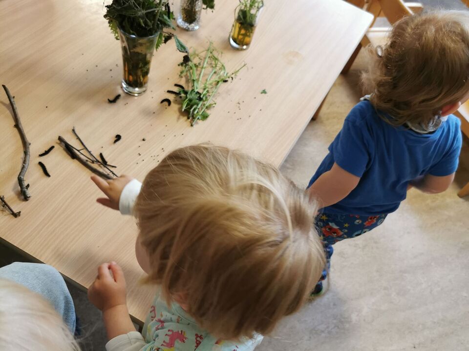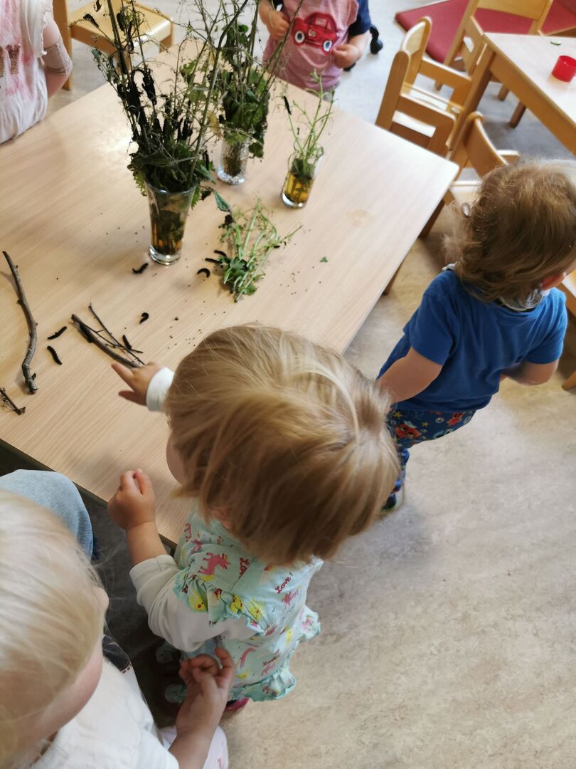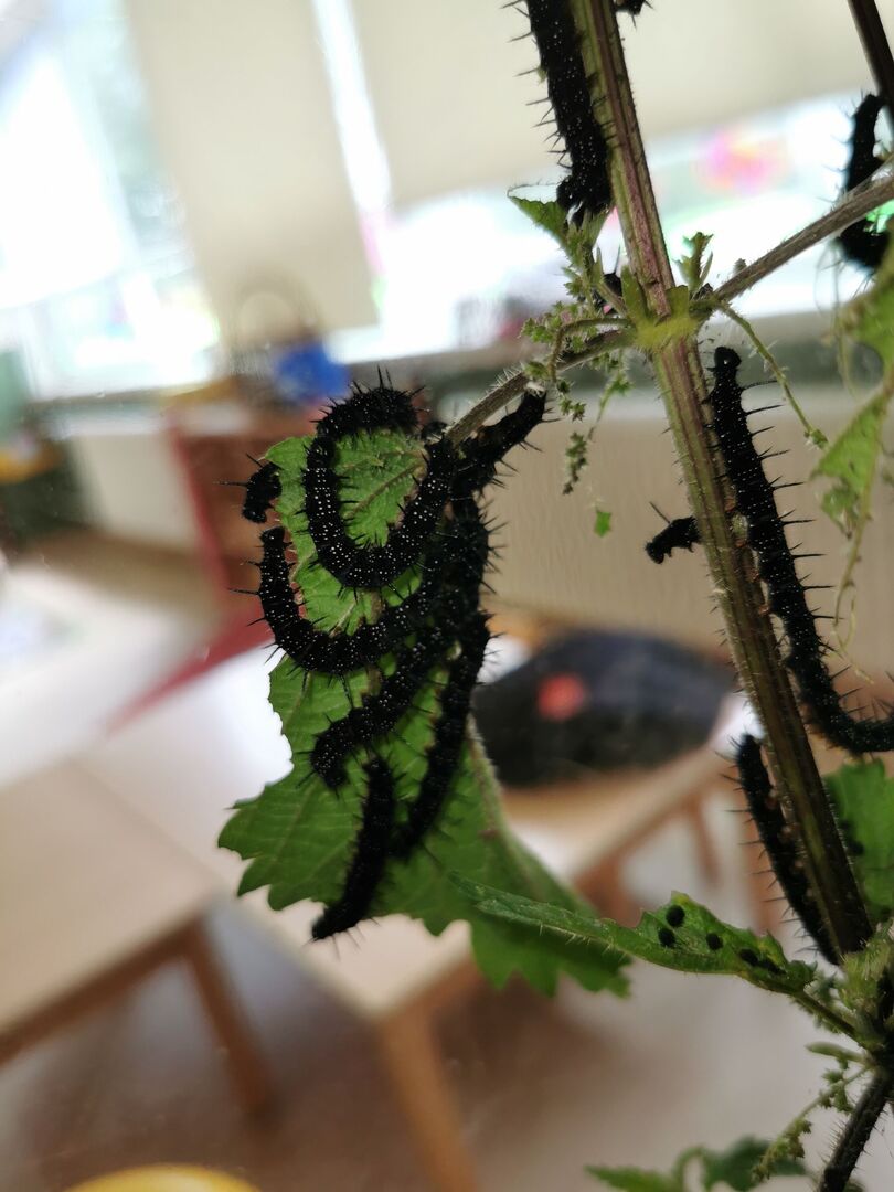 In der Gruppe der Waldentdecker ist Fütterungszeit für die nimmersatten Raupen. Von einem Tag zum anderen sind 4 große Sträuße Brenneseln verputzt. Erstaunlich zu beobachten für die Kleinen und Großen in unserer Kita!