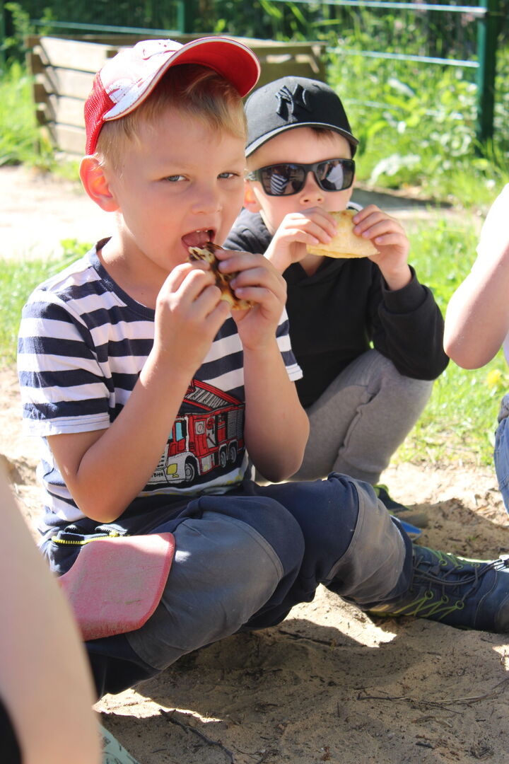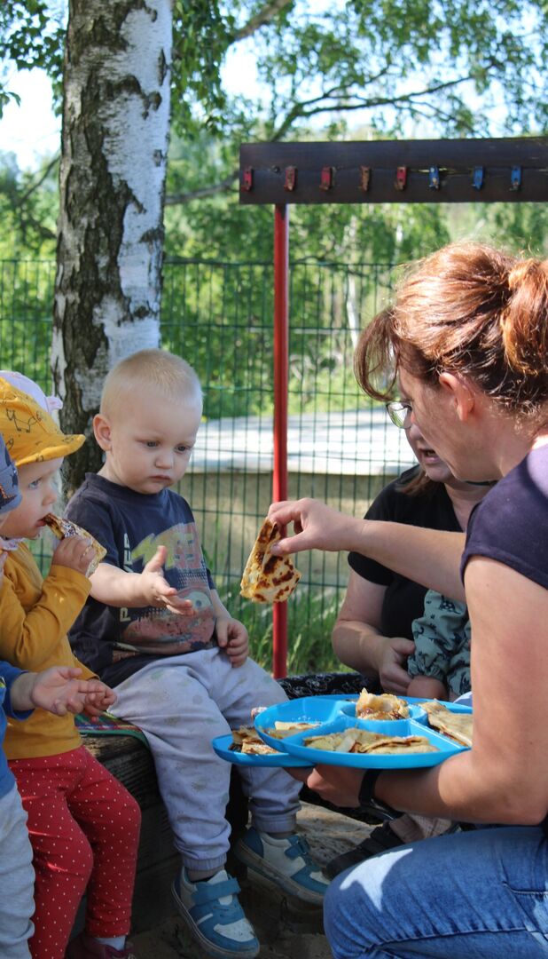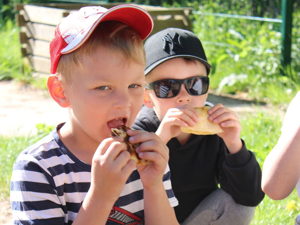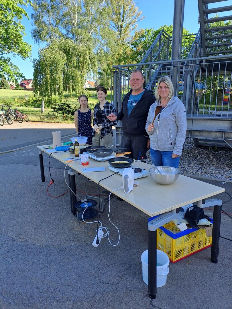 Am Montag, den 13.05.2024 betreuten Frau Noack, Herr Böhmer und unsere beiden Schulpraktikantinnen Amalia und Aurelie unsere Freiluft- Eierkuchen- Backstation!