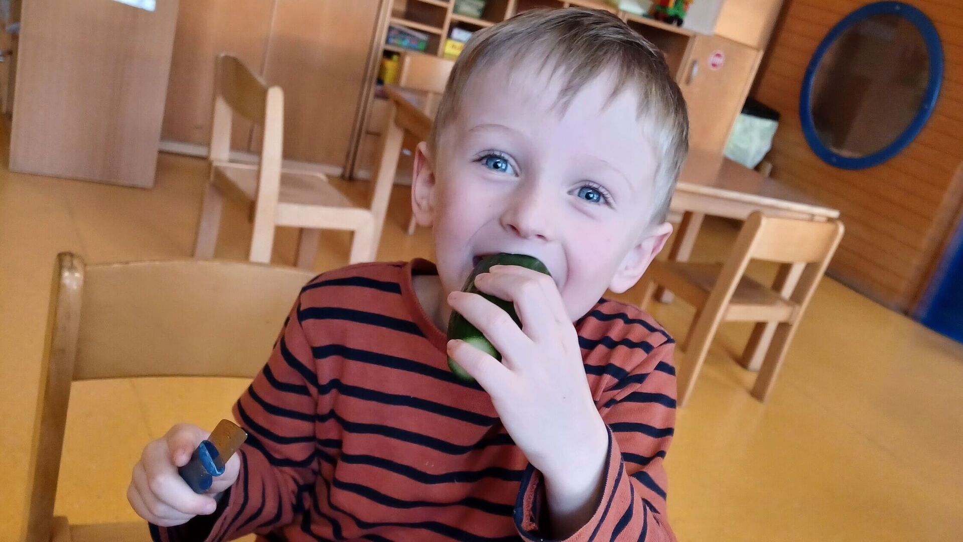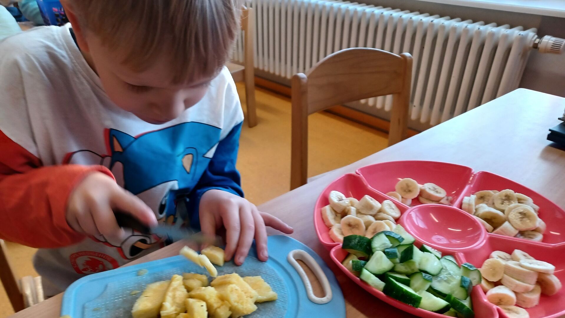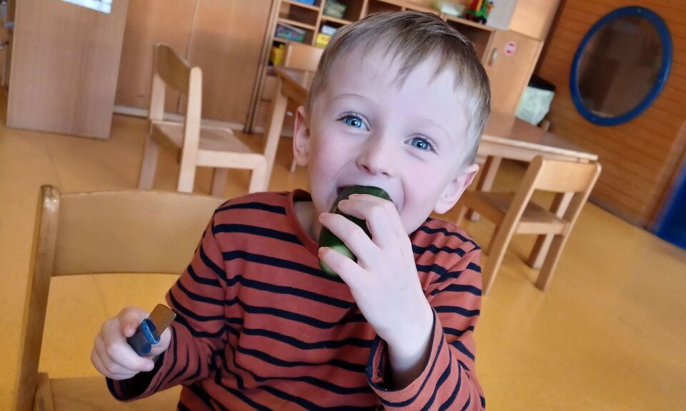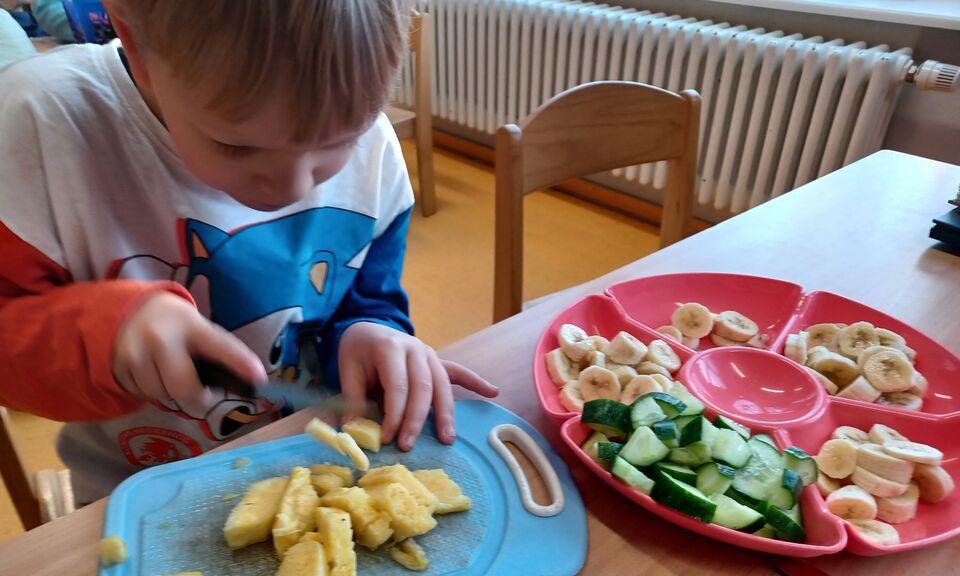 Jeden Tag gibt es im Kindergarten und der Krippe frisches aufgeschnittenes Obst als zweites Frühstück. Die Kinder lieben es, am Vormittag noch einen fruchtigen Snack zu bekommen, der auch noch gesund ist. Noch besser schmeckt es jedoch, wenn das Obst und Gemüse selber vorbereitet wird.
