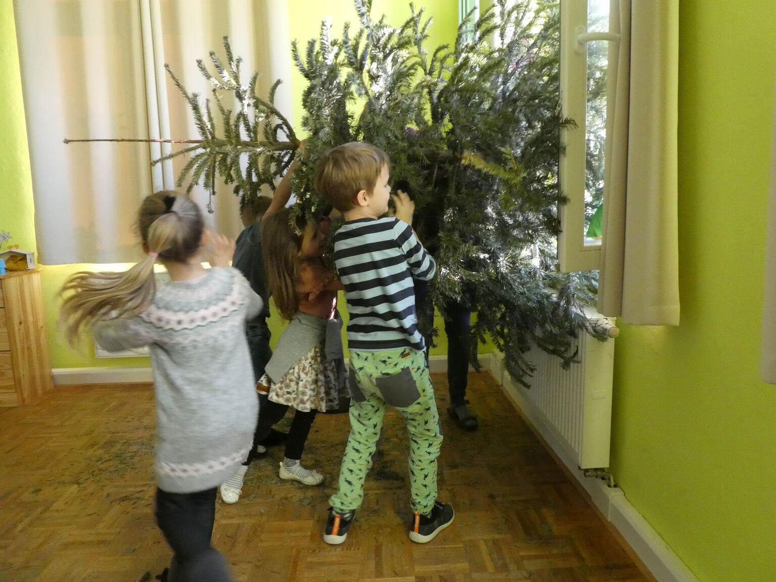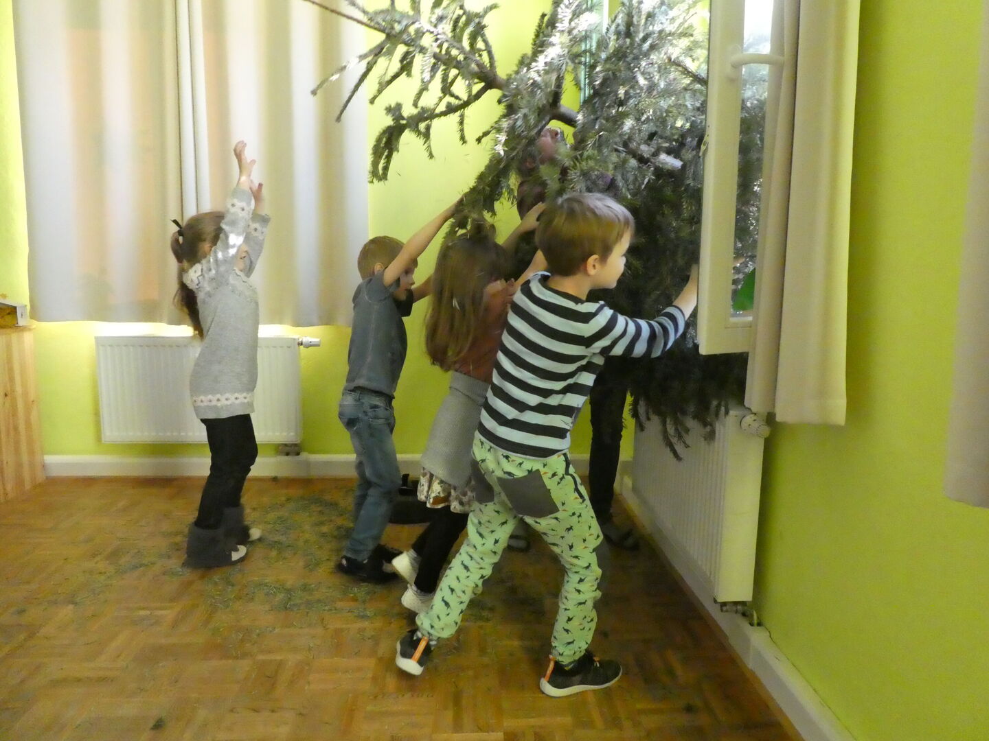 Gestern war es soweit. Die Wachgruppenkinder stellten fest, dass unser Weihnachtsbaum so langsam nicht mehr schön ist. Schnell wurden Ideen gesammelt und gemeinsam angepackt. Als Erstes musste natürlich der gebastelte Schmuck vom Baum genommen werden und in einer Kiste gesammelt für das nächste Mal. Dann wurde vorsichtig die Lichterkette abgenommen, dabei sind schon so einige Nadeln auf den Boden gefallen. Eines der Kinder bemerkte, dass wir einen Besen zum Aufkehren brauchen. Und dann packten alle mit an und hoben den Baum hoch und dann ab aus dem Fenster.