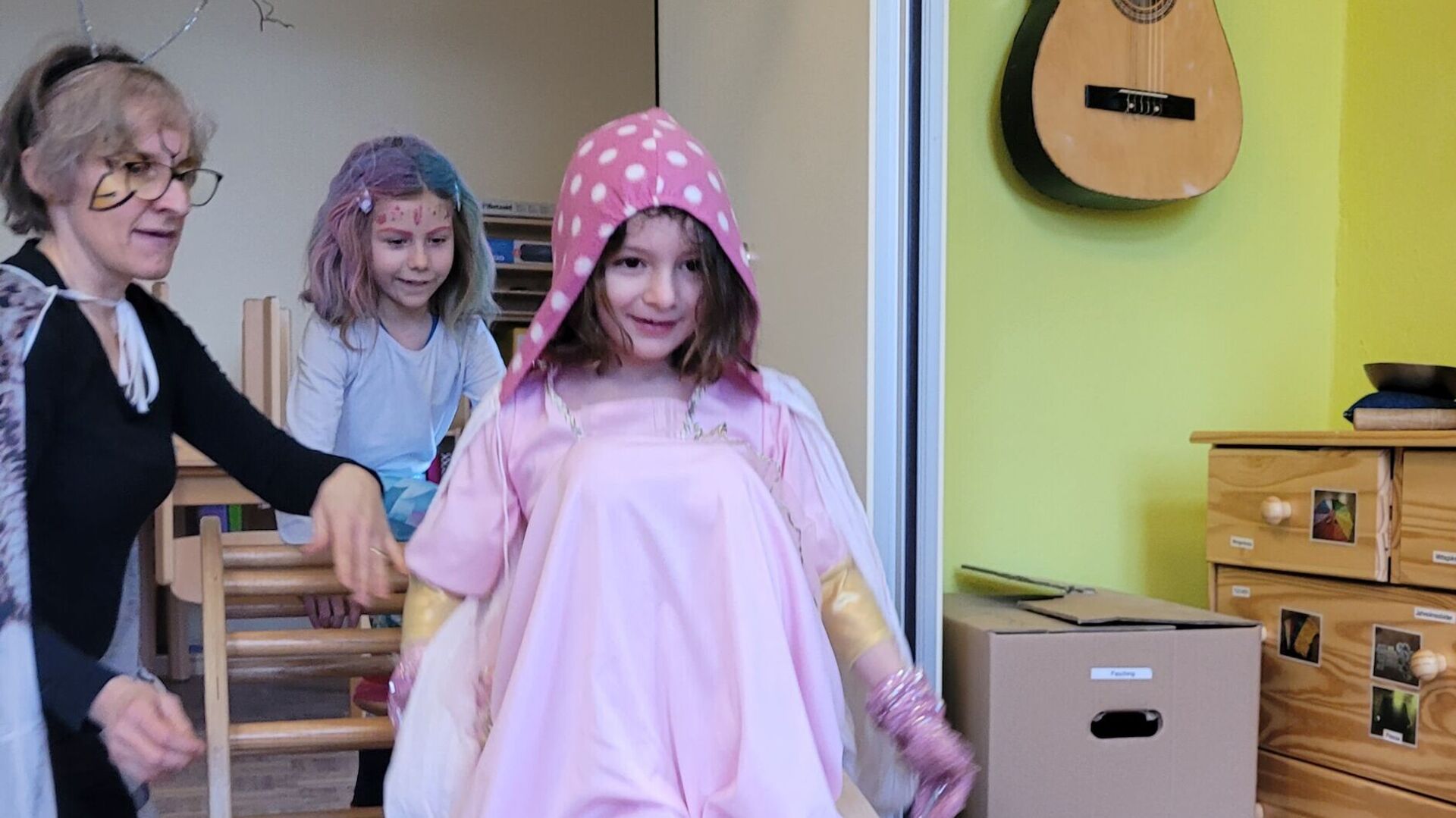 Heute haben wir wieder gestaunt, wieviele verschiedene Verkleidungen es gibt. Von der Katze bis zu Asterix war alles dabei. Buntes Treiben, Lachen, Tanzen und natürlich Pfannkuchen essen.