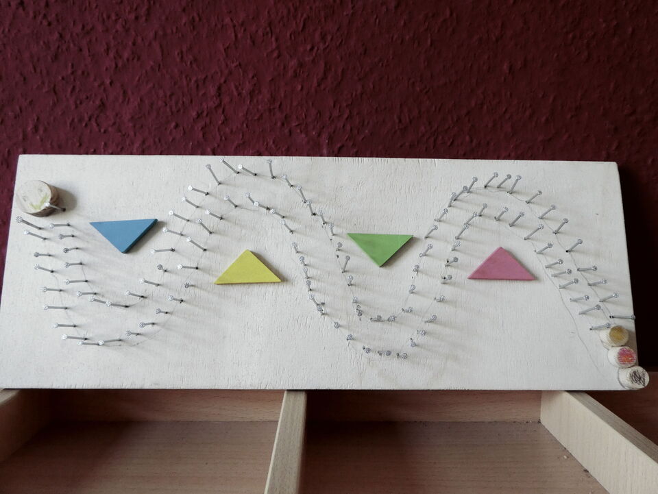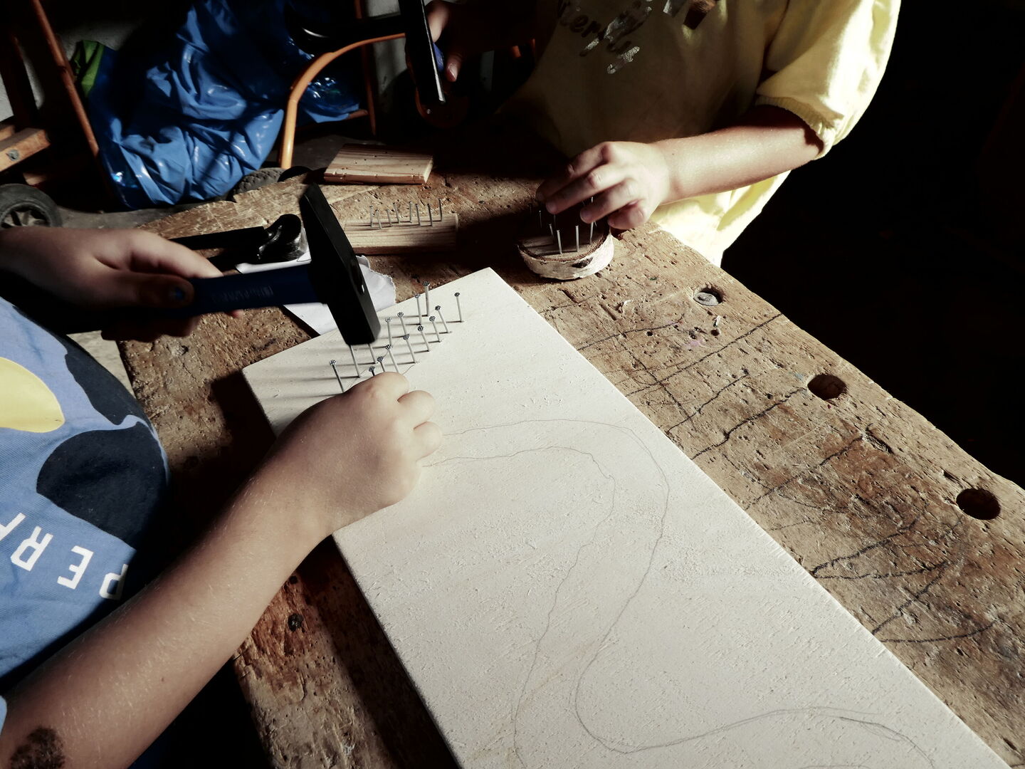 Ich bin noch nie hier rausgekommen, ich weiß es nicht. Aber es klang schön in meinen Ohren, wie sie so vertraut in unserer kleinen Hütte Geheimnisse und Ideen austauschten. Und dann war ich endlich an der Reihe. Heute kamen vier kleinere Kinder mit einem Großen. Sie schauten sich die Werkstatt an und unterhielten sich über die Ideen, die sie hatten: einen Igel vielleicht oder einen Roboter? Eine Kinderhand griff nach mir. "Ich mache eine Kugelbahn!" hörte ich. Und dann ging es auch schon los. Ich wurde geschliffen und man malte auf mir eine Schlange mit Punkten. Da sollten die Nägel später rein.