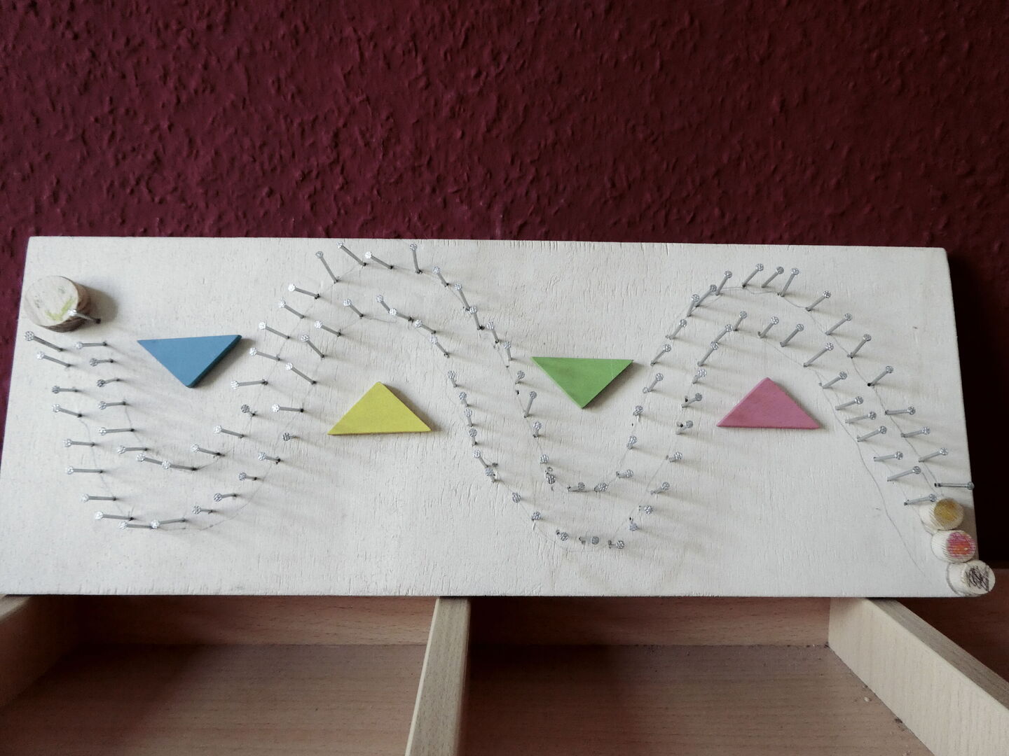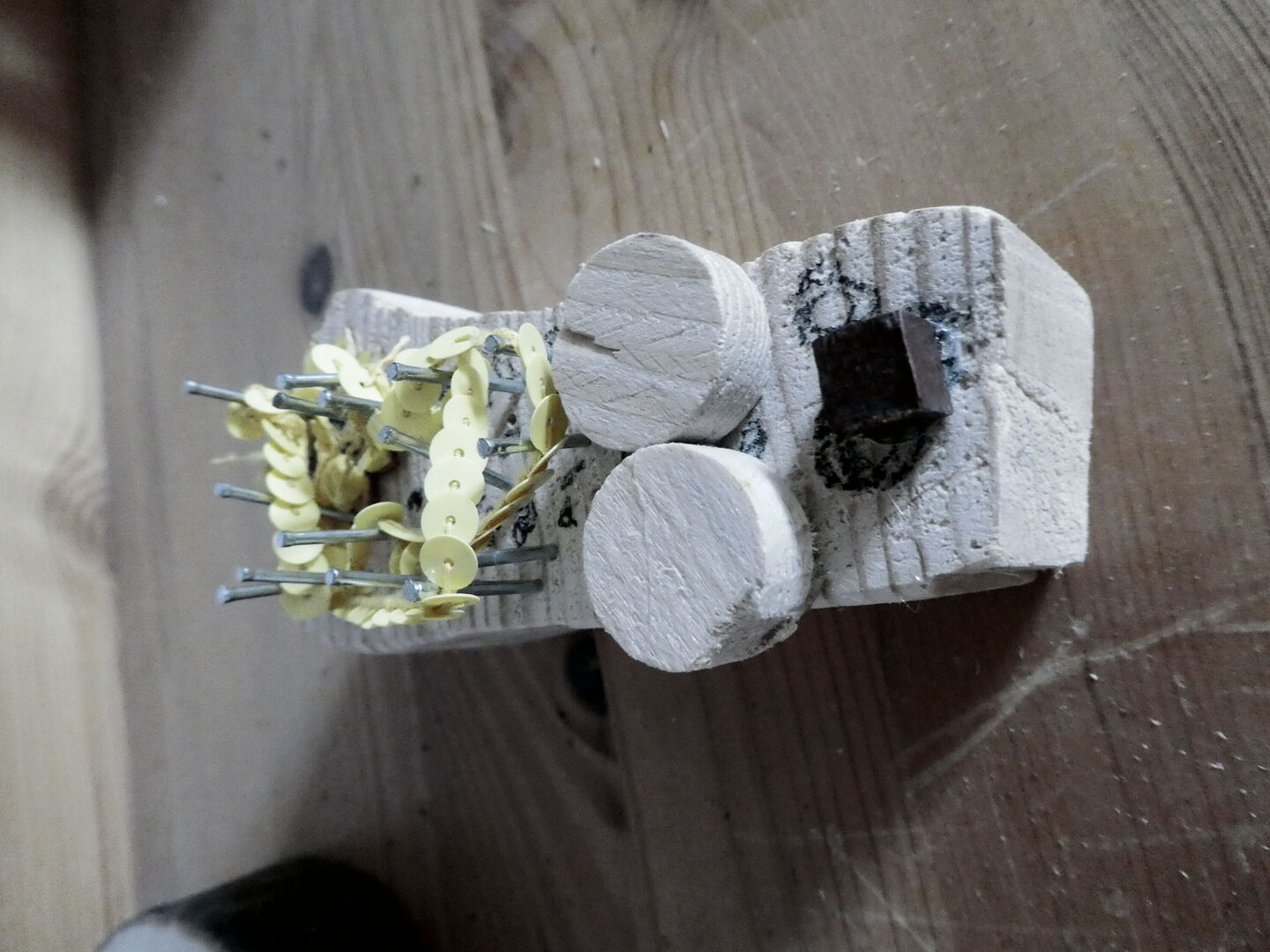Ich sah von der Werkbank, das erste Mal auch die Anderen im Raum: Hammer, Nagel, Schrauben, Zange, Bohmaschine und die anderen Hölzer, mit denen ich mich in kalten Tagen so oft unterhalten hatte. Schön war es von den Kinderhänden befühlt zu werden. Ob ich schon glatt genug war? Dann wurde ich lange angeschaut und Nägel wurden eingeschlagen. Mancher Nagel war schief, aber das macht mir gar nichts. Ich sollte ja was Besonderen werden! Etwas "Eigenes"!
