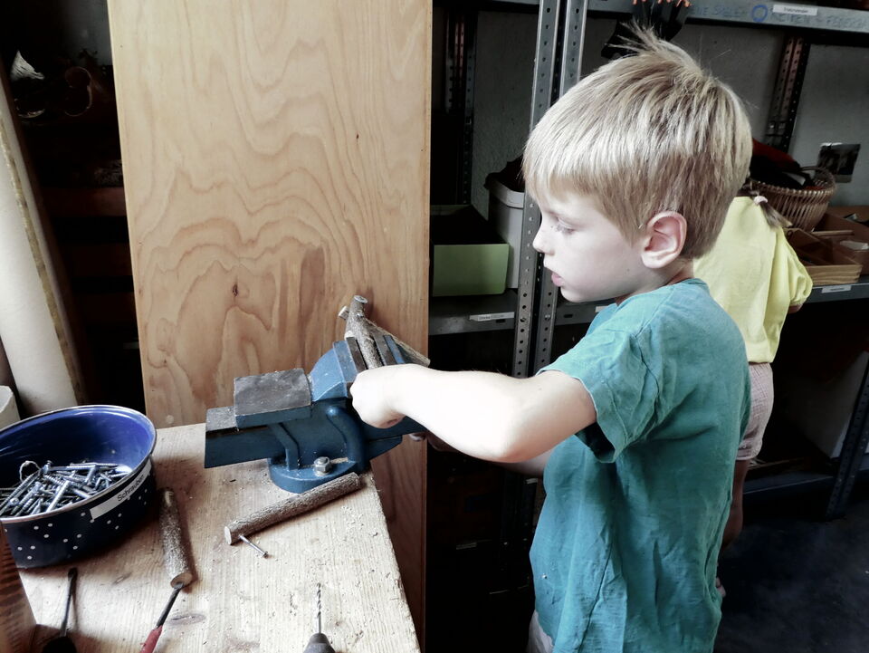 Da lag ich nun schon soooo lange. Von draußen hörte ich immer mal wieder Kinderstimmen. Dann kam ein großer Mensch herein und kehrte und sortierte die Werkzeuge. Es wurde wärmer draußen, ich spürte es. Und dann ging es endlich los! Kinder kamen und nahmen etwas aus den Regalen, klebte, hämmerten, malten und sägten. Sie unterhielten sich über Schule. Was auch immer das ist.