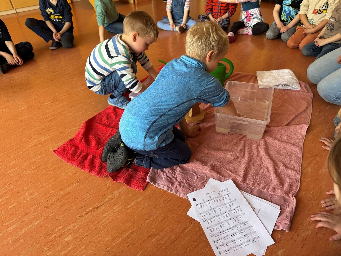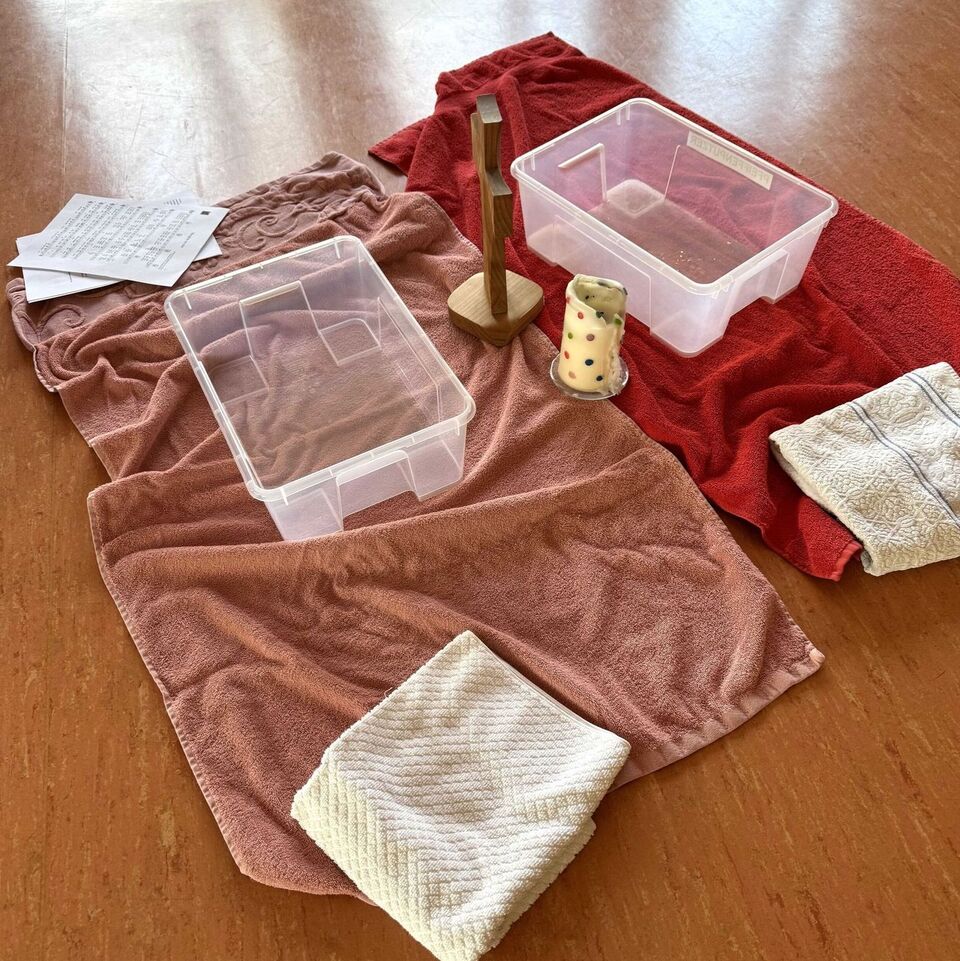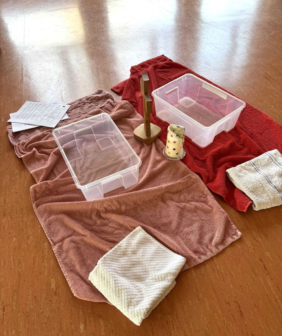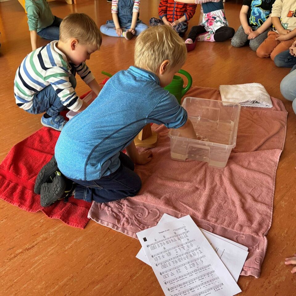 Die Kinder kommen in den abgedunkelten Mehrzweckraum der christlich integrativen Kindertagesstätte Riesenzwerge. In der Mitte liegen Handtücher. Drauf stehen Schalen, das Andachtskreuz, eine Kerze und Gießkannen. Mit der Frage „Wofür brauchen wir Wasser?“ werden die Kinder begrüßt und die Antworten kommen sehr schnell.