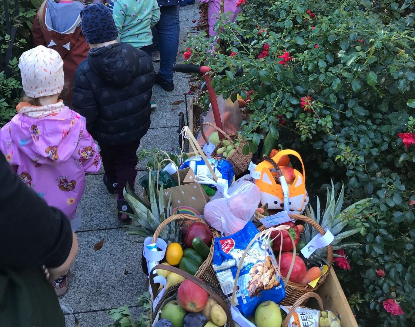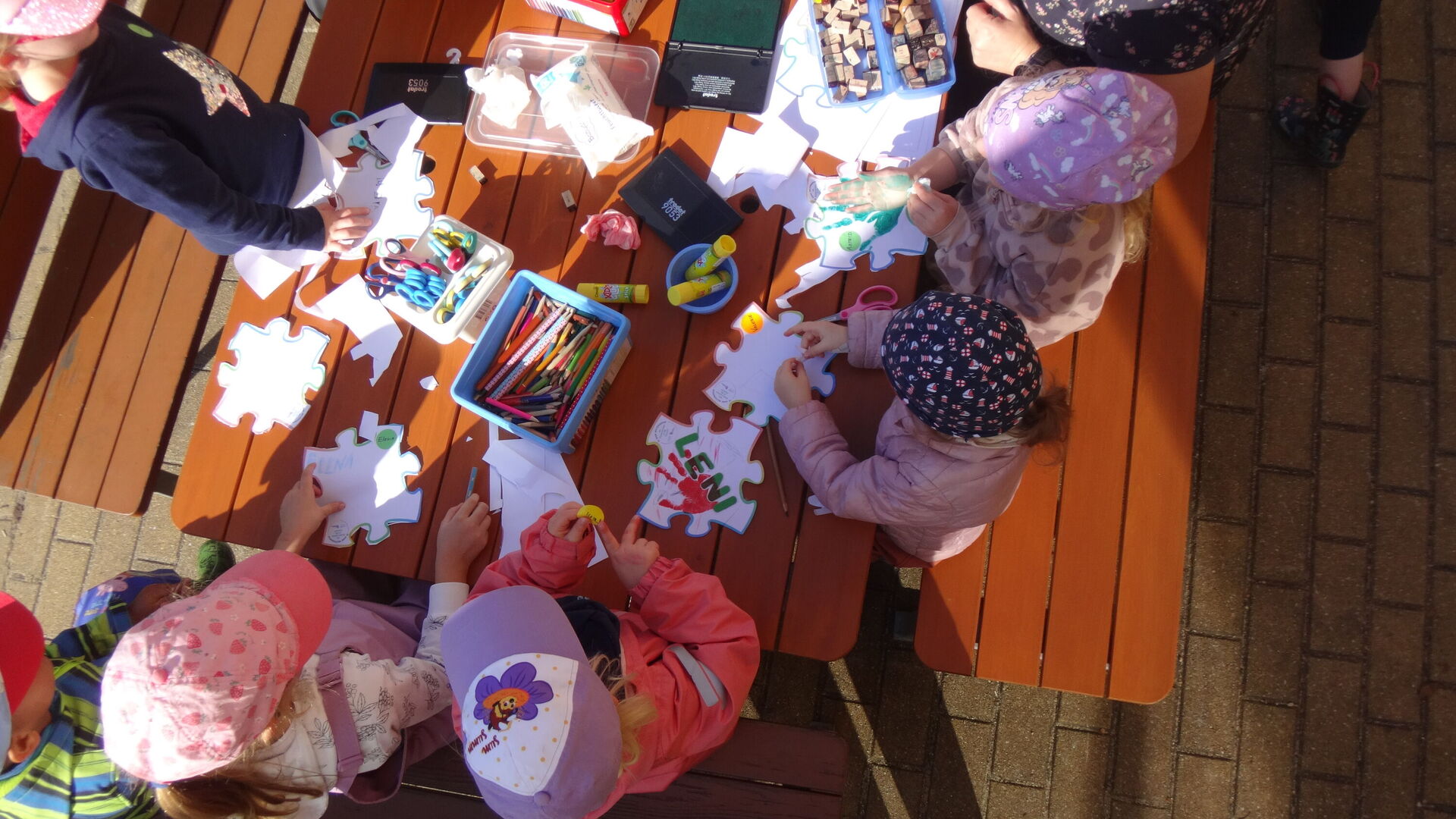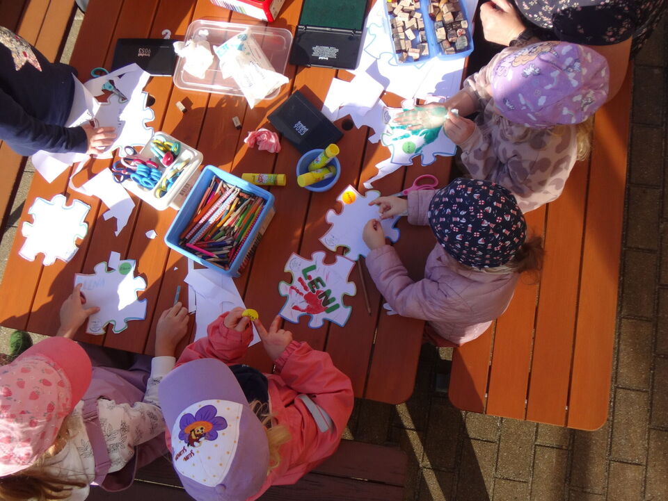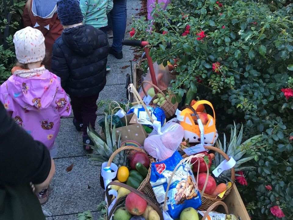 Zu Beginn des Monats waren wir unterwegs zu unserem Waldtag. Das Wetter verwöhnte uns und wir genossen die Wärme, das Wasser im Bach und den Schatten der Bäume. Als nächstes wählten wir unseren Kinderrat. Gemeinsam mit den Erzieherinnen überlegen wir, was wir unternehmen wollen und welche Themen gerade für uns spannend sind. Beim Treffen mit unseren Freunden aus Rumburk drehte sich alles um unsere Namen - passend zum Weltkindertag und dem "Recht auf Identität". Am Ende des Monats September zogen wir mit unseren Erntegaben zur Kirche und feierten dort unser Erntedankfest. Ein voller Monat mit viel Grund zum Danken. Erntedank - Dank-ernte.