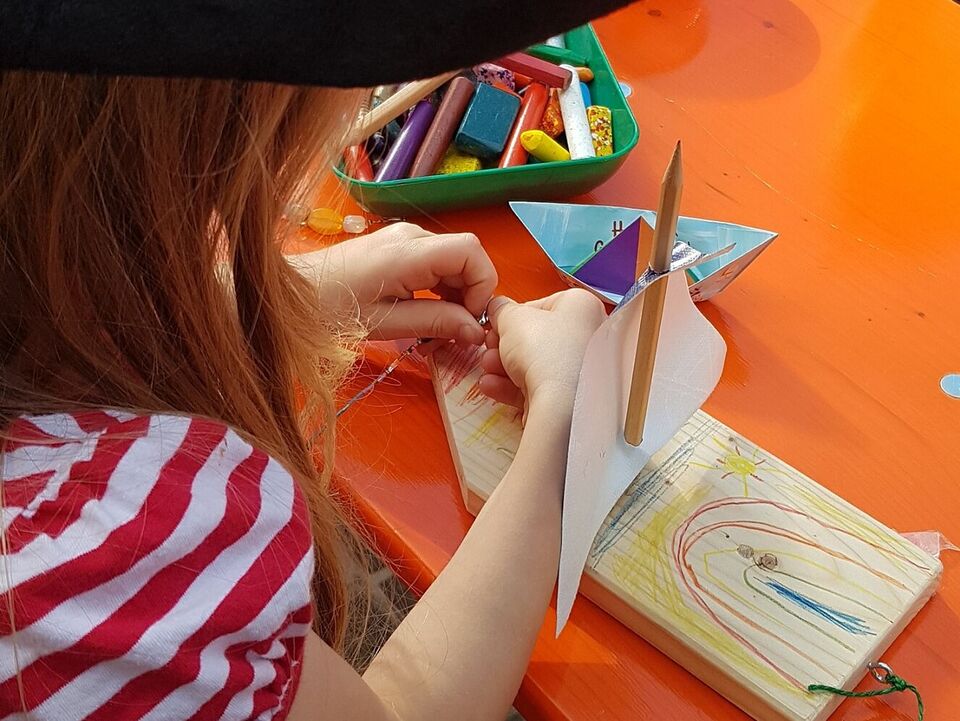 Am Nachmittag waren auch die Eltern eingeladen, ihre nun schon so groß gewordenen Kinder zum Geländespiel rund ums Kinderhaus Ankerplatz zu begleiten. Unterwegs erwartete die Kinder an den verschiedenen Stationen kleine Aufgaben, die sie gemeinsam bewältigten, um Schätze zu erhalten. Schnell errieten die Kinder, was aus den Einzelteilen werden sollte – ein Boot!