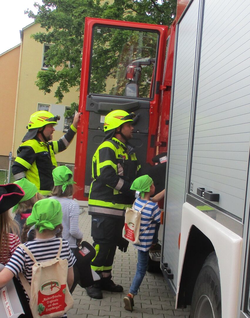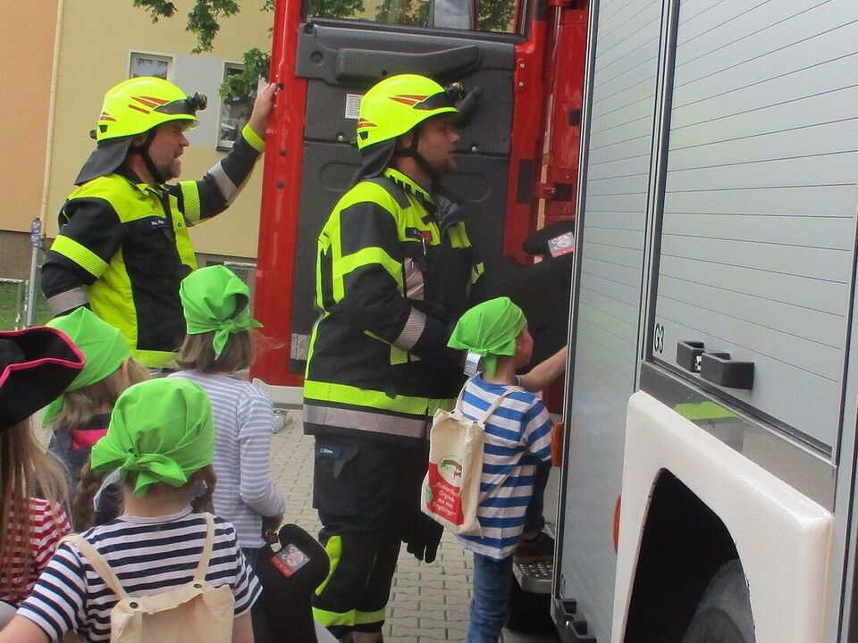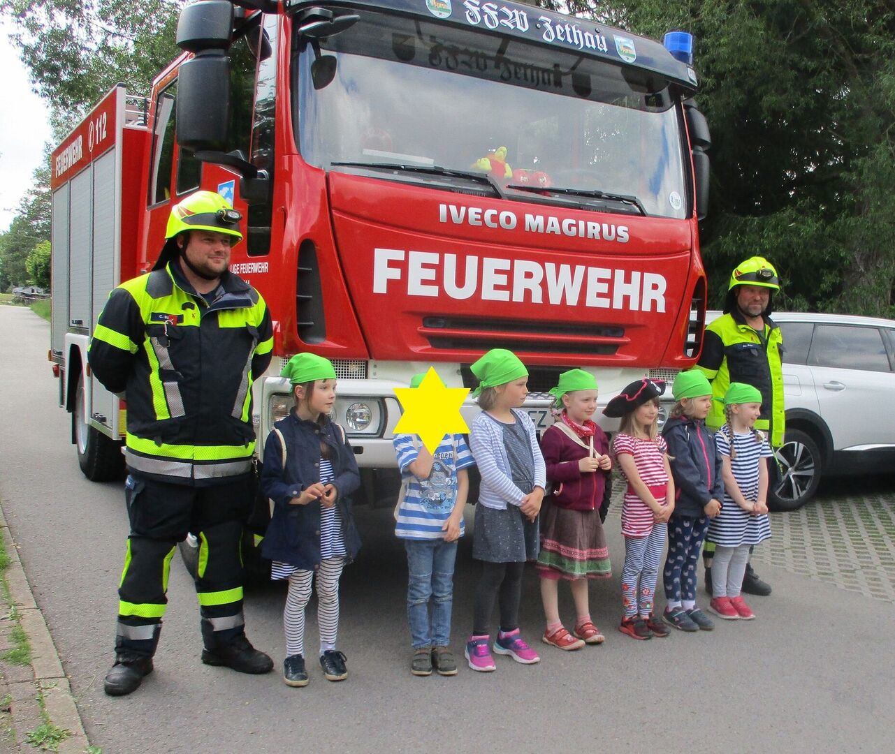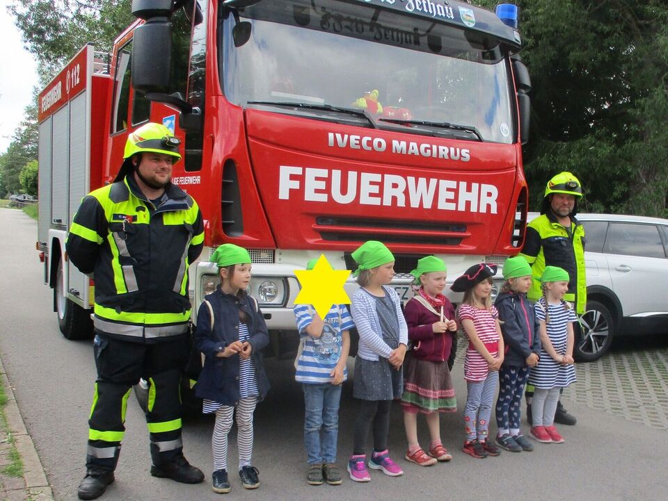 Mit Tatütata fuhr die Freiwillige Feuerwehr Zethau die Schulanfänger zurück ins Kinderhaus Ankerplatz. Manche saßen zum ersten Mal in einem Feuerwehrauto – das war ein tolles Erlebnis!