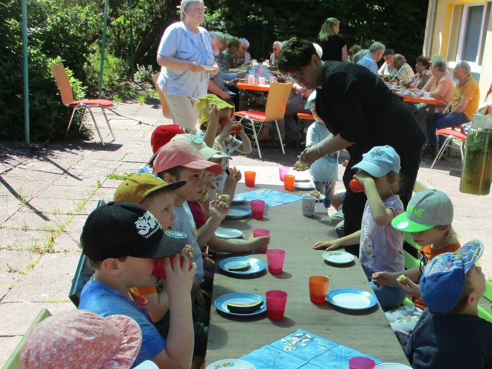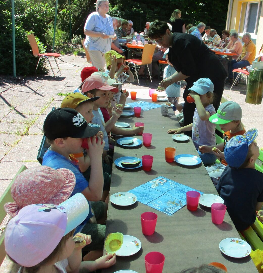 Auf der Terrasse hatten unsere Gäste Platz genommen: Der Seniorenkreis der Grünen Schule und so manche Großeltern und Eltern der Kinder. Die Kinder erfreuten alle mit ein paar fröhlichen Liedern und natürlich wurde dann auch gemeinsam gesungen.