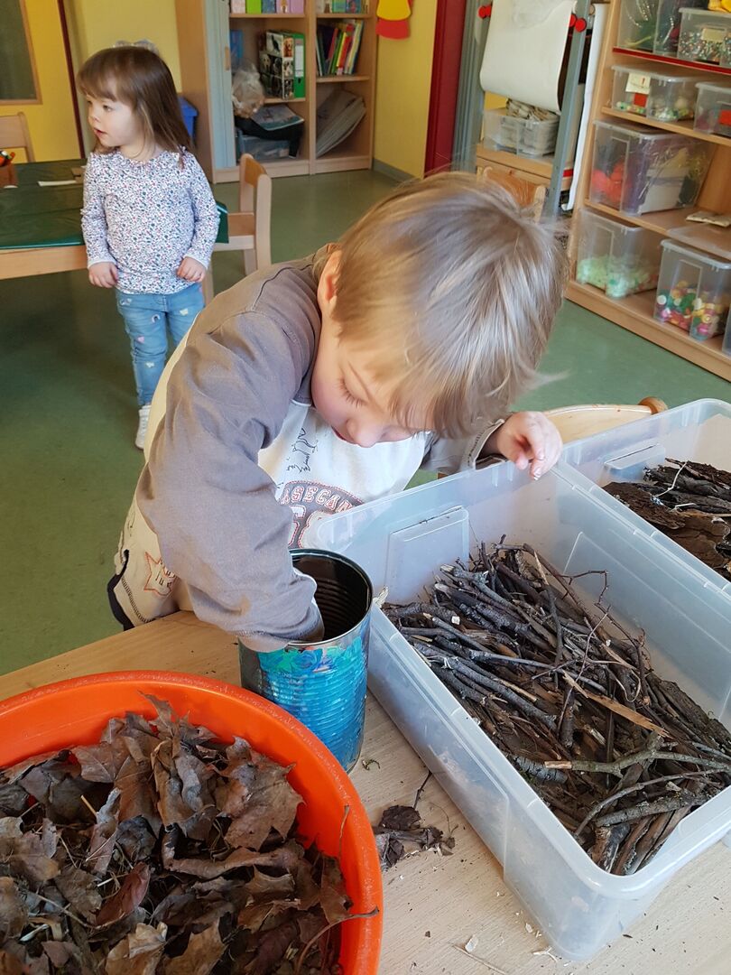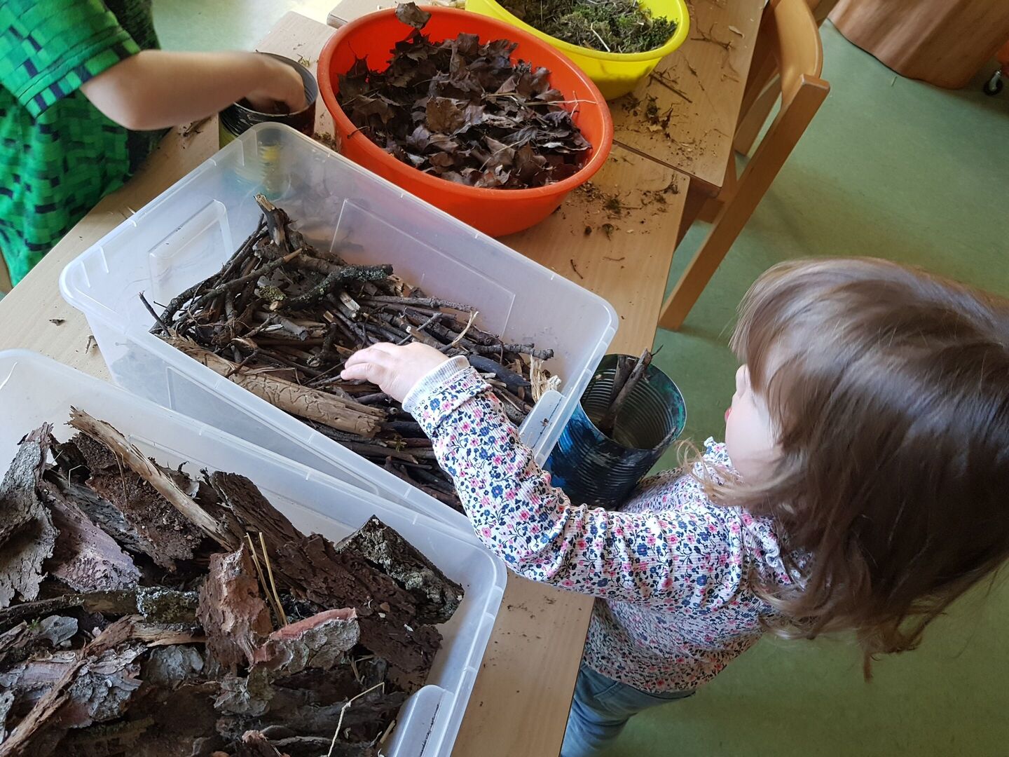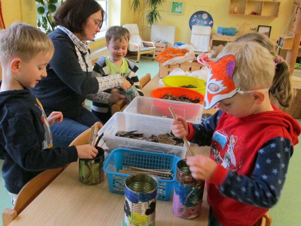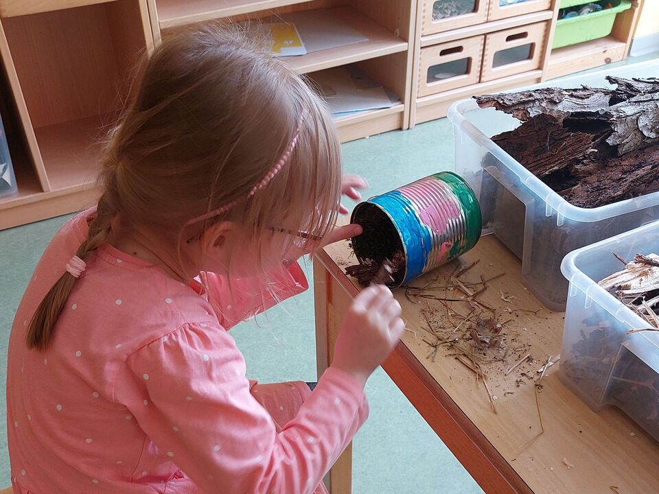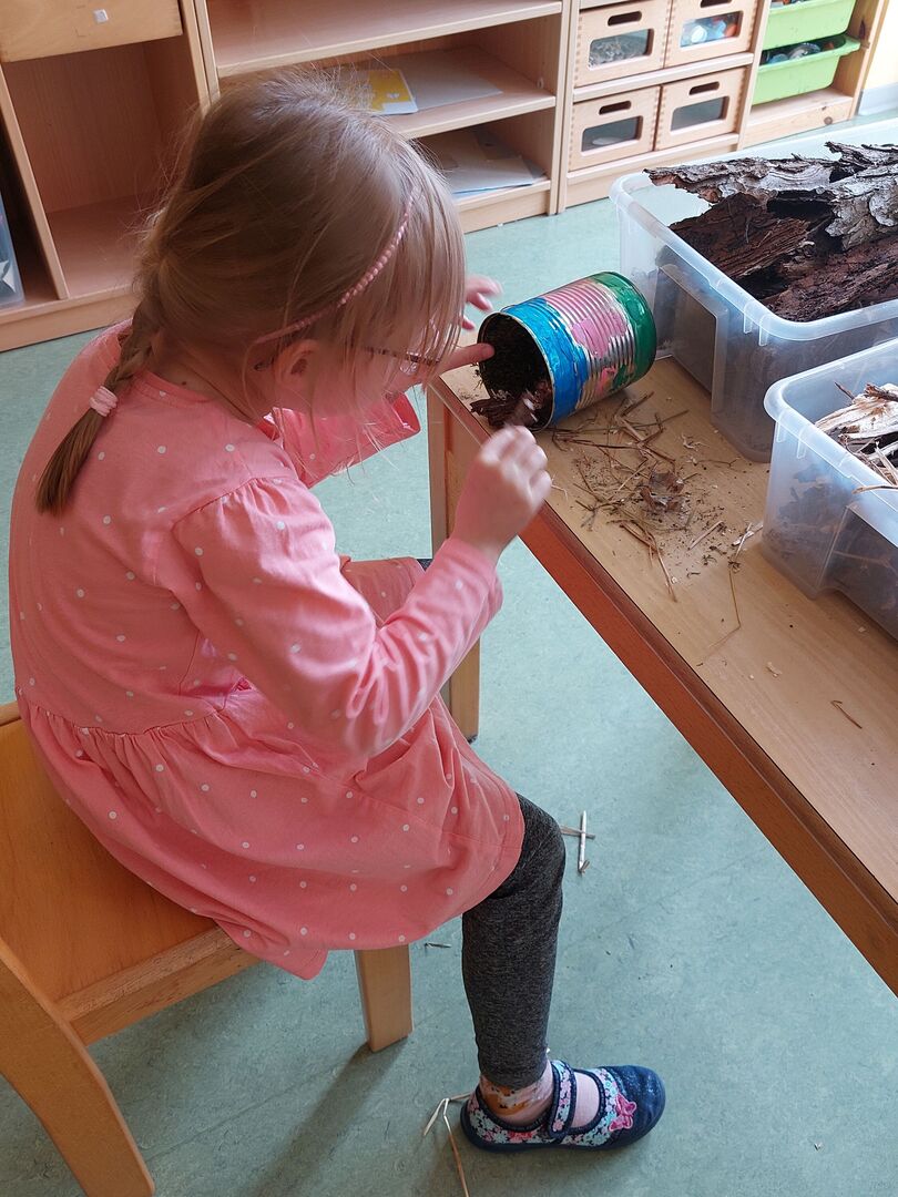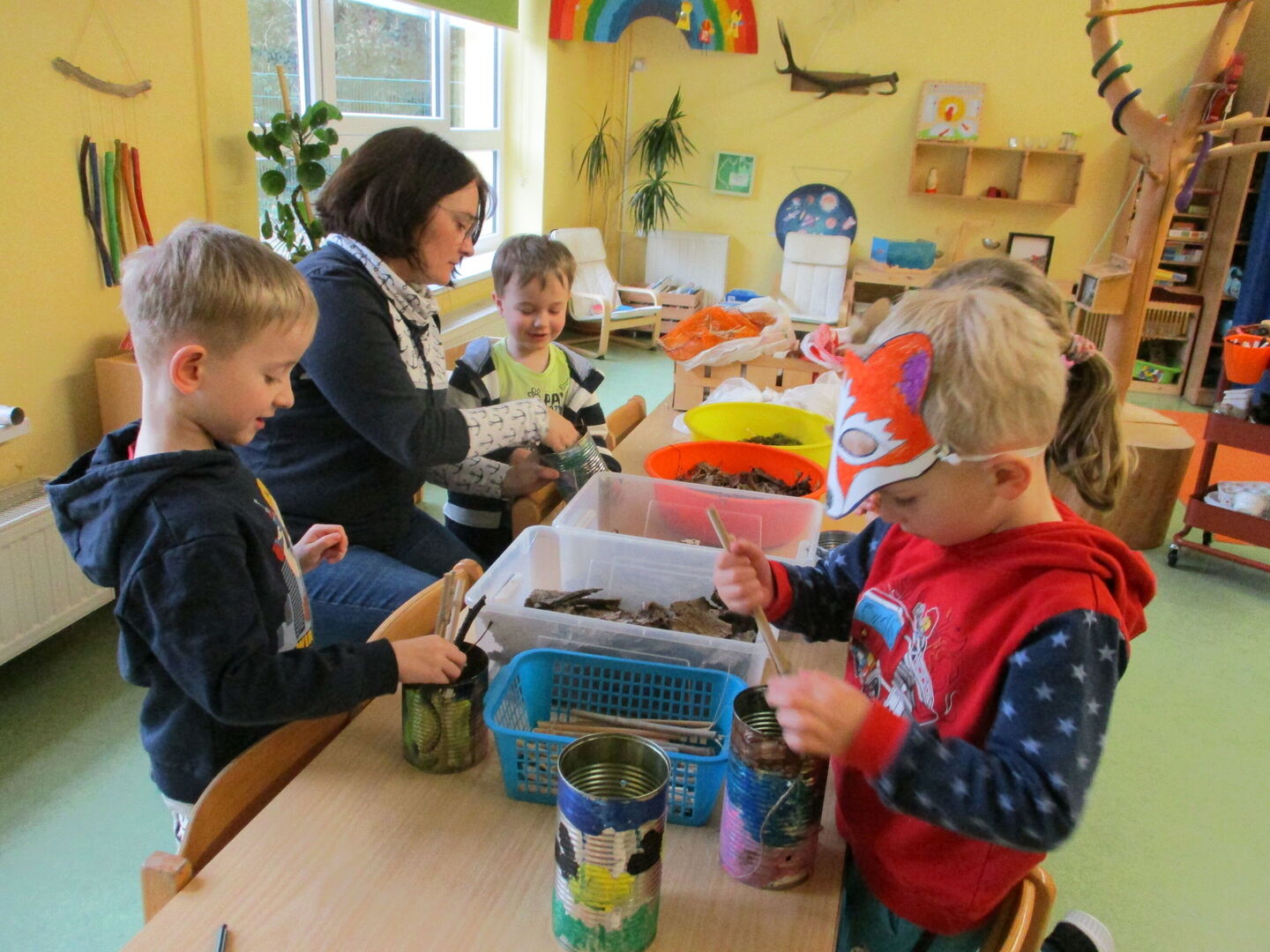 Die spielzeugfreie Zeit nutzen wir dann, um aus alten Blechdosen farbenfrohe Insektenhotels zu gestalten. Wir füllten sie mit gesammelten Naturmaterialien. Jedes Kind fand zuhause einen Platz für sein Insektenhotel und natürlich hängen nun auch welche in unserem Garten. Wir beobachten interessiert, was passiert. Werden Insekten einziehen? Welche werden es sein? Oh, da war ein Vogel an dem Hotel, was wird der suchen?