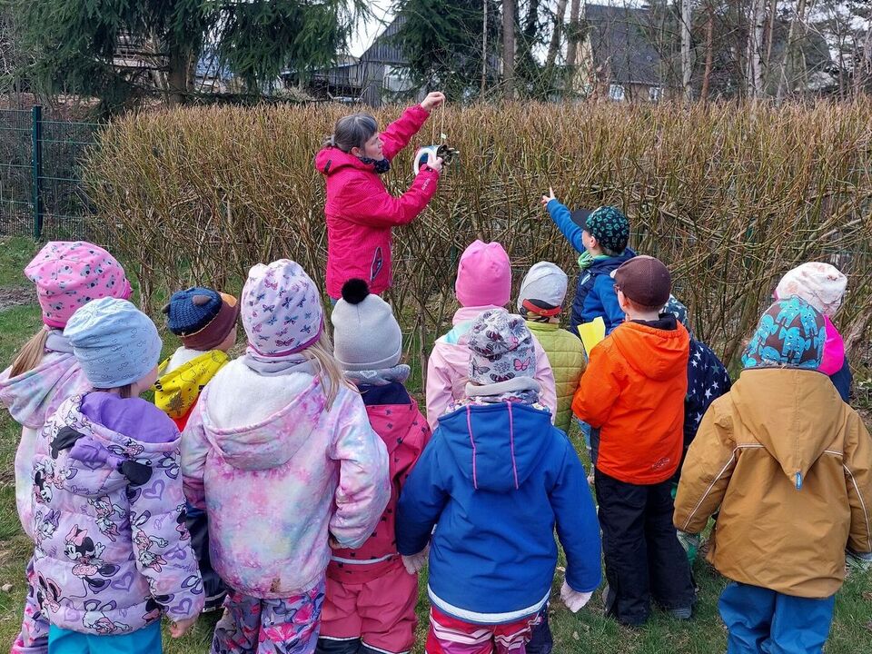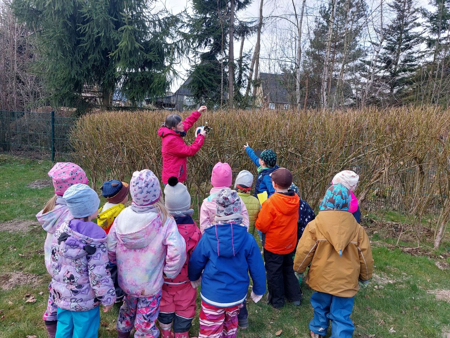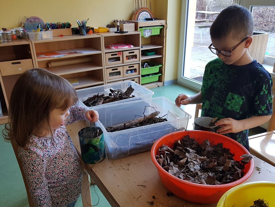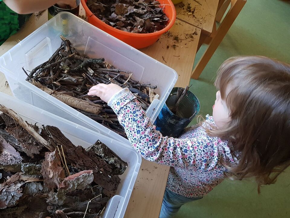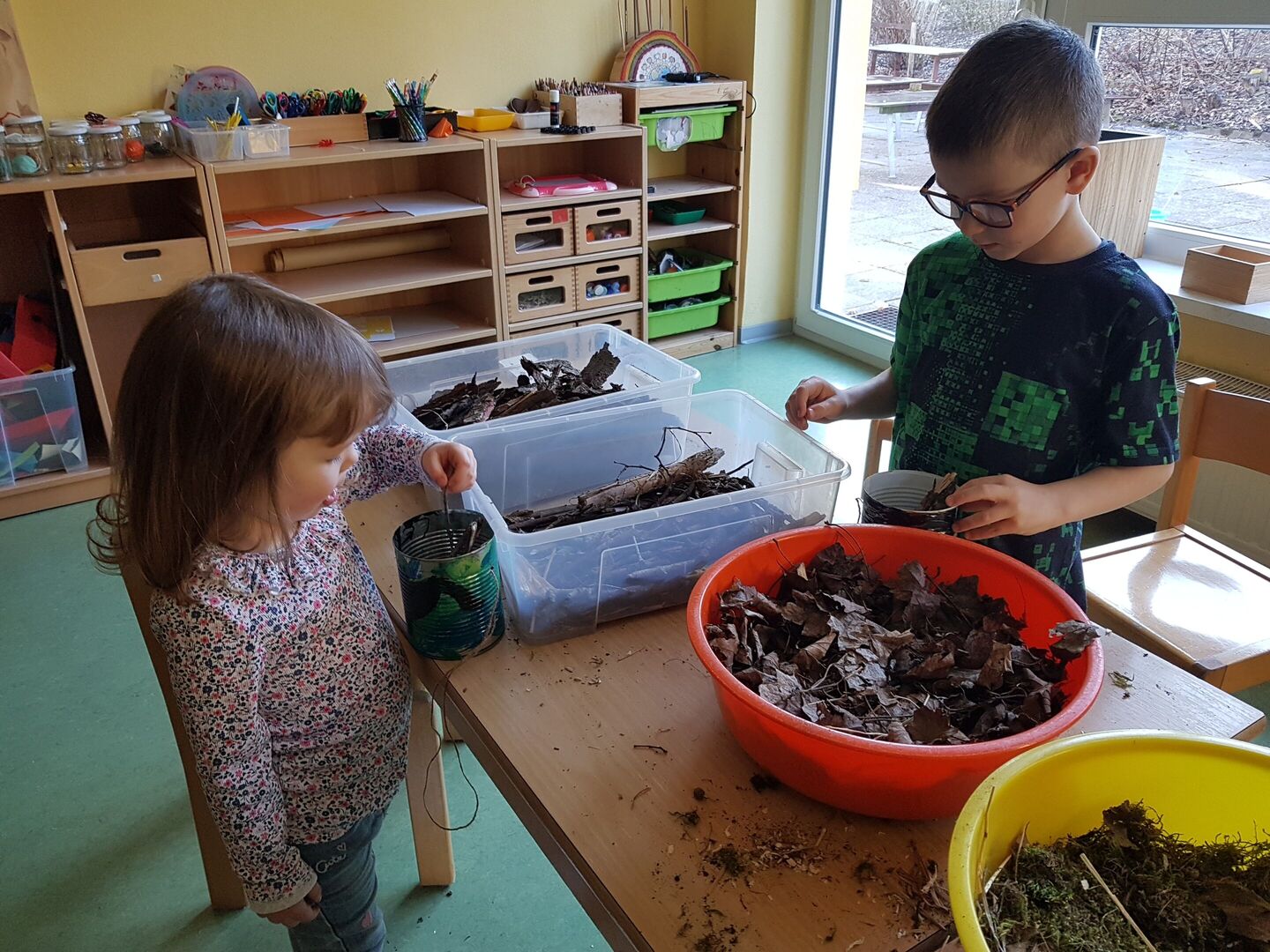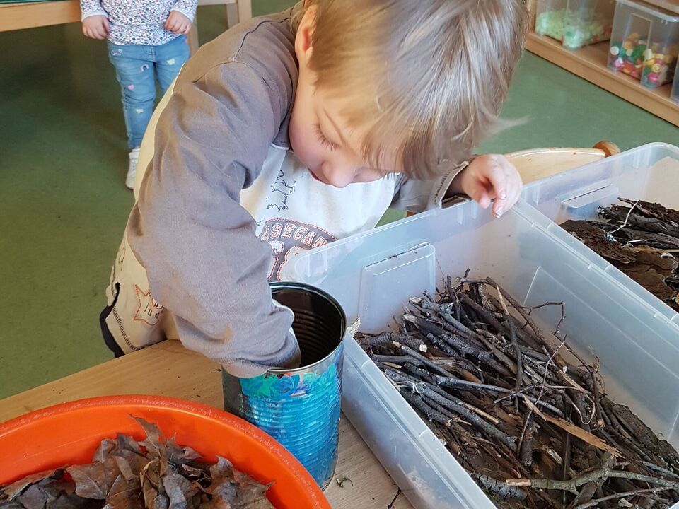 Die spielzeugfreie Zeit nutzen wir dann, um aus alten Blechdosen farbenfrohe Insektenhotels zu gestalten. Wir füllten sie mit gesammelten Naturmaterialien. Jedes Kind fand zuhause einen Platz für sein Insektenhotel und natürlich hängen nun auch welche in unserem Garten. Wir beobachten interessiert, was passiert. Werden Insekten einziehen? Welche werden es sein? Oh, da war ein Vogel an dem Hotel, was wird der suchen?
