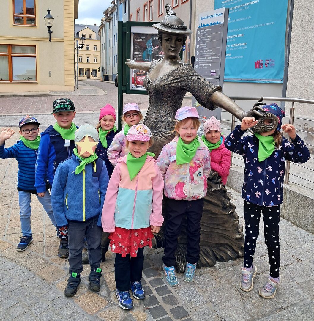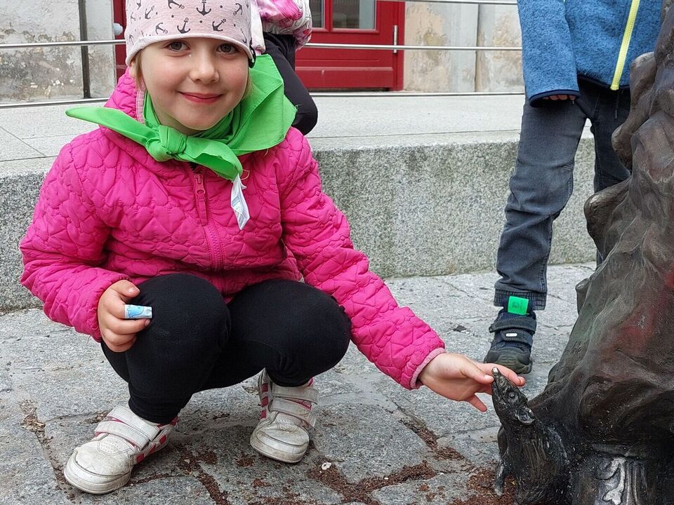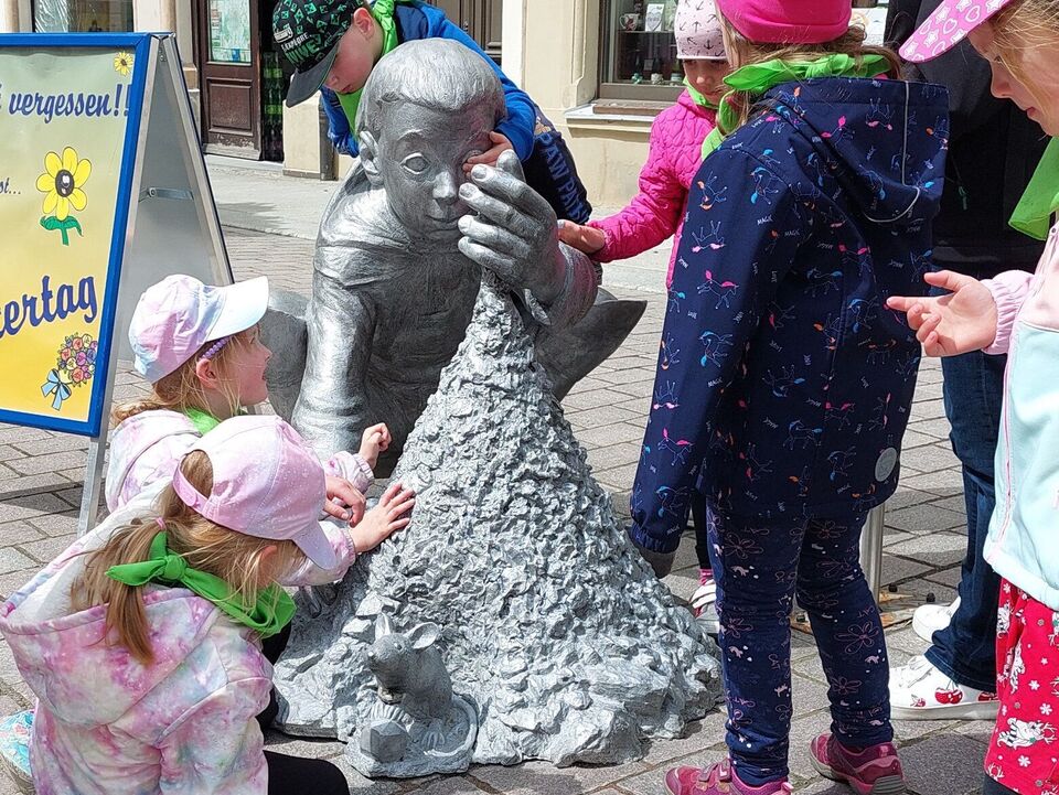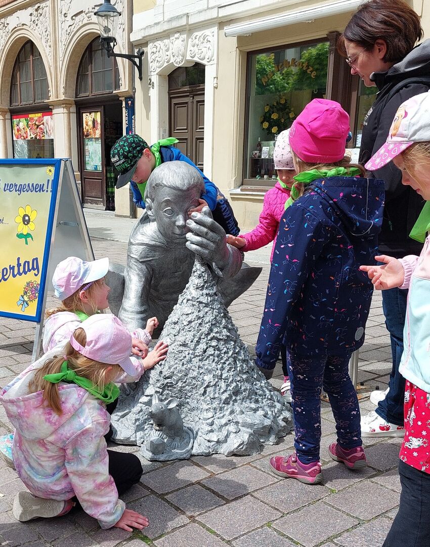 Auf dem Rückweg zum Bahnhof entdeckten wir silberne Figuren, die uns etwas über die Geschichte der Stadt Freiberg verrieten. Die Kinder bestaunten und erkundeten diese genau. Natürlich musste auf dem Löwen auch einmal Platz genommen werden!
