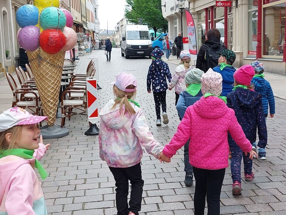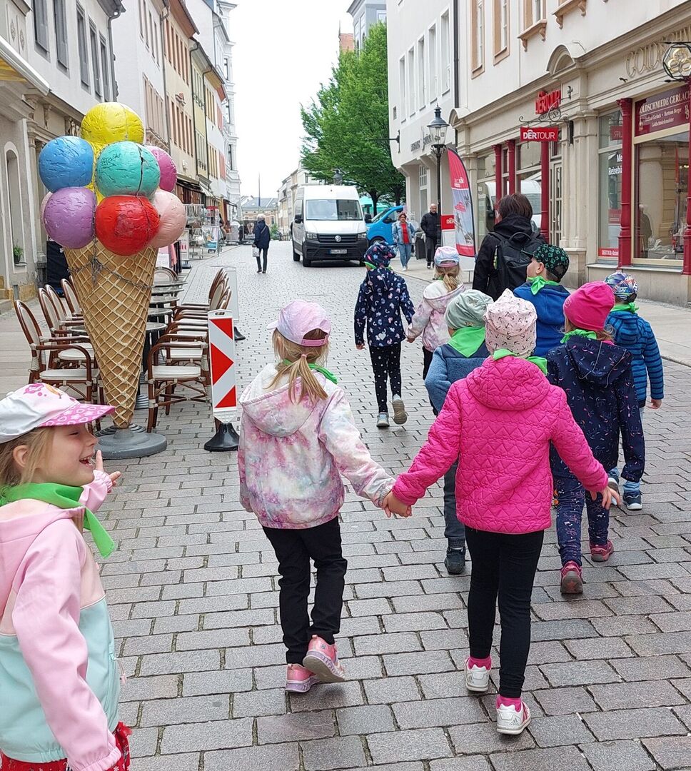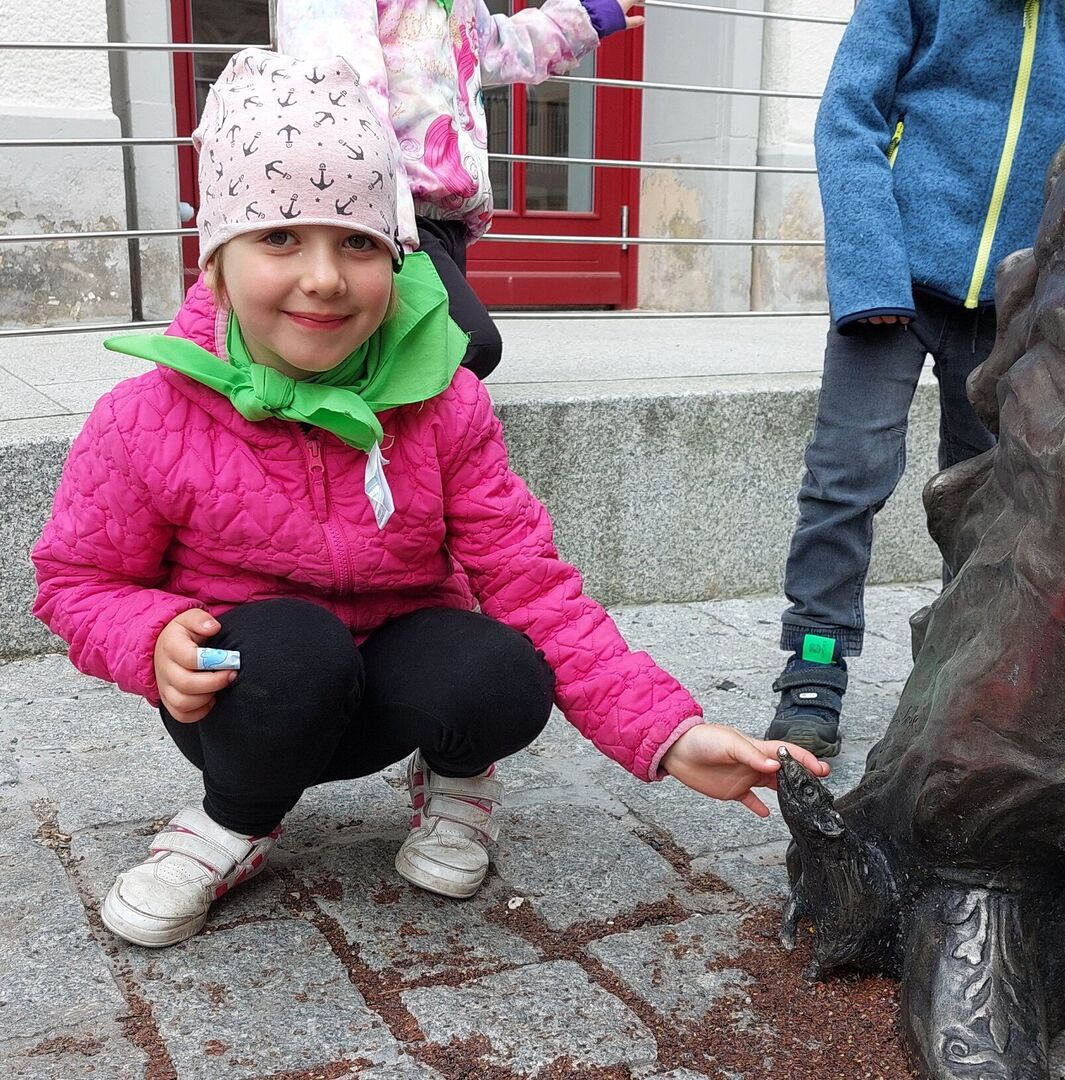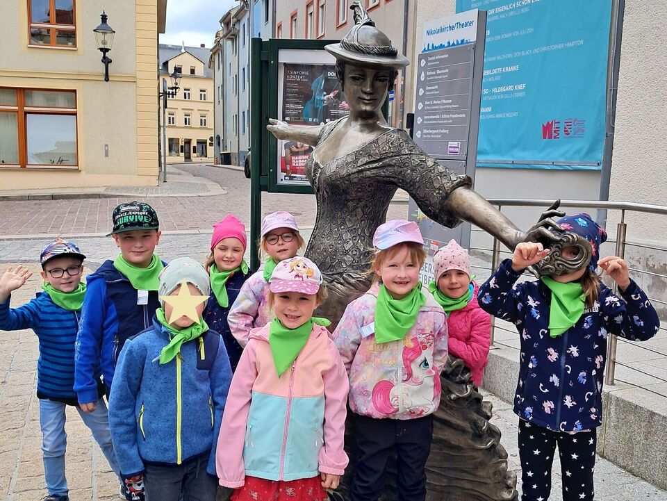 Auf dem Rückweg zum Bahnhof entdeckten wir silberne Figuren, die uns etwas über die Geschichte der Stadt Freiberg verrieten. Die Kinder bestaunten und erkundeten diese genau. Natürlich musste auf dem Löwen auch einmal Platz genommen werden!