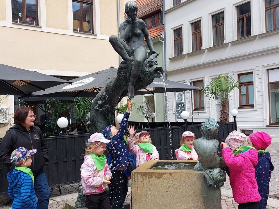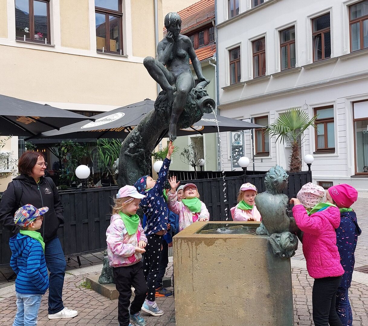 Nach dem Theater hatten alle Hunger und Bewegungsdrang. Auf dem Freiberger Obermarkt verspeisten wir unsere Bäckerbrötchen mit Bratwurst, Äpfel und Tee und nutzen den Platz zum Herumrennen und Bewegen. Das Wasserspiel war schon faszinierend und anziehend...