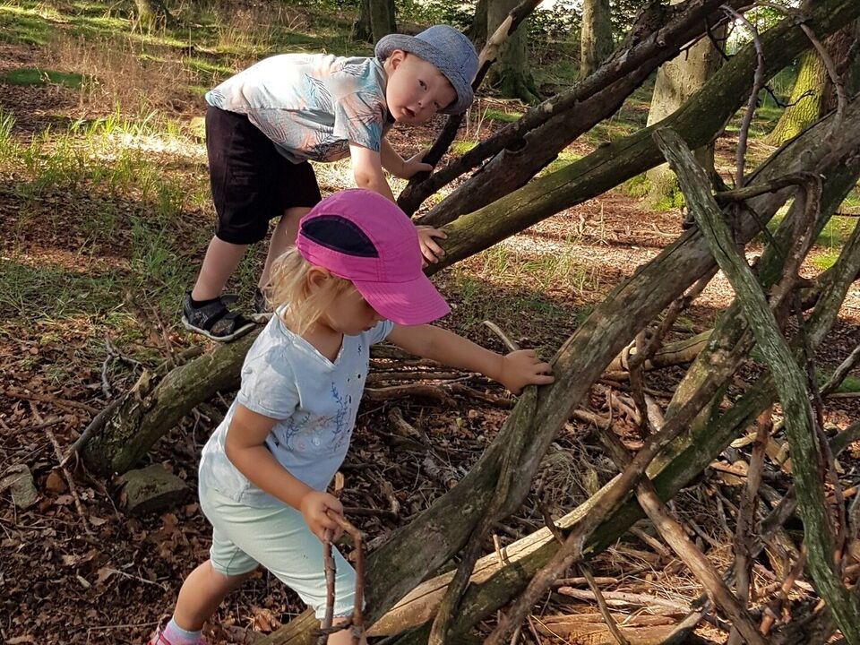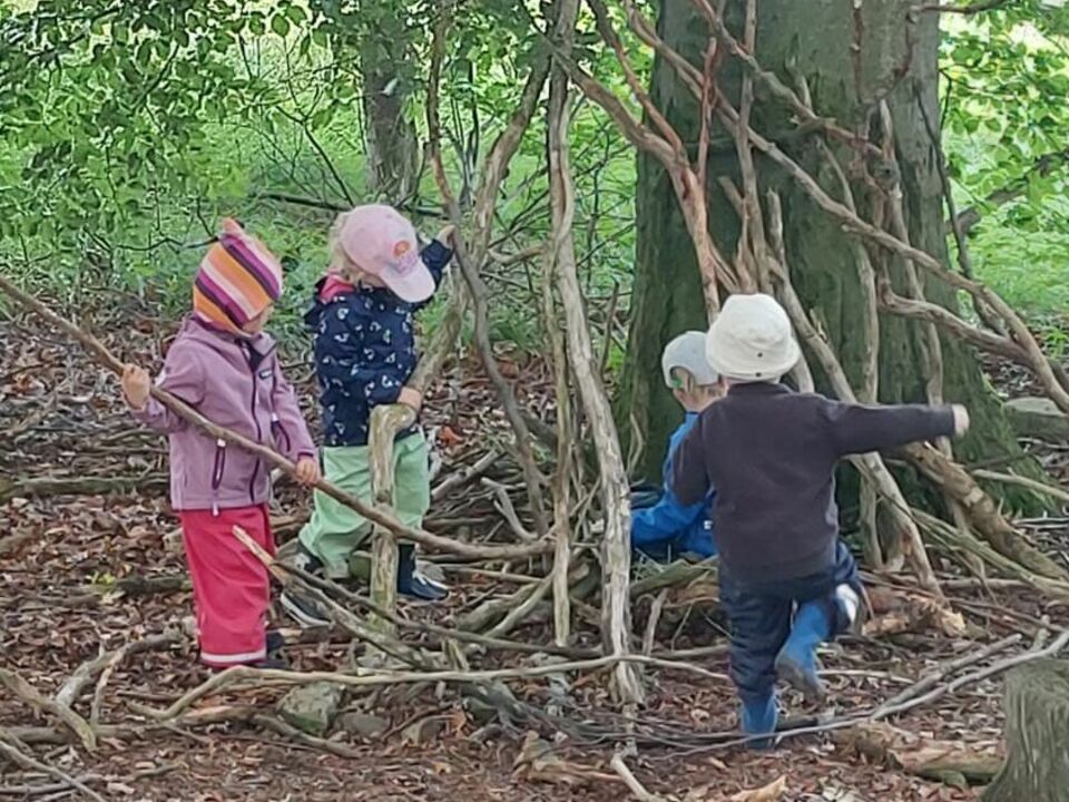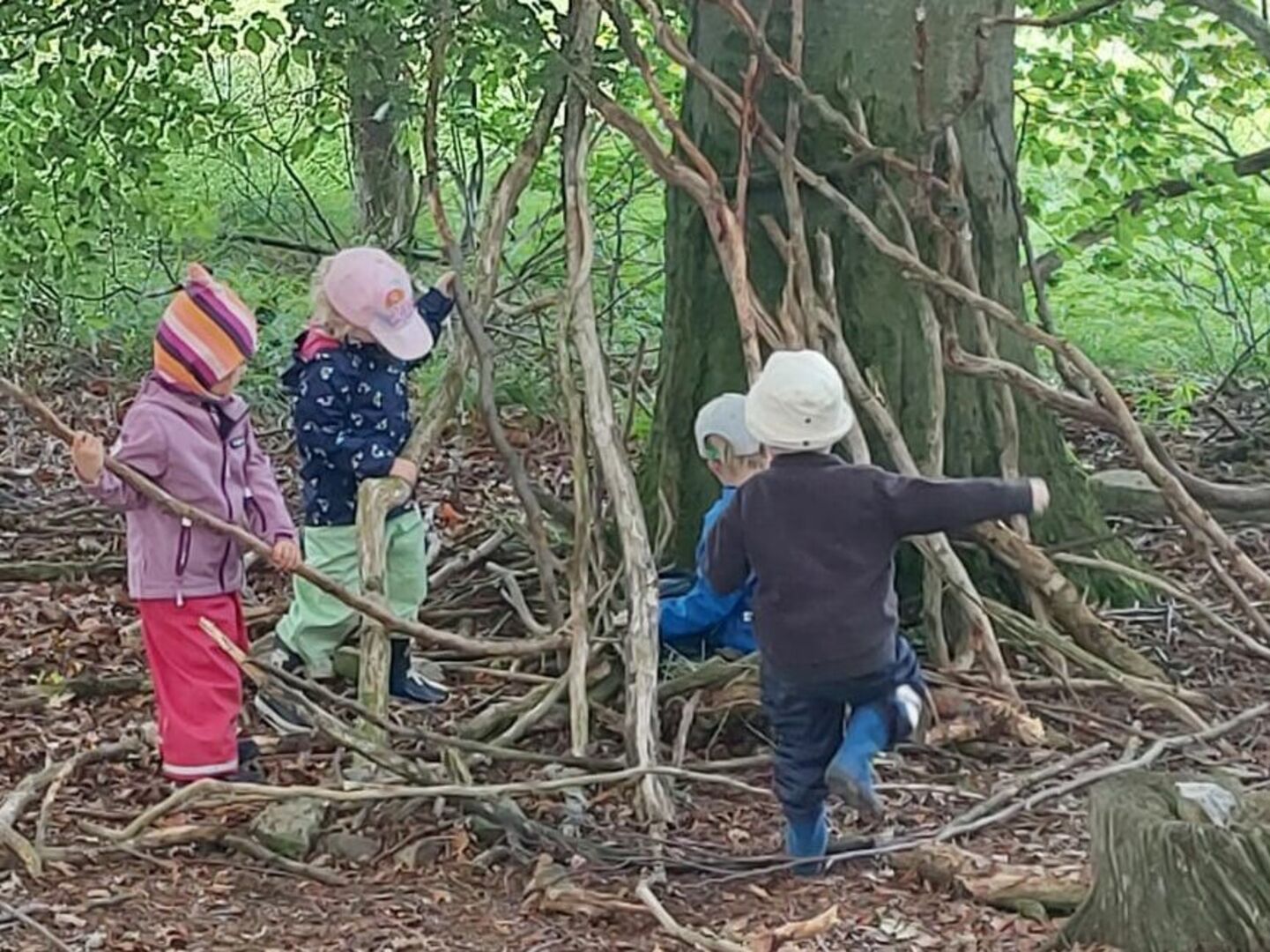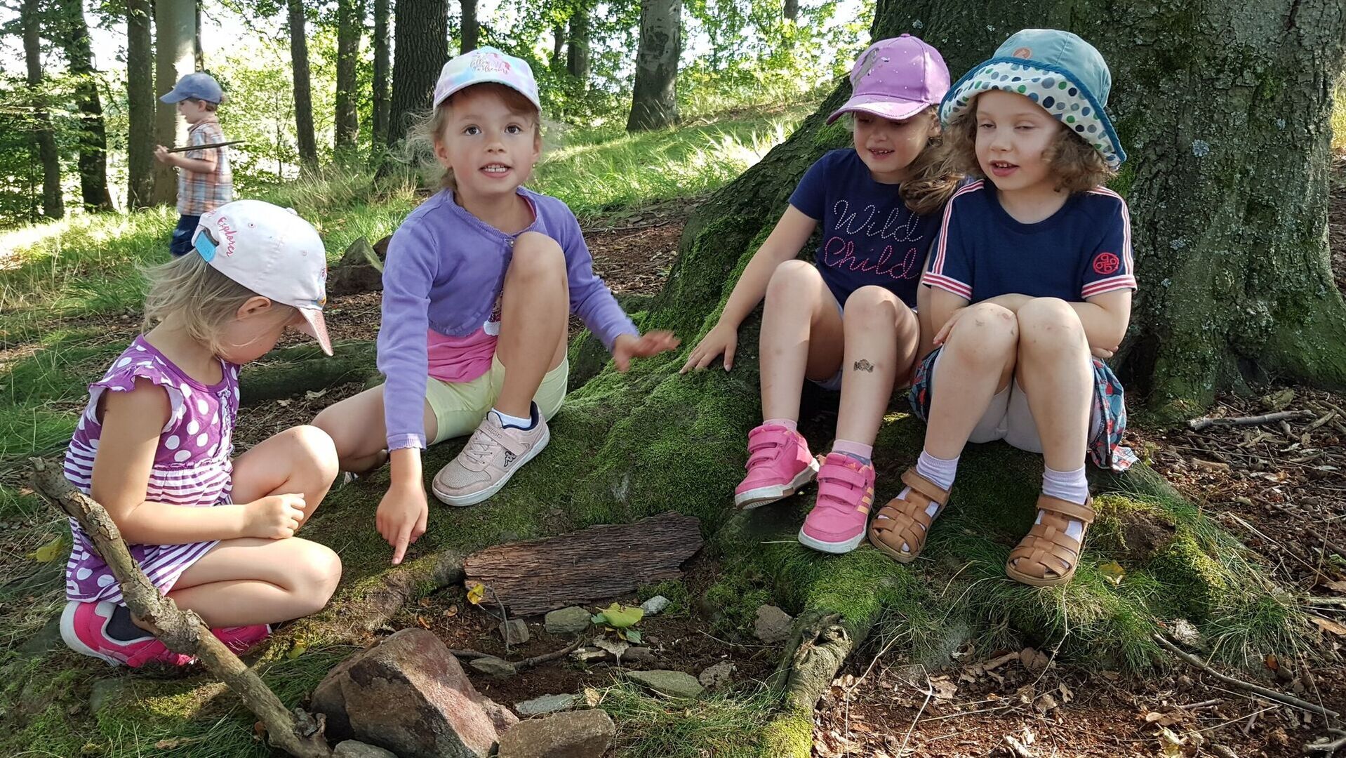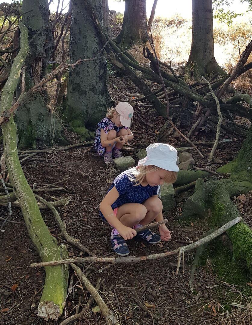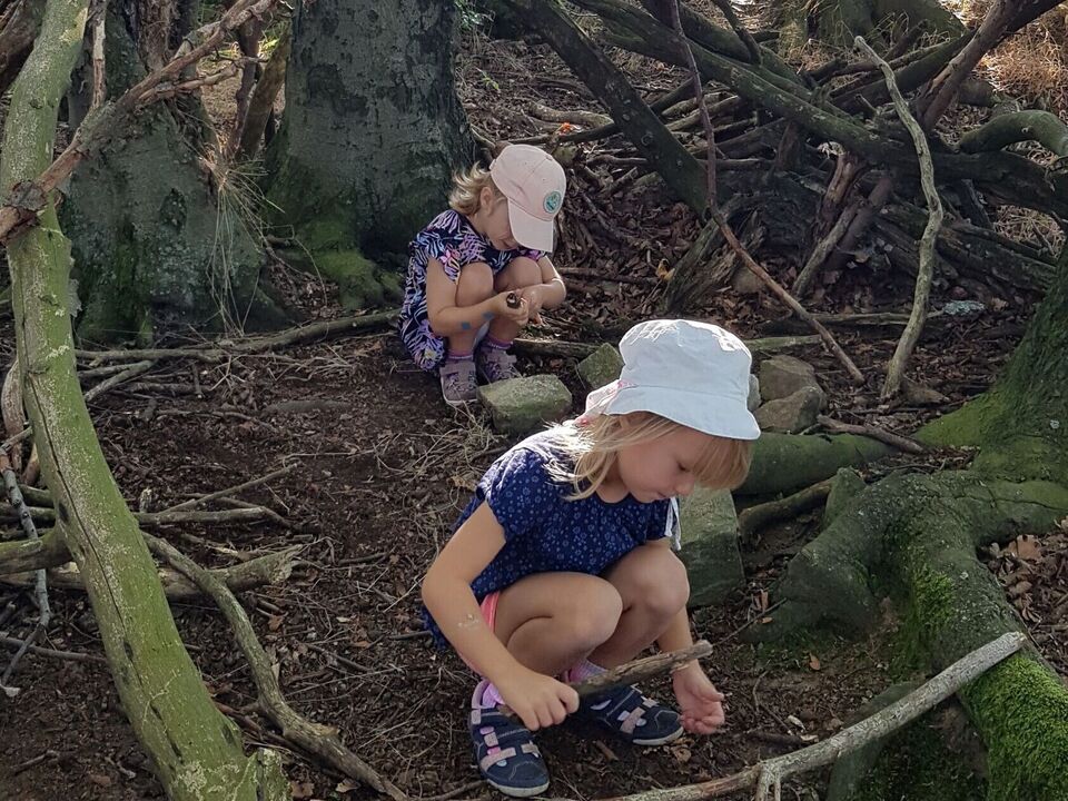 Mit Buden bauen oder Marhsmallows über dem imaginären Feuer rösten versinken die Kinder im kreativen Rollenspiel im Wald.