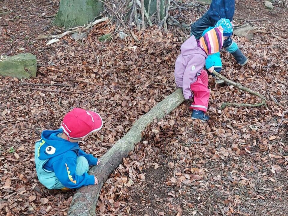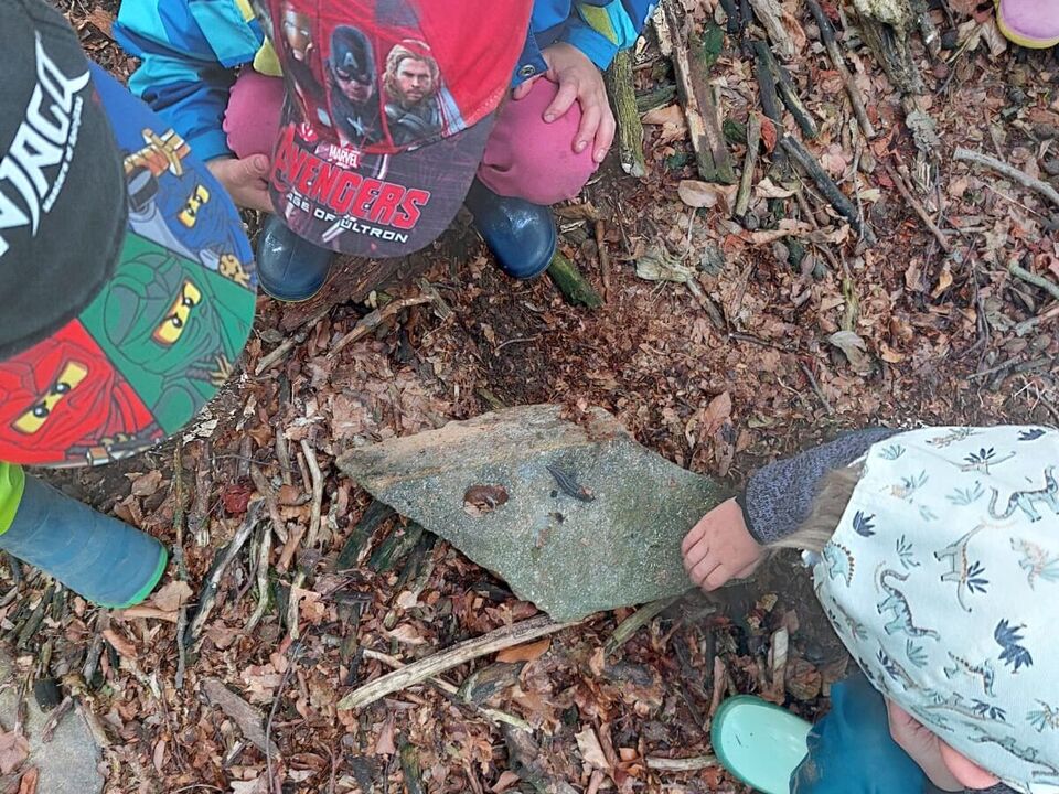 Die Kinder genießen es, im Schatten der Bäume zu spielen, Buden zu bauen und in verschiedene Rollen zu schlüpfen. So zogen die Wölfe schon durch unseren Spielewald und wurden von tapferen Waldbewohnern vertrieben. Auch Marshmallows (Blätter) wurden am Spieß über dem Feuer (Holzstapel) geröstet. Daneben entstehen kreative Kunstwerke aus Naturmaterialien.