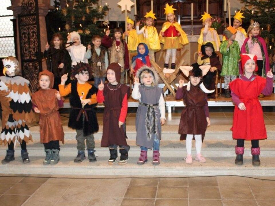 Nach den Herbstferien geht es los, dass die Kinder die ihnen bereits vom Vorjahr bekannten Lieder hören und alsbald laufen sie diese singend durch die Kita. Es wird immer wieder geprobt, bis endlich jeder seine Rolle gefunden hat. Und dann wird das Stück als eine der letzten weihnachtlichen Veranstaltungen für Eltern, Geschwister und Großeltern in der Lutherkirche Radebeul dargeboten. Die Pfarrerin Frau Funke ist immer dabei und gibt uns im Anschluss den Segen fürs neue Jahr.