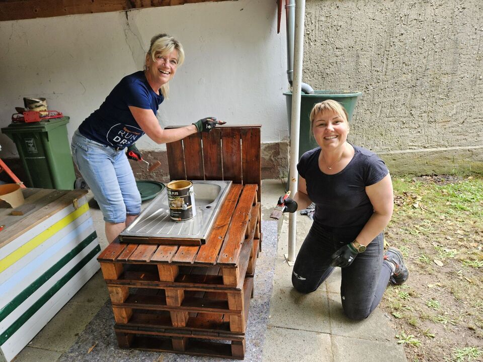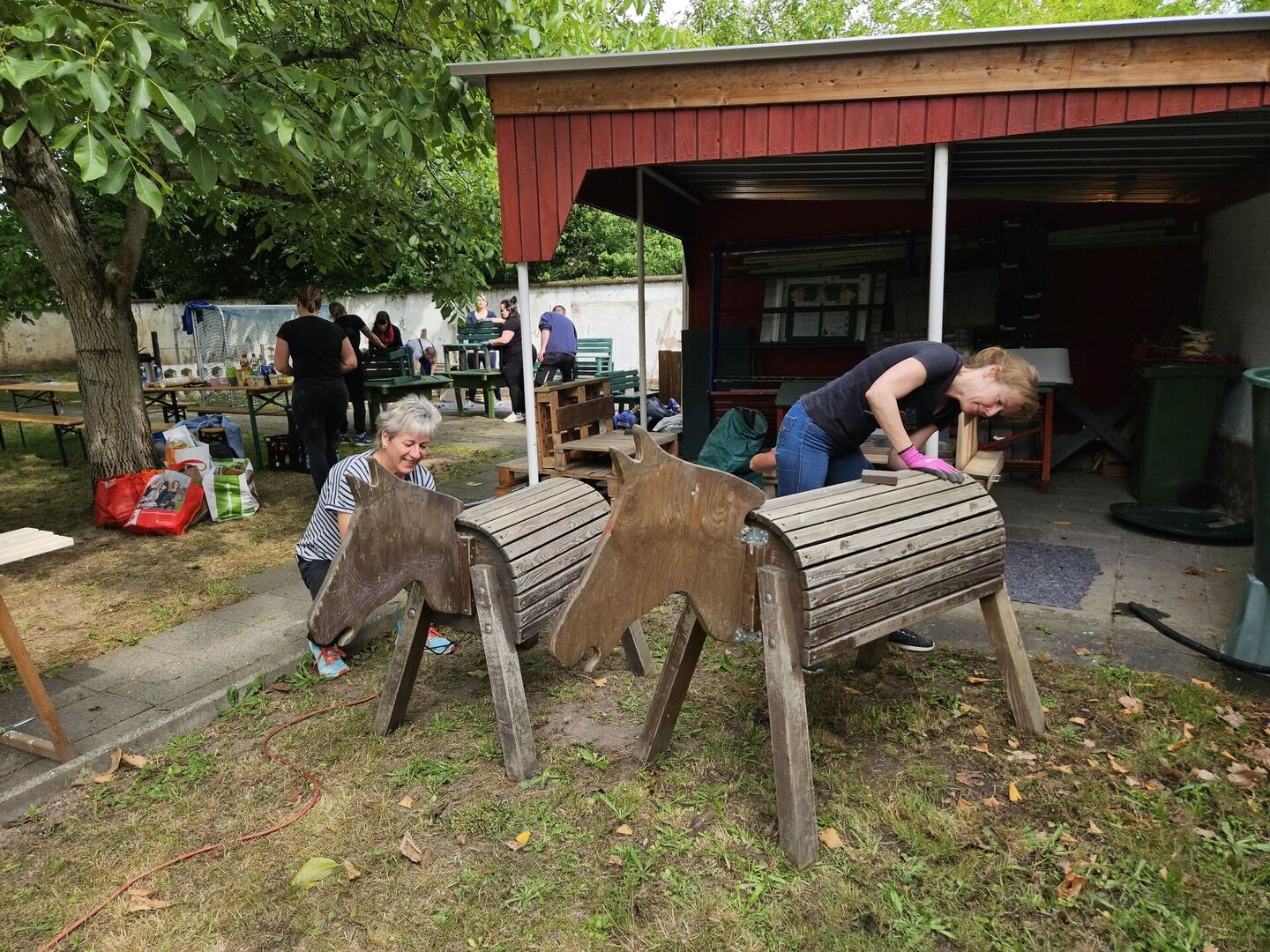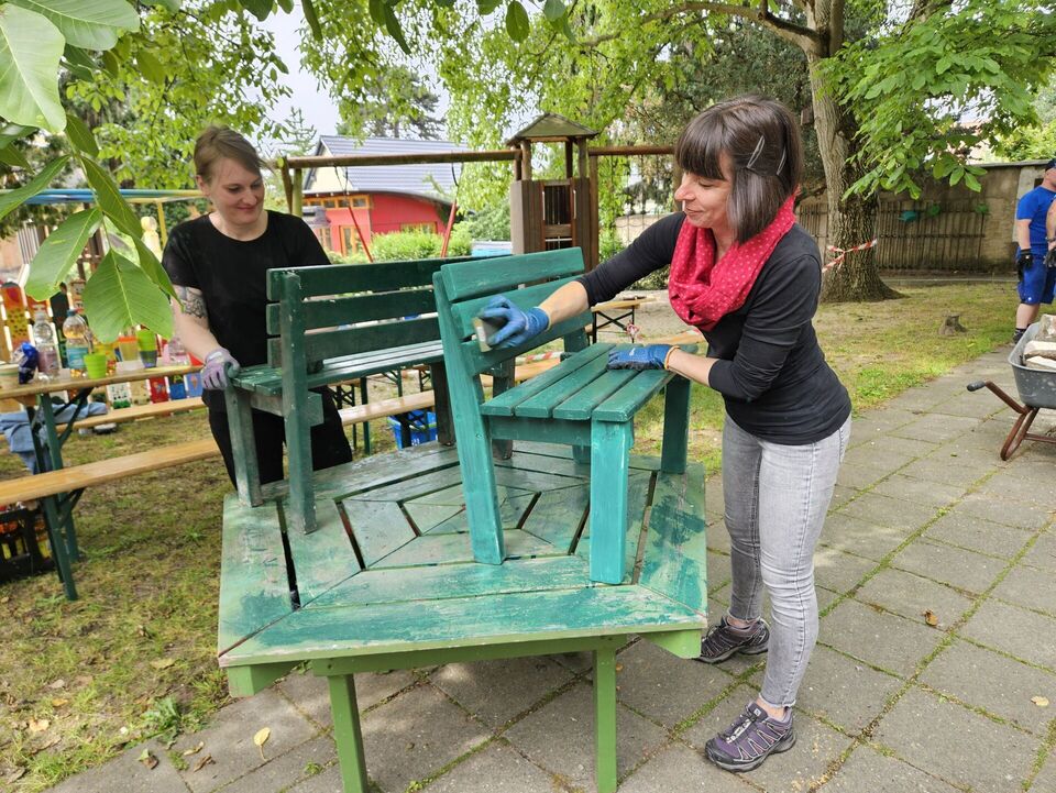 Auch die Spielgeräte der Kita erhielten eine Frischekur: Die beiden beliebten Holzpferde wurden abgeschliffen und neu gestrichen, ebenso wie die große Matschküche. Besonders gefreut haben wir uns darüber, dass die TAG-Mitarbeitenden zusätzlich gesammelte Küchenutensilien wie Töpfe, Pfannen und Kellen mitbrachten, mit denen die Kinder nun in ihrer neuen Matschküche spielen können.