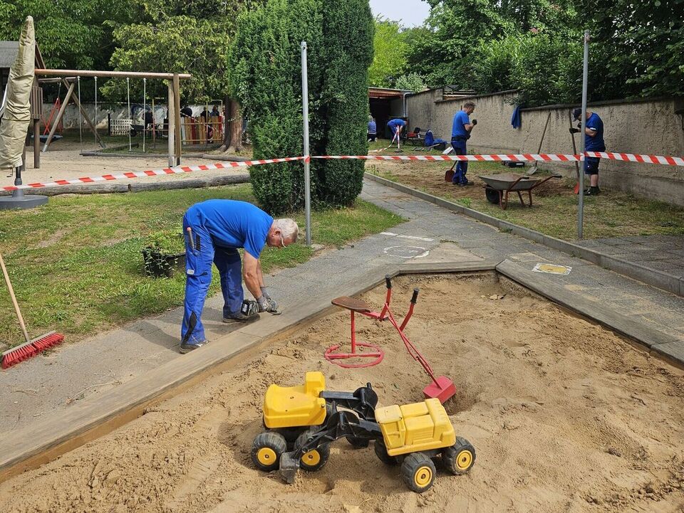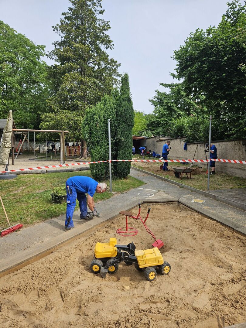 In der vergangenen Woche durften wir ein starkes Team der TAG Immobilien AG in unserer Kita in der Waldstraße begrüßen. Insgesamt 16 engagierte Mitarbeitende, darunter viele aus der Buchhaltung und fünf hervorragend ausgestattete Hausmeister, kamen für einen gemeinsamen Arbeitseinsatz vorbei. Von 9:00 bis 15:30 Uhr wurde mit vollem Einsatz und großem Engagement angepackt, gebuddelt, geschliffen, gestrichen, gebohrt und Unkraut entfernt.