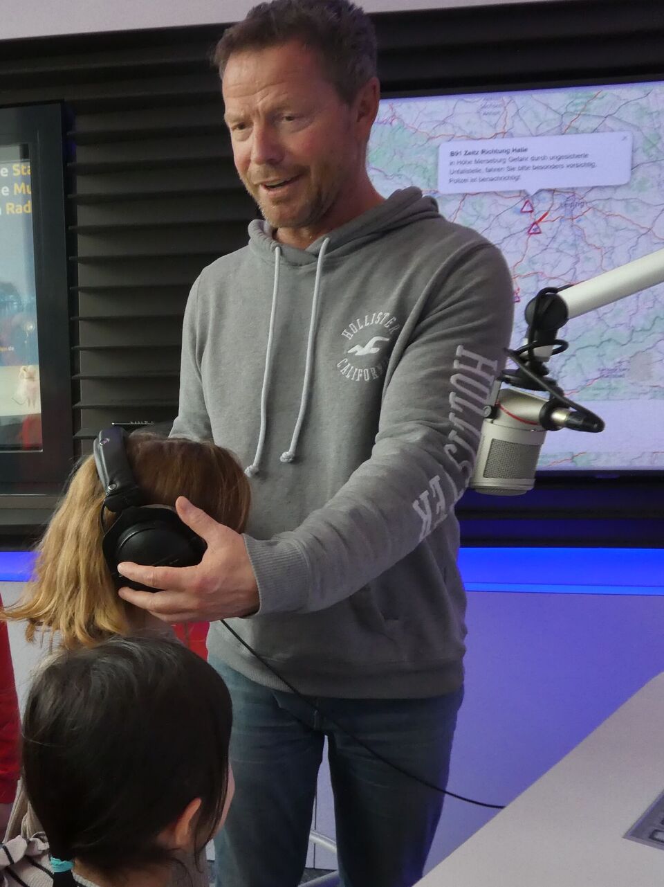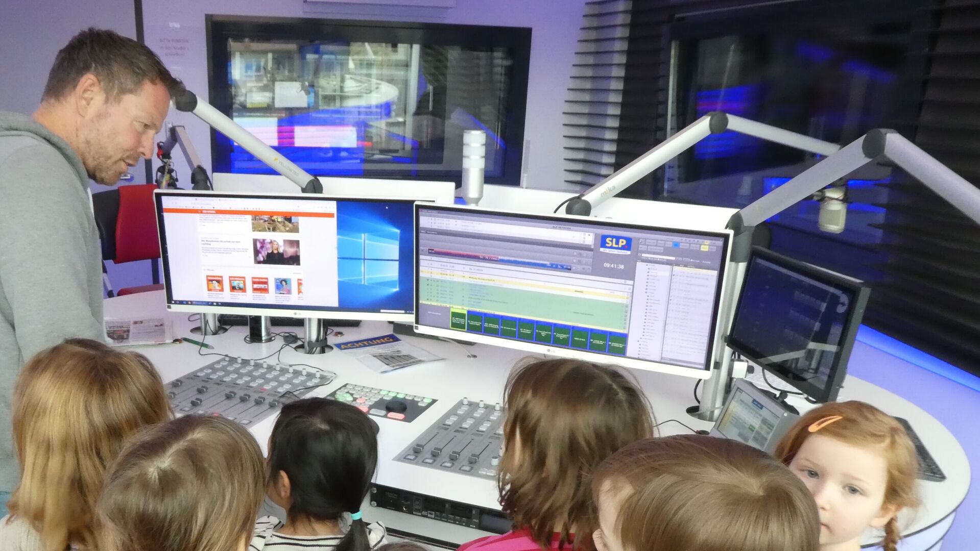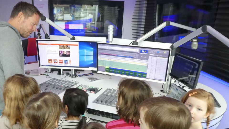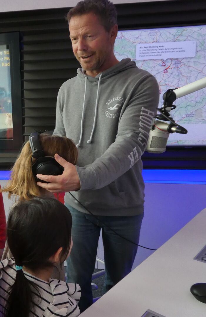 Zuerst einmal hieß es leise sein und schleichen wie bei den Indianern, denn hier werden die Sendungen fürs Radio aufgenommen. Und wie viele Räume es hier gibt! Auf leisen Sohlen schlichen wir also gleich mal in die Sendung von André, der uns seinen Arbeitsplatz als Moderator zeigte. Auf keinen Fall einen bunten Knopf drücken, denn schon hört man uns im Radio, das sieht man auch an dem roten Licht, was dann brennt. Da staunten wir nicht schlecht, als André selbst den Kopf drückte und wir ganz spontan in die Sendung mit unserem "Guten Morgen" landeten. Ja, sowas kann ein Moderator.
