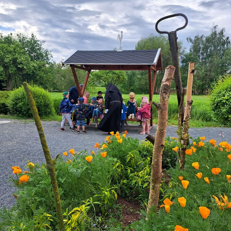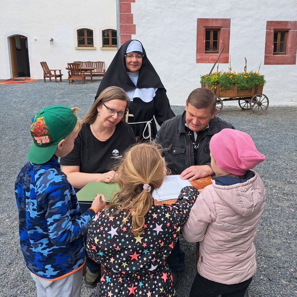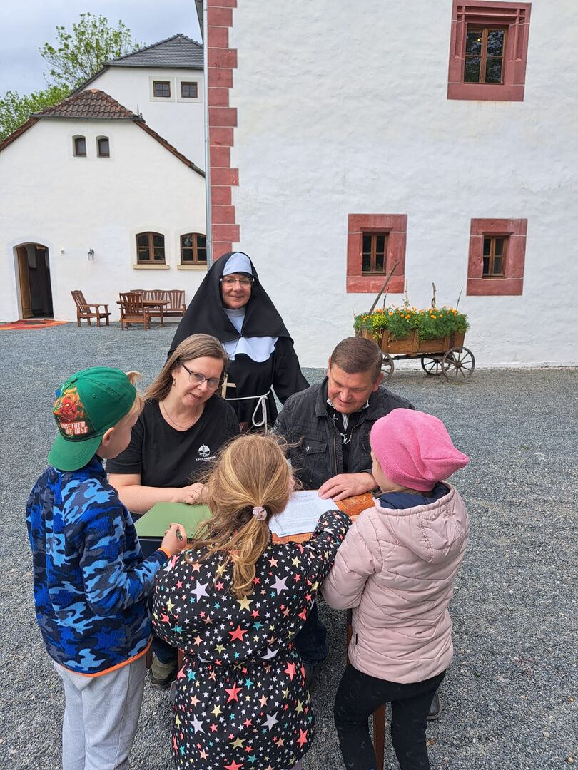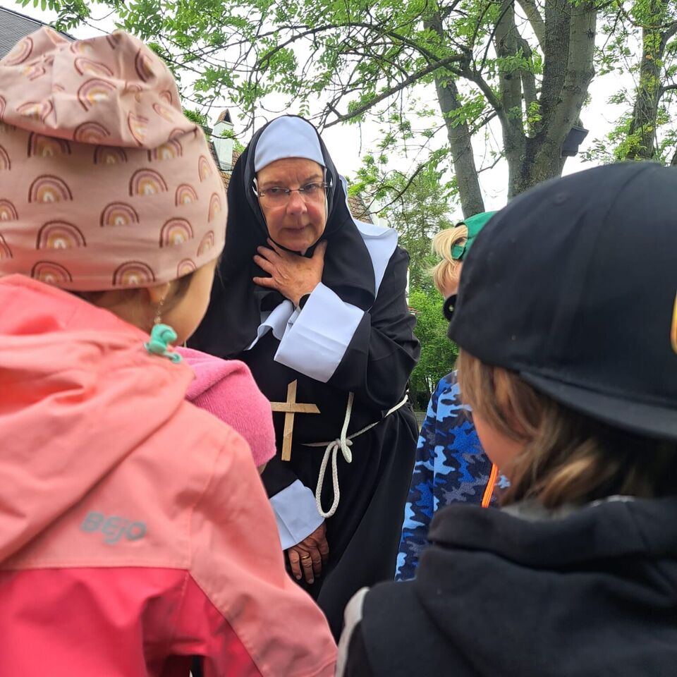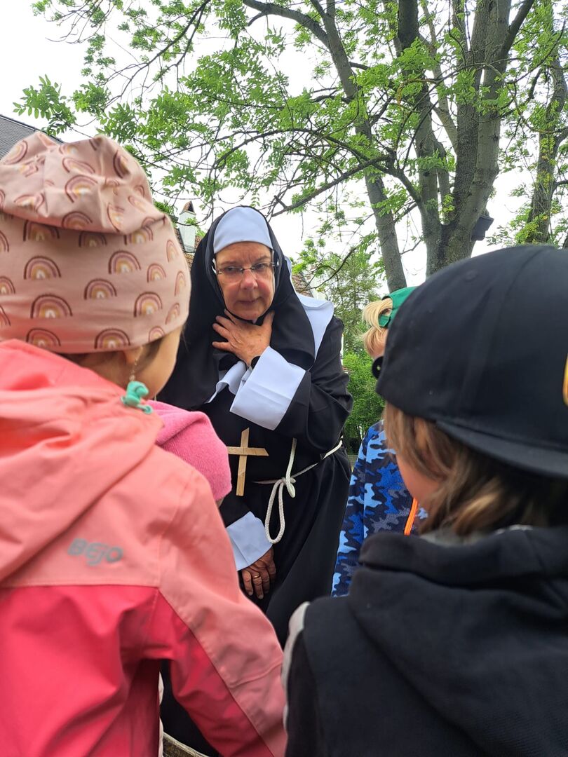 Es begann wie ein ganz normaler Wandertag, als sich die jüngeren Kinder des Blauen Bereiches unserer Kinderoase mit Bollerwagen und Rucksack auf den Weg zum Kloster machten. Dort angekommen kamen sie jedoch aus dem Staunen gar nicht mehr heraus, als sie von „Schwester Isolde“ in ihrem Ordensgewand herzlich begrüßt wurden.