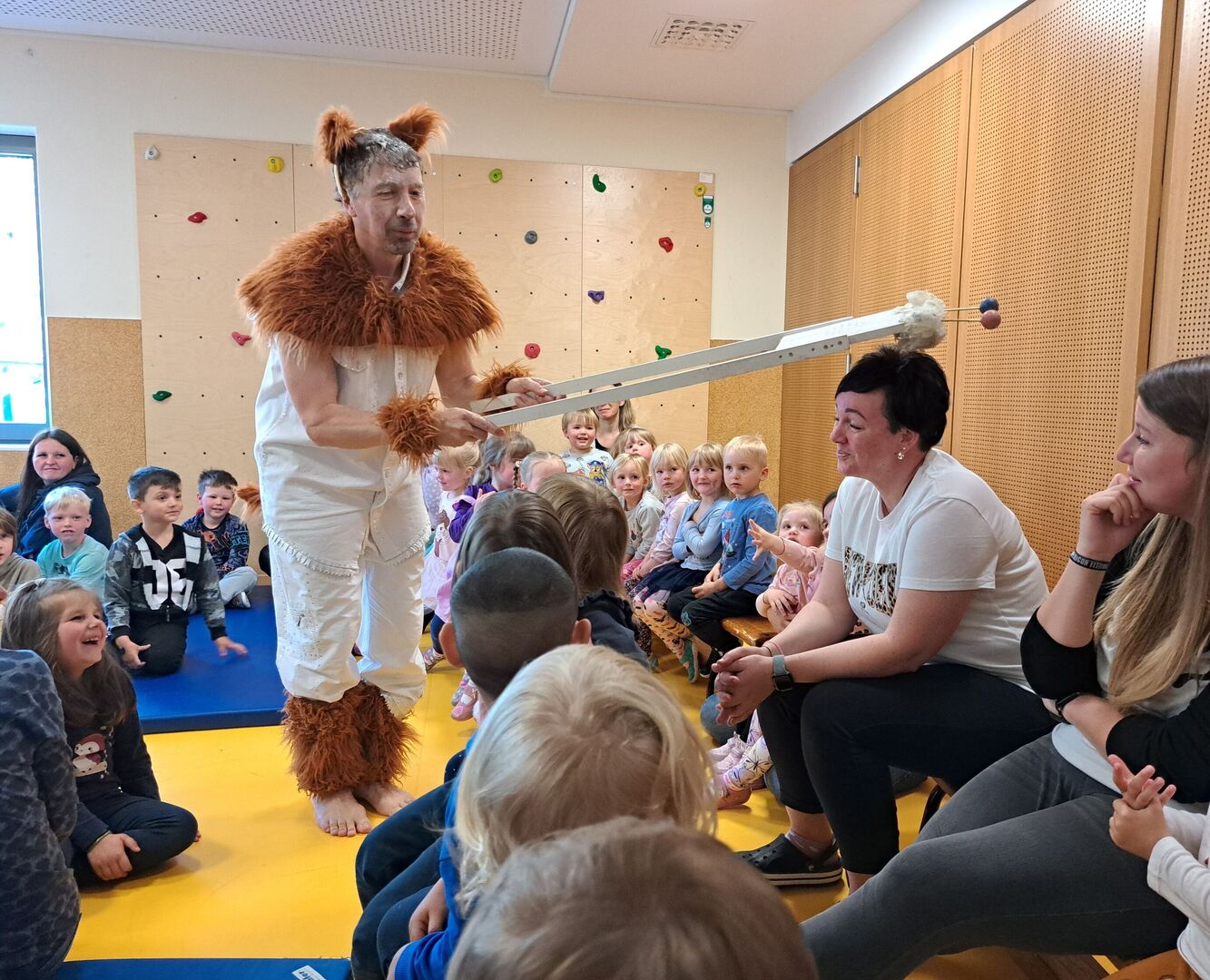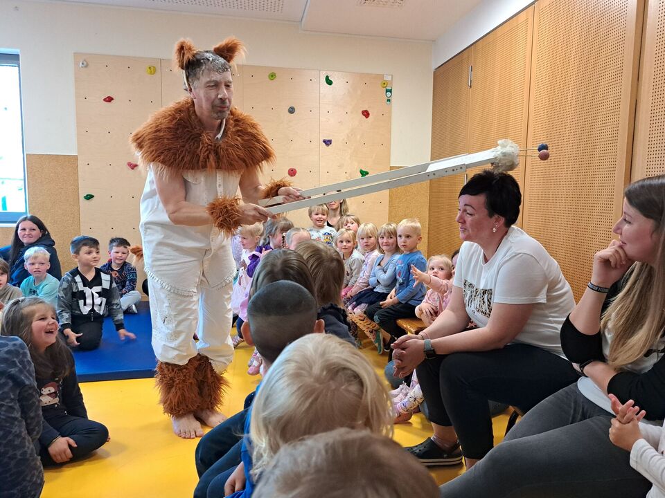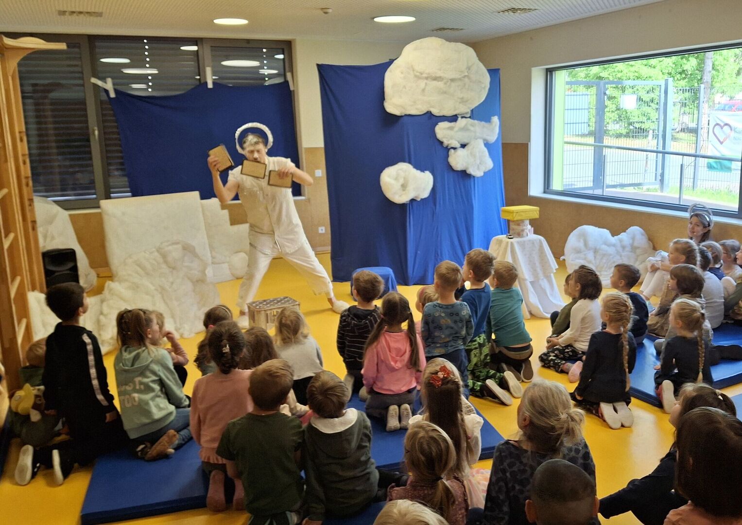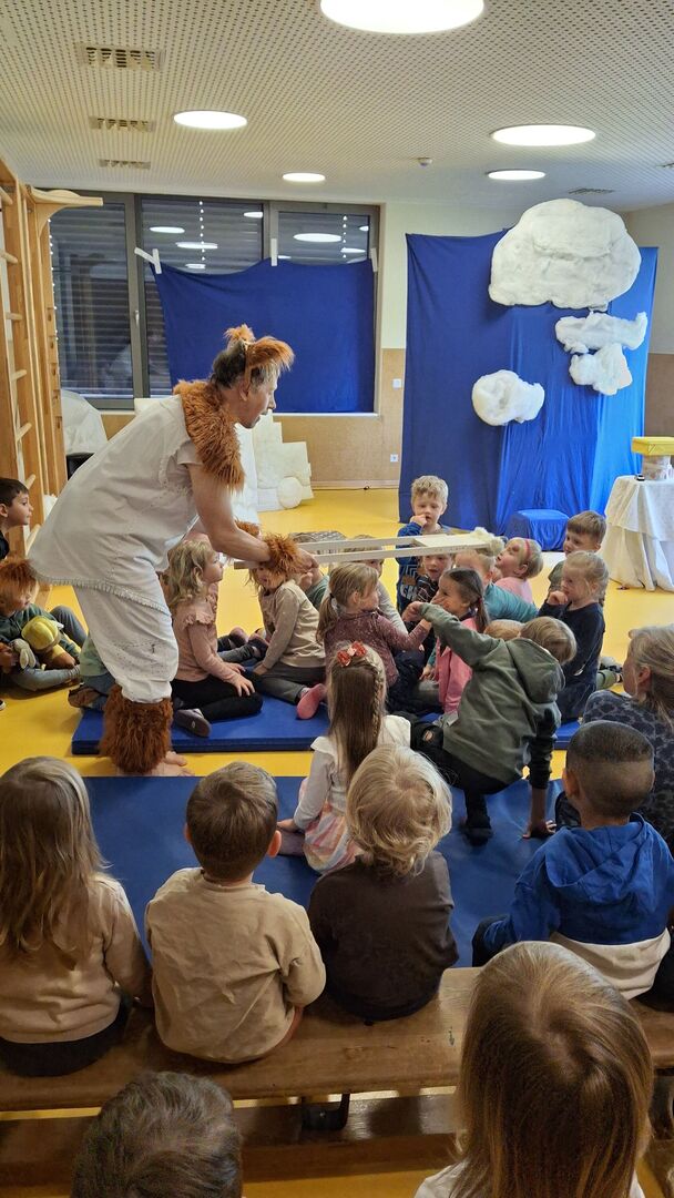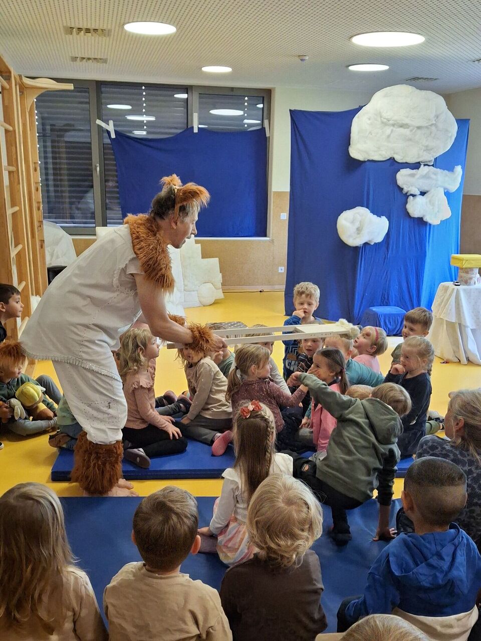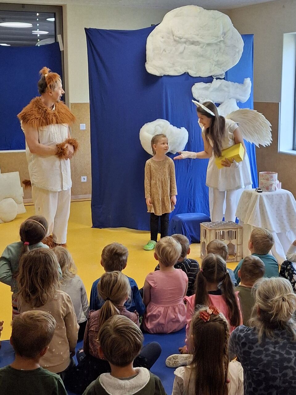 Ganz gespannt auf das was kommt, bestaunen die Kinder die bunt gestaltete Theaterbühne in unserem Bewegungsraum. Hinter einer großen blauen mit Wolken verzierten Wand ist eine Stimme zu hören – „MÄÄÄÄH, MÄÄÄÄH“ ertönt es immer wieder. Auf der Suche nach ihrer Identität und mit lustigen Ideen, wie „Ich glaube, ich bin eine Katze!“ zaubert die Stimme den Kindern ein Lachen auf die Lippen und animiert zum Mitmachen.