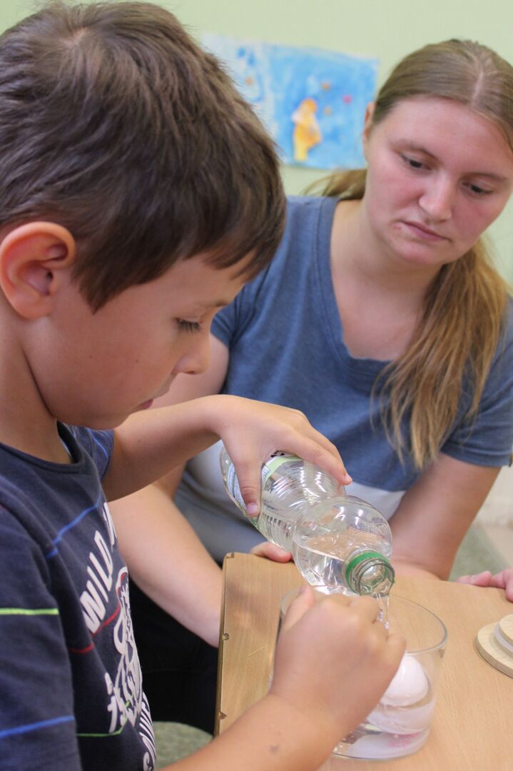 Die Kinder versuchen, die zuvor durch Apfelsaft und Cola verfärbten Eier, mit Zahncreme wieder weiß zu bekommen.