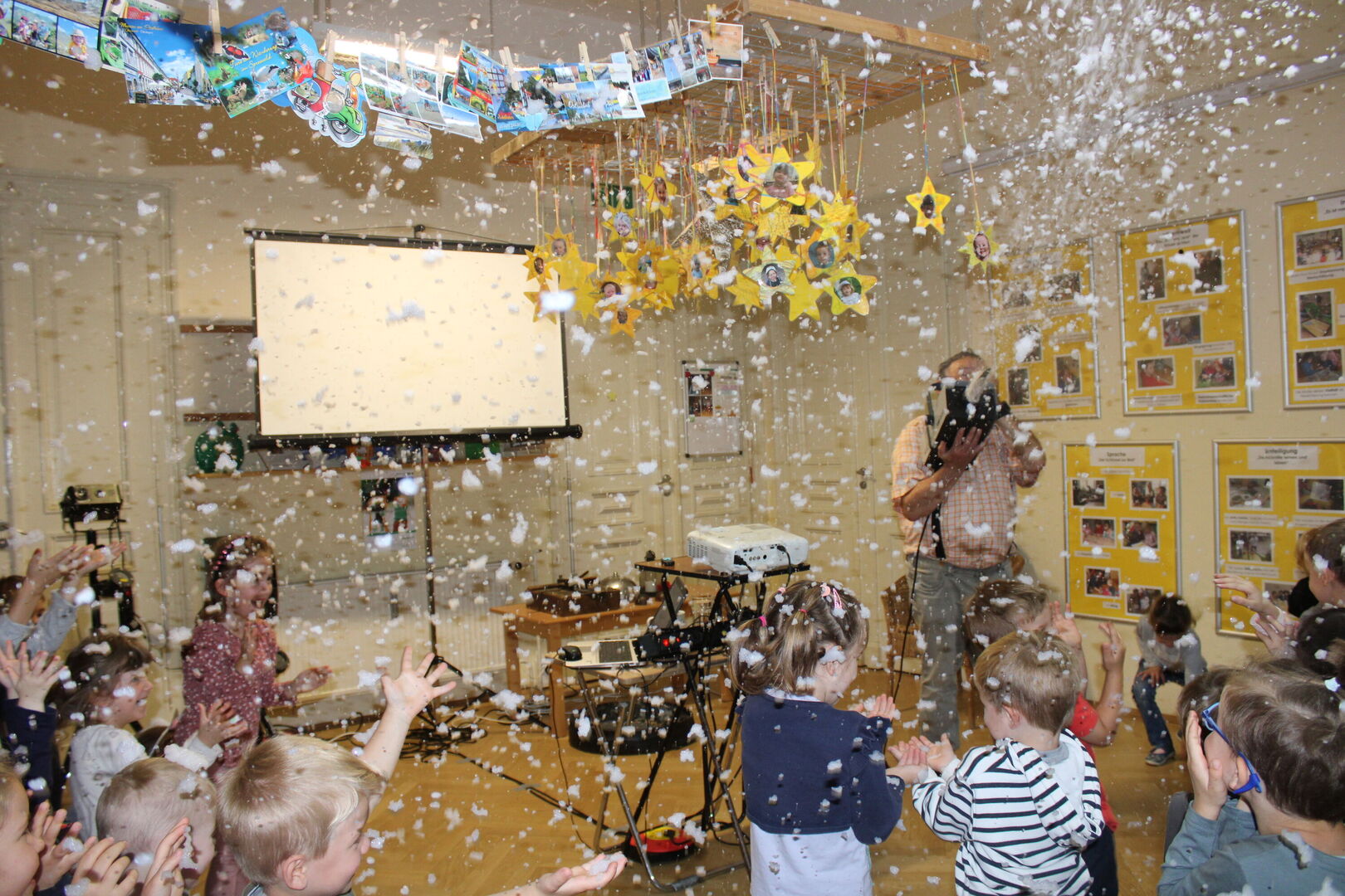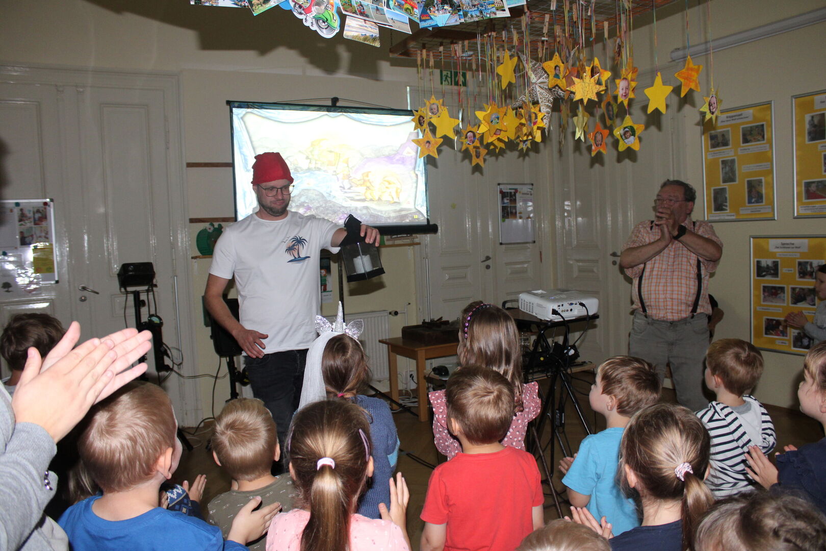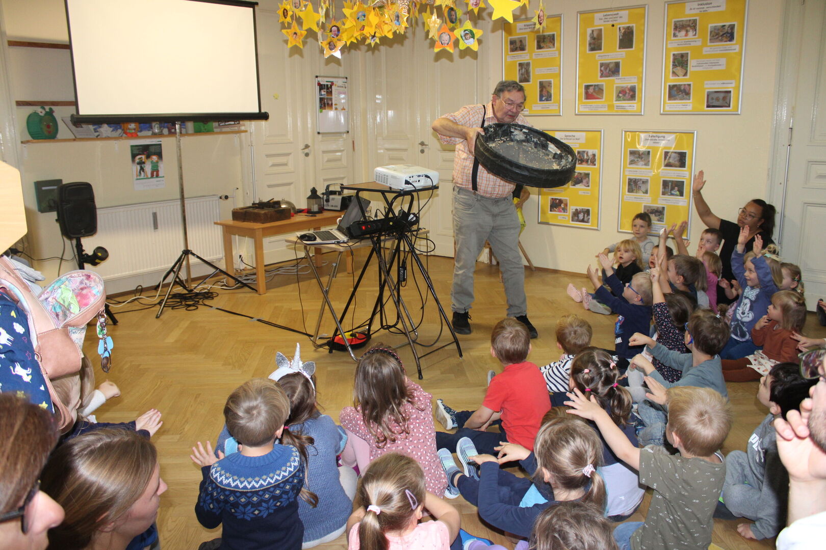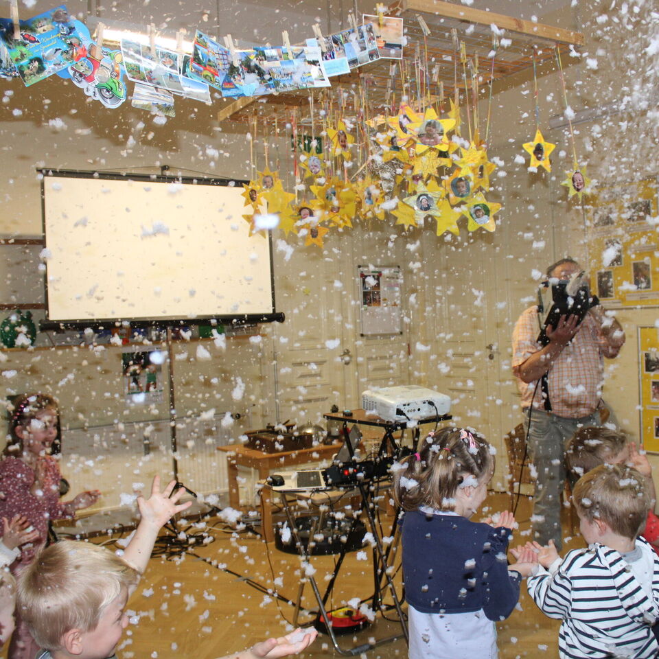 Diesmal brachte er uns „Schneewittchen“ mit. Mit Geräuschen, Effekten, Musik und einer Videoprojektion erlebten wir das Märchen von den Gebrüdern Grimm und tauchten so mit ein, in die geheimnisvolle Welt der Theatereffekte. Die Kinder waren immer wieder eingeladen, sich zu beteiligen und somit zum Gelingen dieser kleinen Theateraufführung beizutragen.