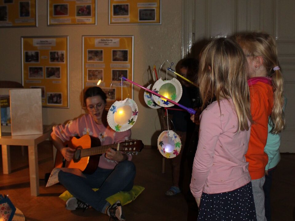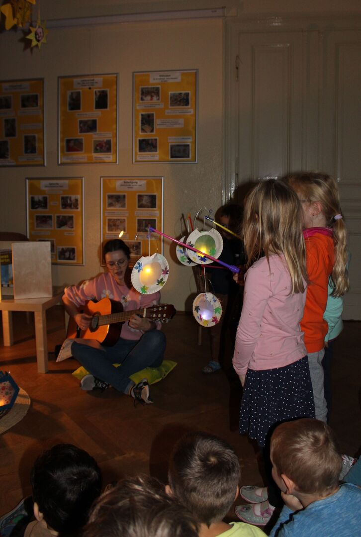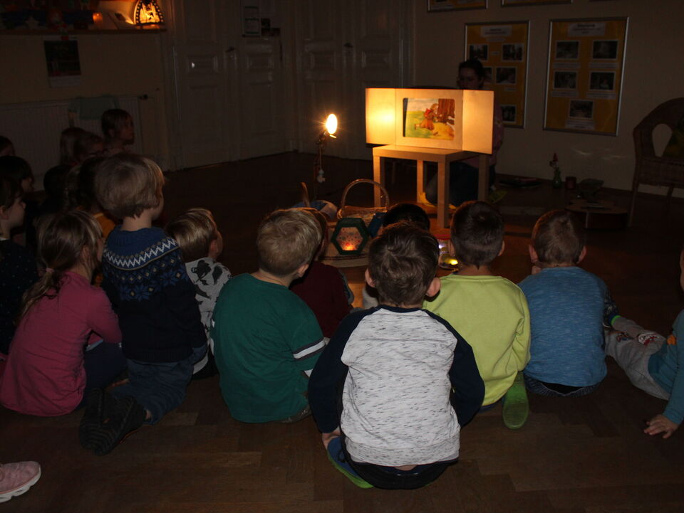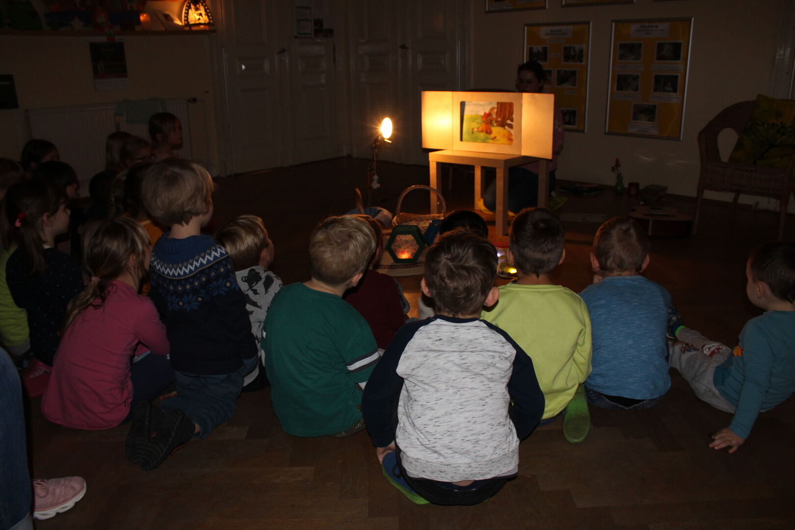 Neugierig und gespannt lauschten die Kinder den Worten und eingespielten Geräuschen und betrachteten dabei die Bilder. Am Ende der Geschichte leuchteten die selbstgebastelten Laternen zu dem Lied „Ich geh mit meiner Laterne“ auf.