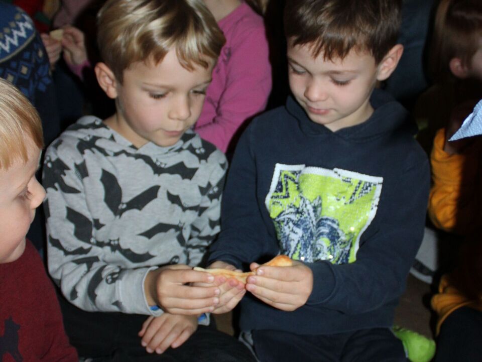 In gemütlichen Atmosphäre lauschten sie gespannt der Legende von St. Martin mit dem „Kamishibai“ Erzähltheater. Der heilige St. Martin traf im Winter einen frierenden Bettler. Er selbst hatte nichts außer seinen Waffen und seiner Kleidung bei sich – was ihn nicht davon abhielt, dem Mann zu helfen. Mit seinem Schwert durchtrennte er seinen Mantel und gab dem Bettler eine Hälfte.