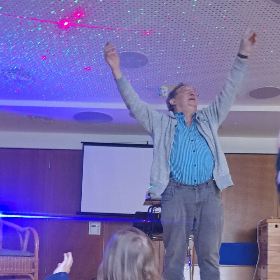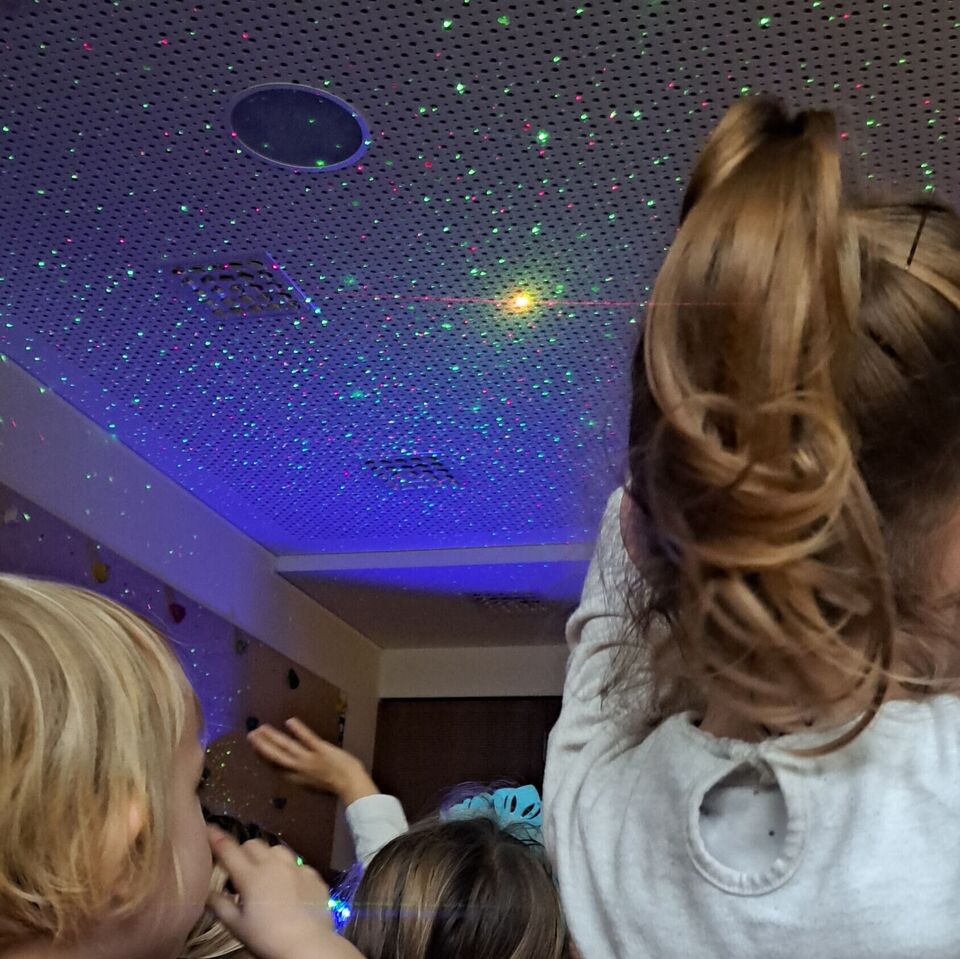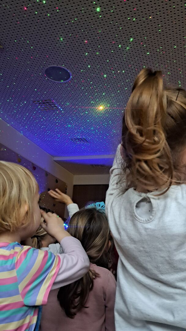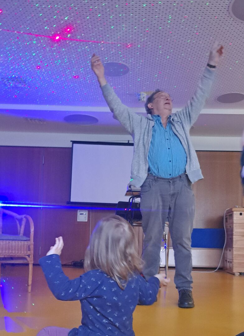 Unsere Kleinsten nahm Herr Meister mit in die Welt der „Raupe niemals satt“. Ein bunter Sternenhimmel und fantasievolle Geräusche sorgten für staunende und strahlende Kinderaugen.