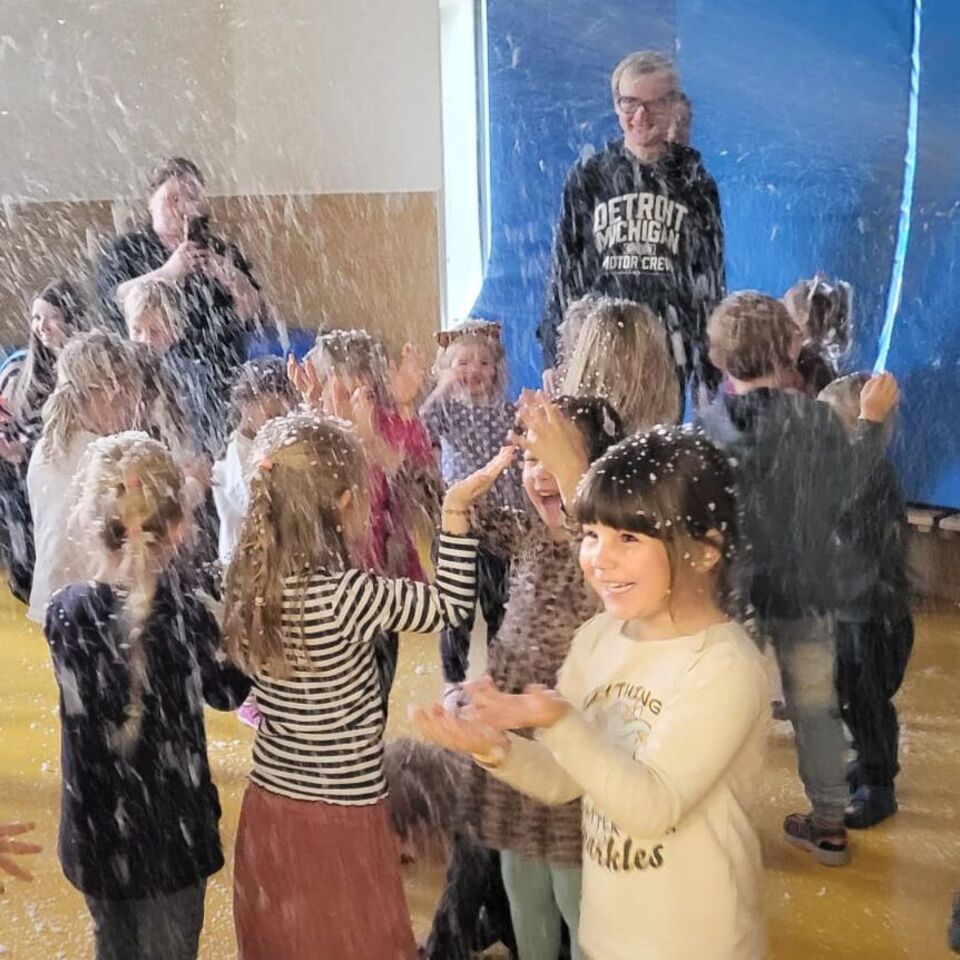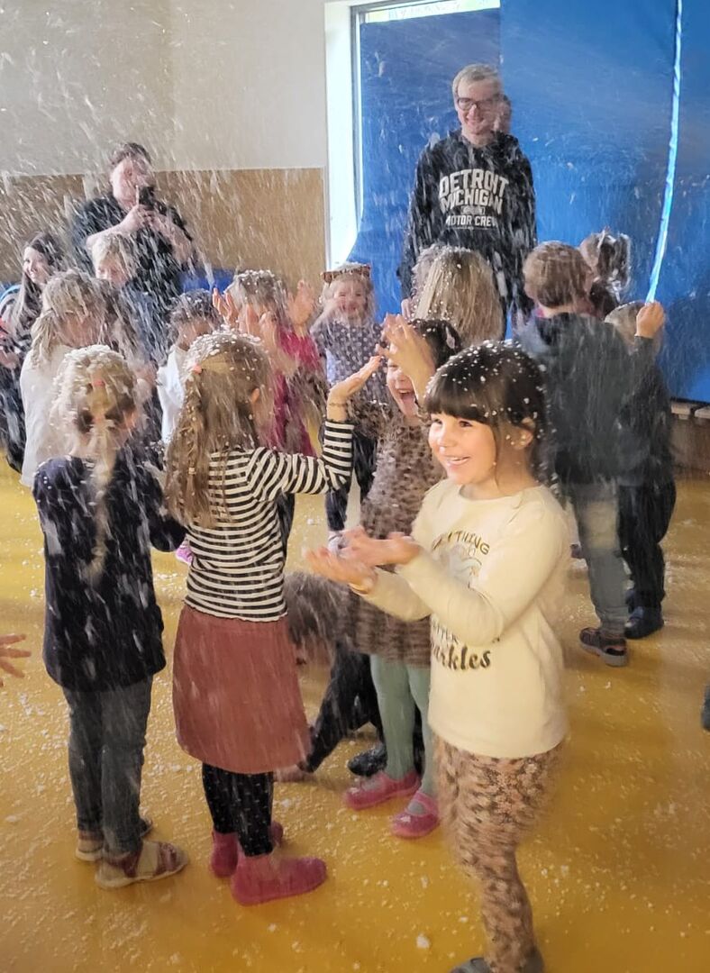 Alle Kinder lauschten sehr gespannt seiner Erzählung und die unzähligen Mitmachmomente sorgten für eine fröhliche Stimmung in unserem zum Theater umfunktionierten Bewegungsraum. Eine fröhliche Schaumparty beendete die Reise der Kinder in diese wundervolle Phantasiegeschichte.