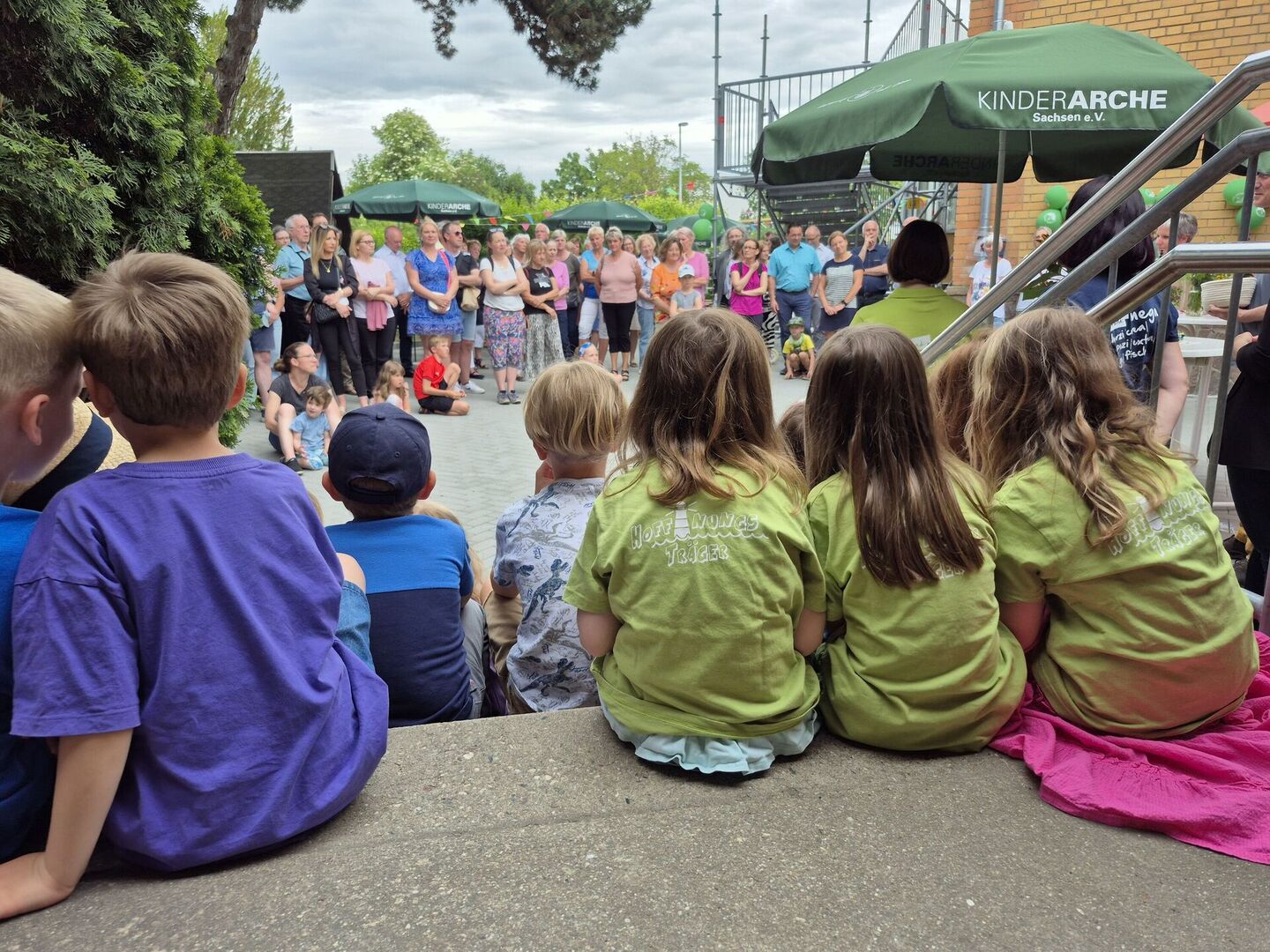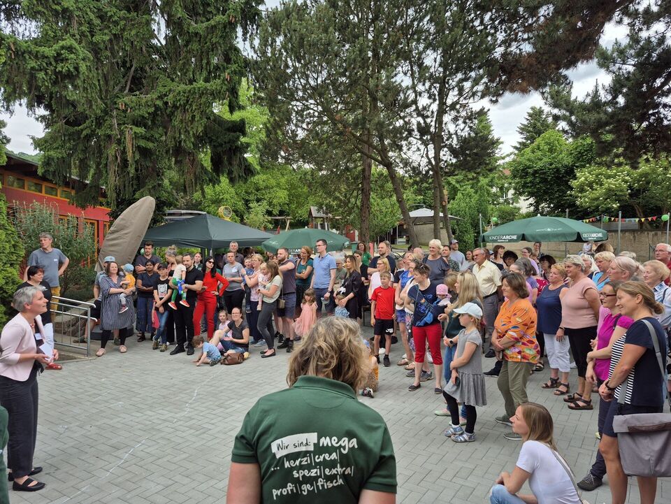 Nach der Begrüßung stimmten die Kinder, ganz im Sinne unseres Namenspatrons Eduard Bilz, mit dem fröhlichen „Bilz-Lied“ auf das Thema des Tages ein. In ihrer Rede würdigte unsere neue Vorständin Barbara Gärtner die bewegte Geschichte des Hauses, das einst als Kinderheim, Gehörlosenschule und Betriebskita der Dresdner Verkehrsbetriebe diente. Heute steht es wieder im Zeichen der Gemeinschaft, der Geborgenheit und des Lernens. Durch die umfassenden baulichen Veränderungen können nun auch Integrationskinder betreut und gefördert werden.