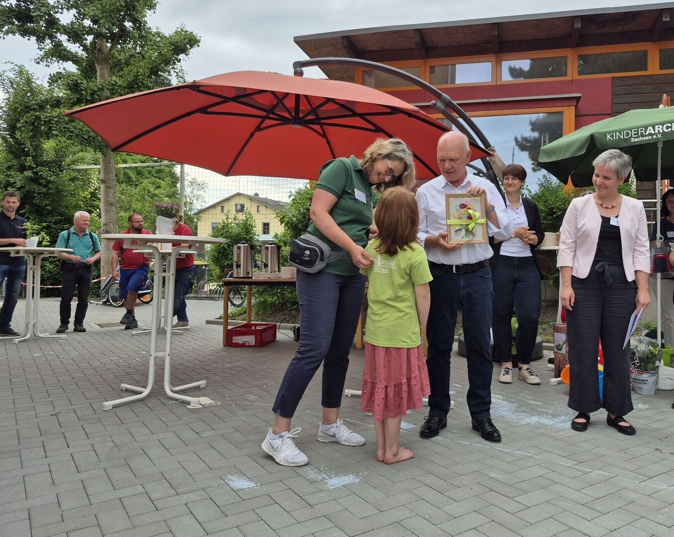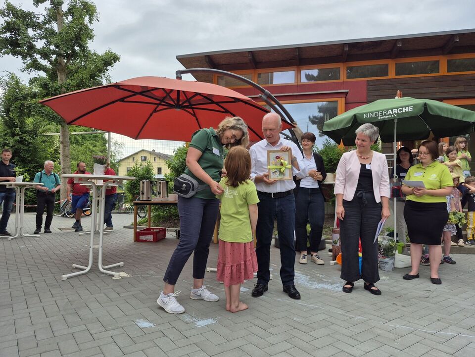 Besonders gefreut haben wir uns über den Besuch unseres ehemaligen Vorstands Matthias Lang, für den die Fertigstellung des Baus kurz vor seinem Ruhestand ein echtes Herzensprojekt war. Als Zeichen der Wertschätzung überreichten ihm die Vorschulkinder ein selbstgebasteltes Geschenk. Darüber hinaus ernannte Barbara Gärtner ihn zum Paten der Kita und überreichte ihm eine symbolische Patenschafts-Urkunde. Ein sichtbares Zeichen der besonderen Verbindung, die Herr Lang über viele Jahre zu der Kita aufgebaut hat und die hoffentlich auch in Zukunft bestehen bleibt.