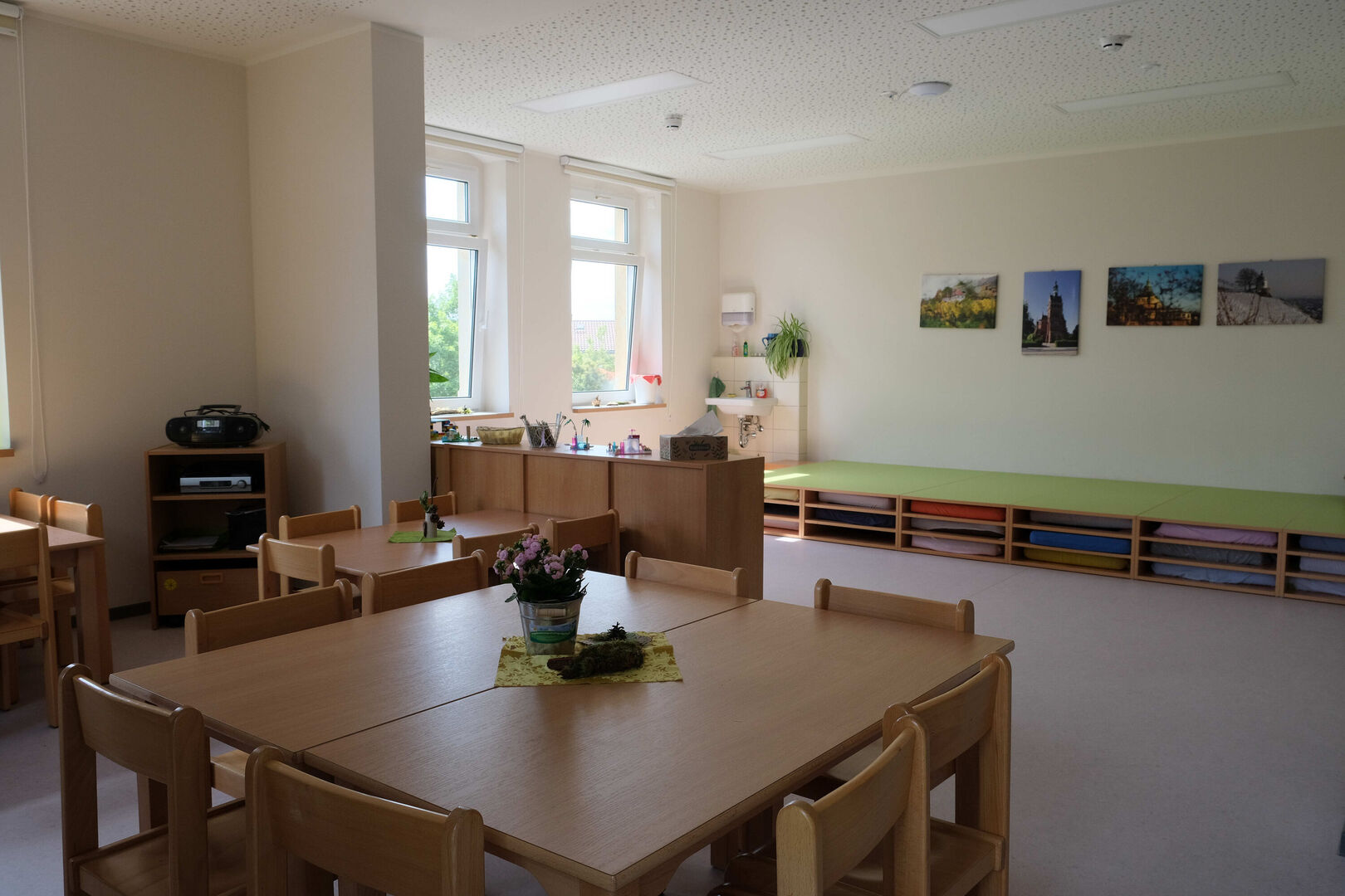 Ida und Annie, Ole und Nele gefällt es in den neuen Räumen ihrer Kita. Besonders beliebt: die kleinen Durchgänge in den Wänden und das große Winkefenster.