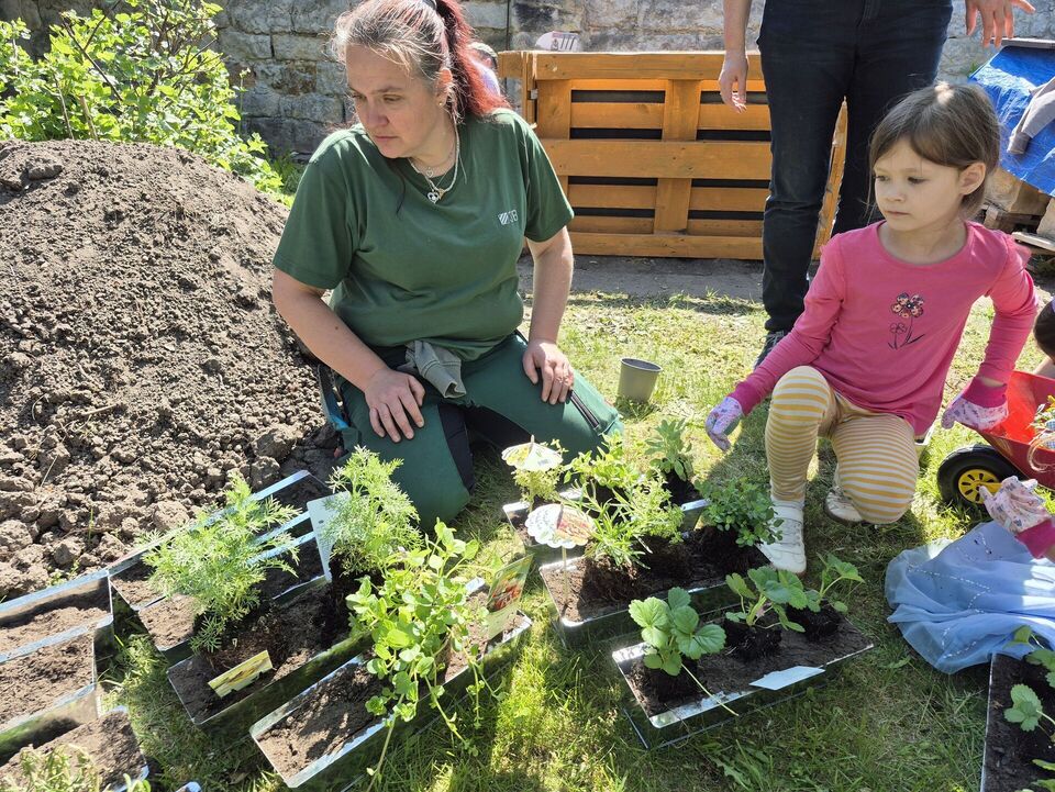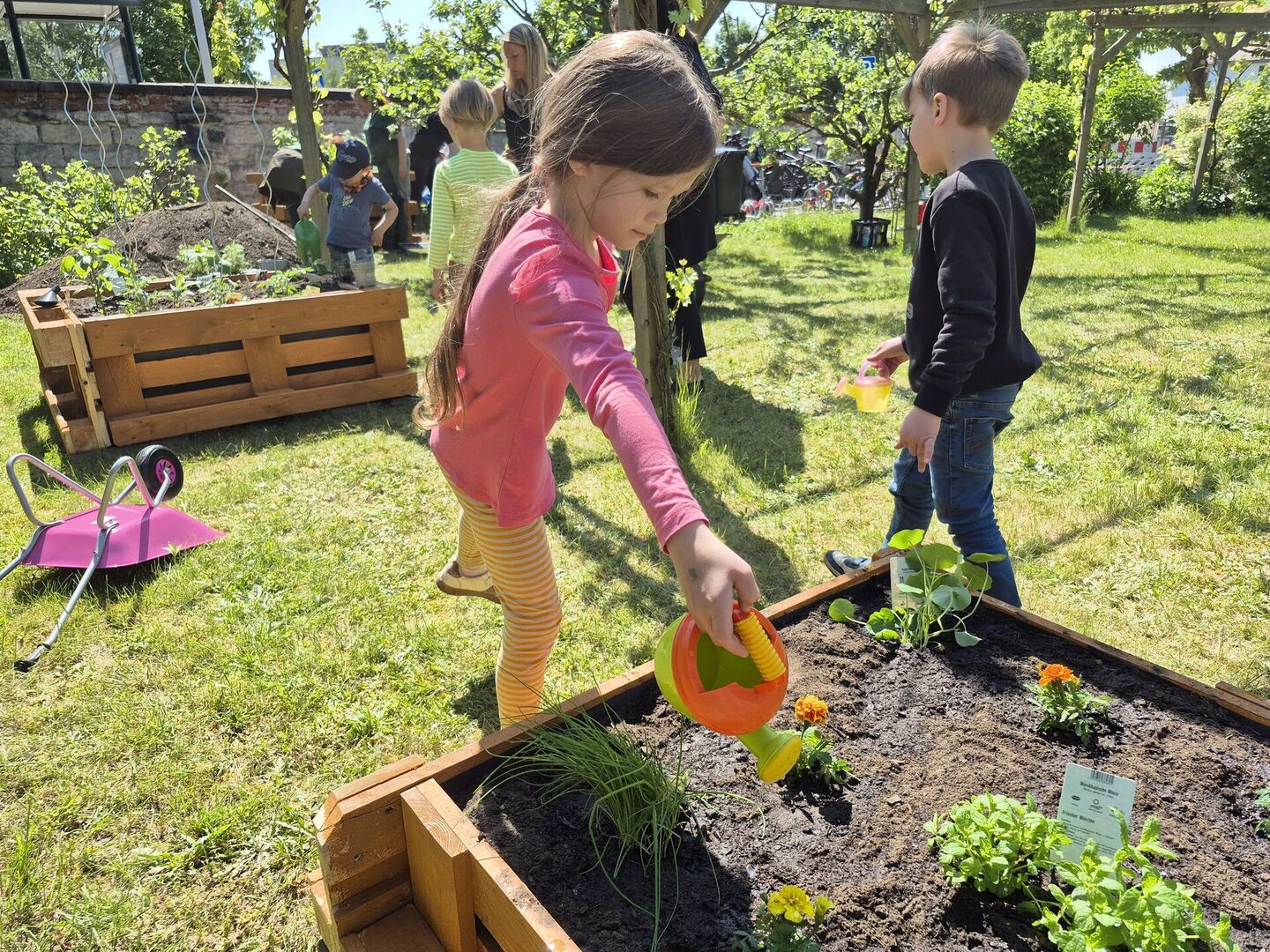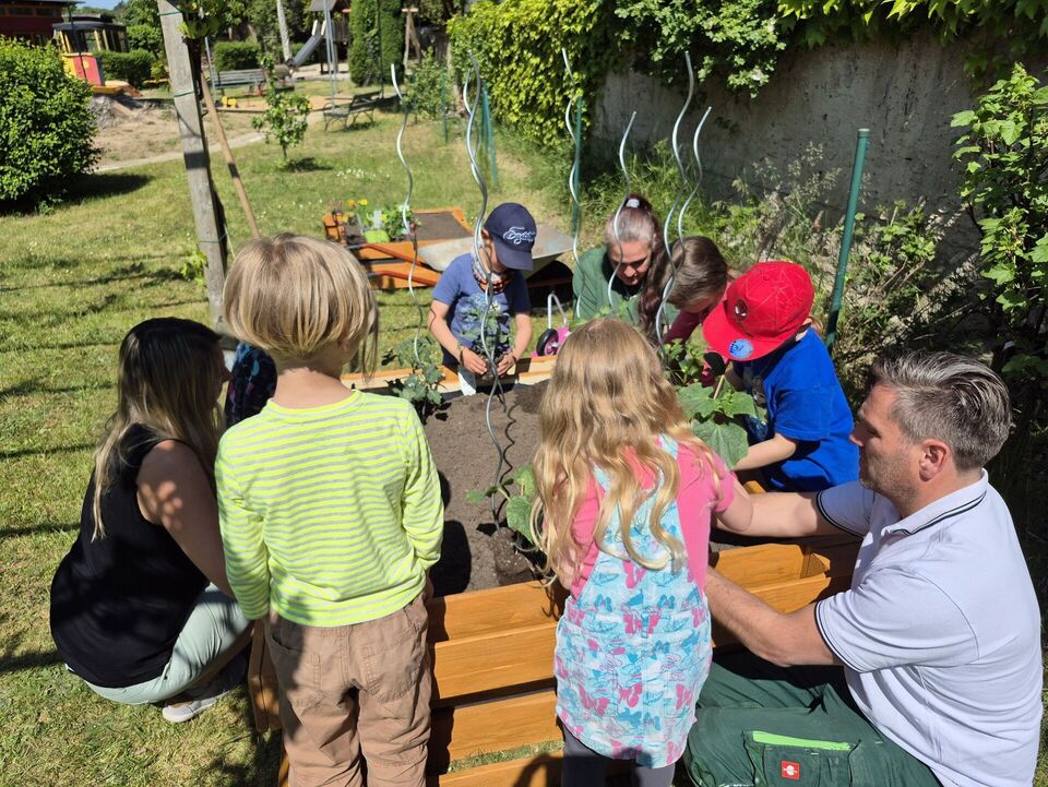Nachdem die drei Hochbeete bis zum Rand mit Erde gefüllt waren, begann der spannendste Teil: das Bepflanzen. Besonders groß war die Freude über die eigenen Erdbeerpflanzen. Doch auch Minze, Radieschen, Schnittlauch, Basilikum, Gurken, Salat und Tomaten fanden ihren Platz im neuen Kita-Garten. Mit viel Liebe und Engagement haben die Kinder ihre Hochbeete gestaltet und die Pflanzen bewässert. Wir sind überzeugt, dass die Pflanzen in der Waldstraße bestens gedeihen werden.