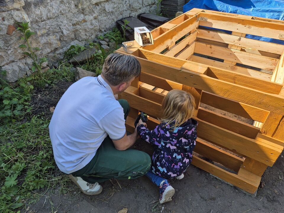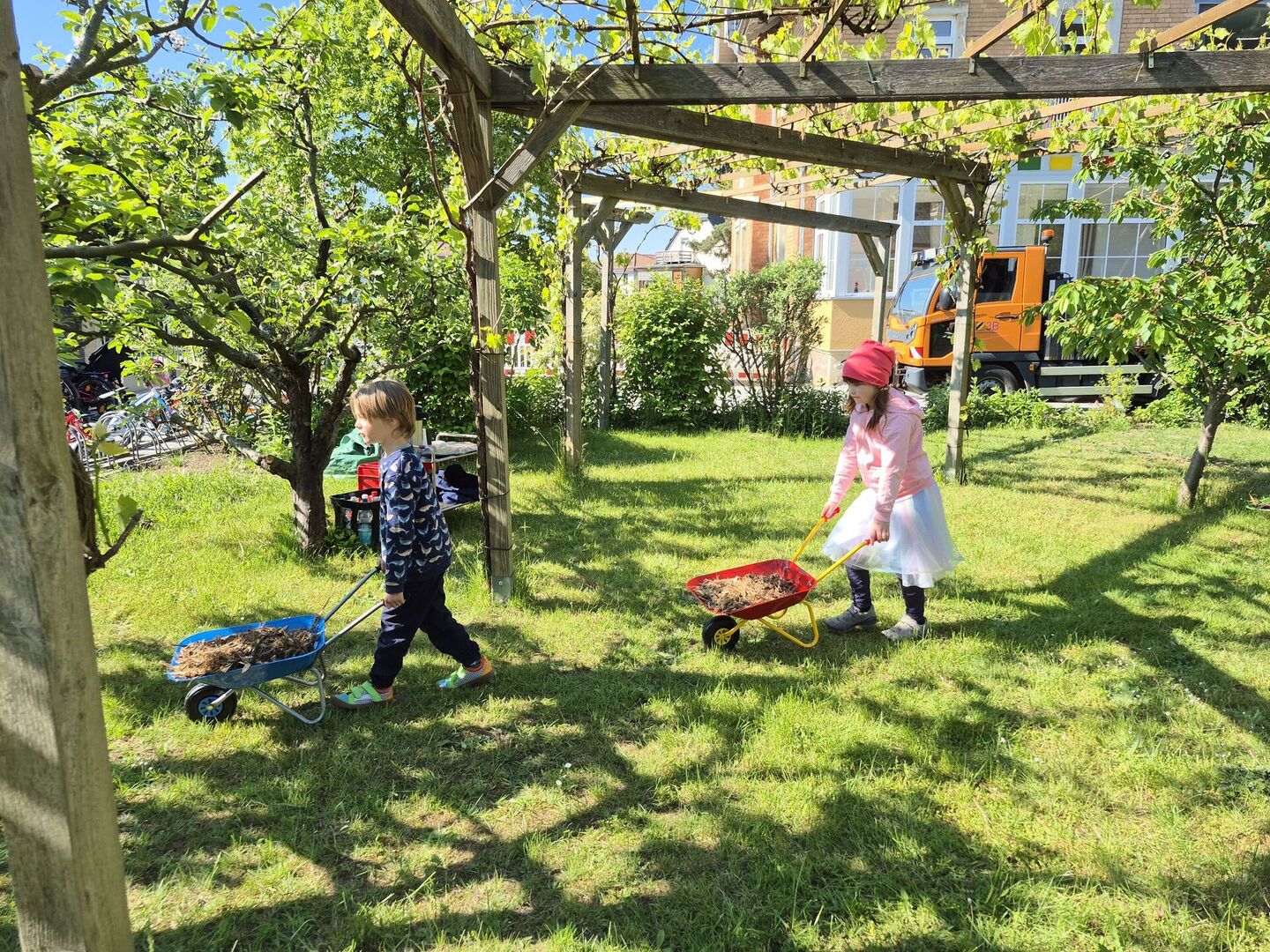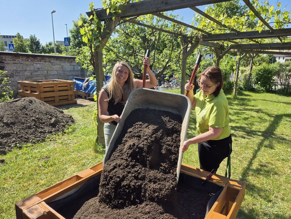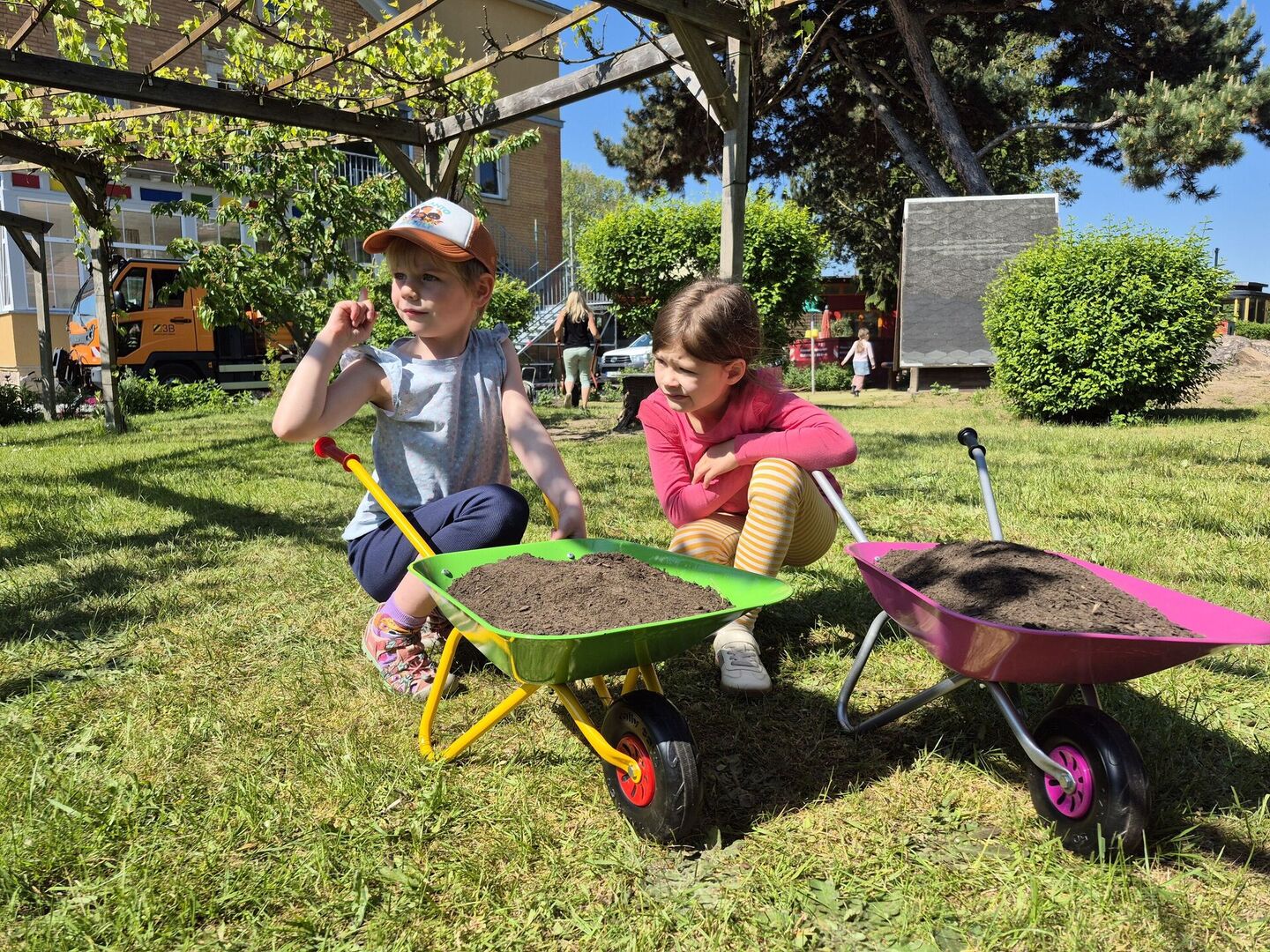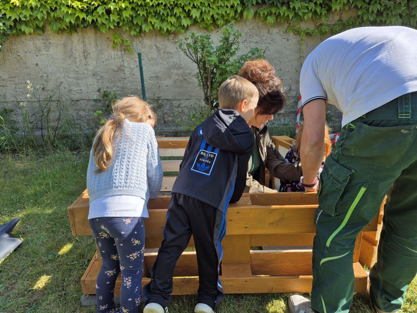 Von Anfang an waren die Kinder aktiv in das Projekt eingebunden. Sie schraubten die Holzpaletten zusammen, legten Folie als Beetunterlage aus und transportierten mit viel Spaß und bunten Schubkarren Rindenmulch und Erde zu den Beeten. Dabei zeigte sich schnell, dass in so ein Hochbeet deutlich mehr Erde passt, als man auf den ersten Blick denkt. Daher unterstützten auch unsere Fundraiserin Fanny Neubert und Kita-Leiterin Birgit Prochno tatkräftig beim Befüllen der Beete.