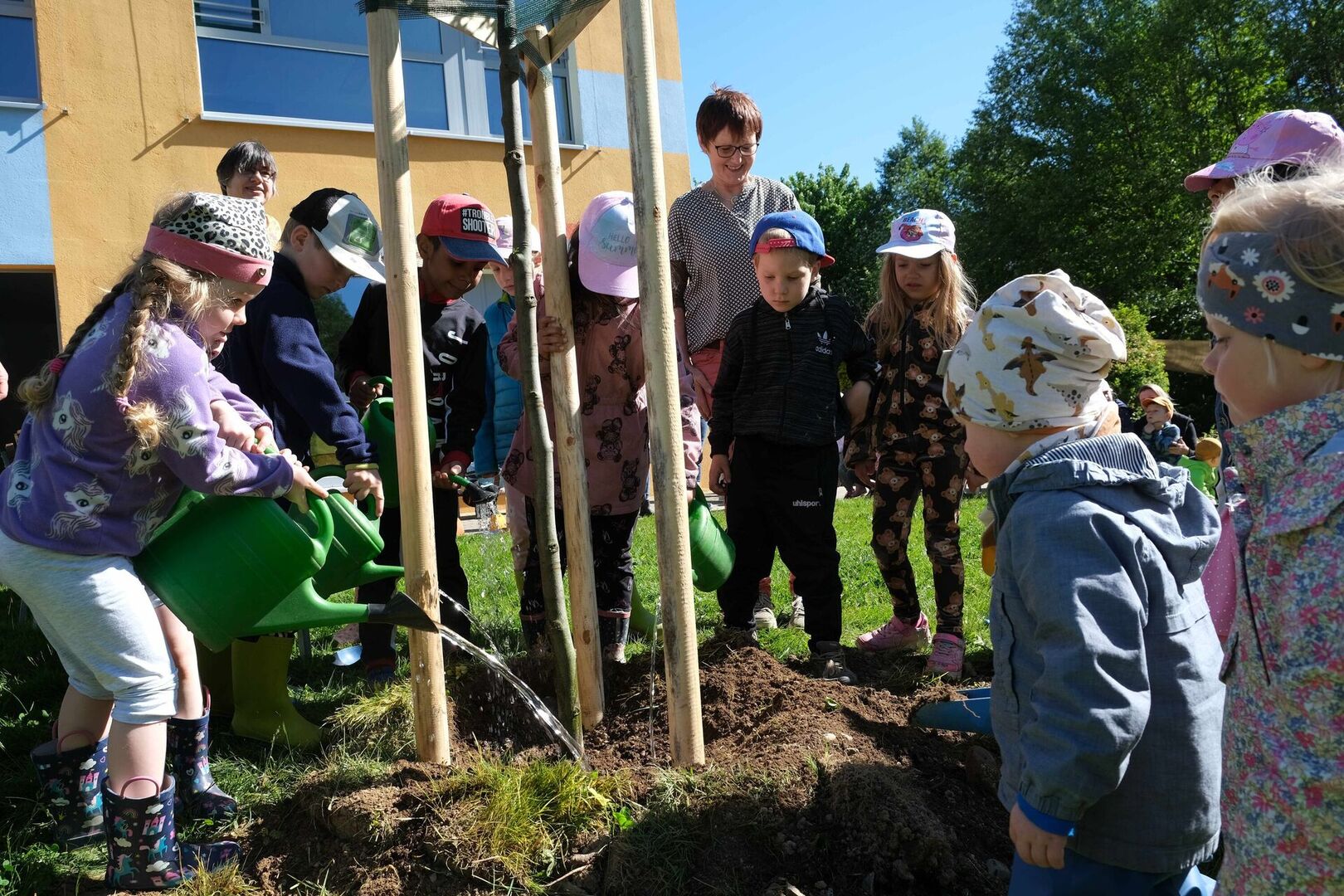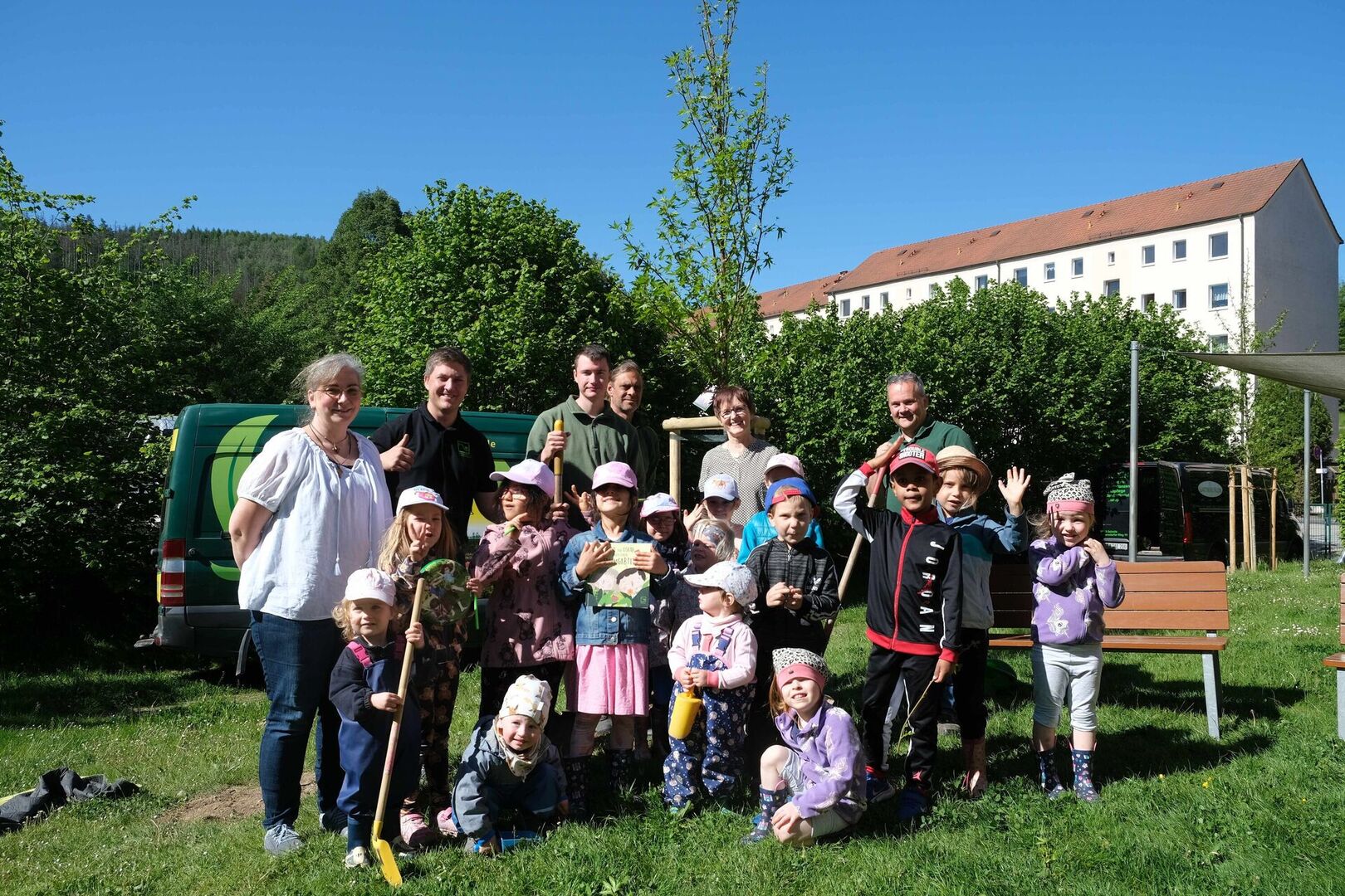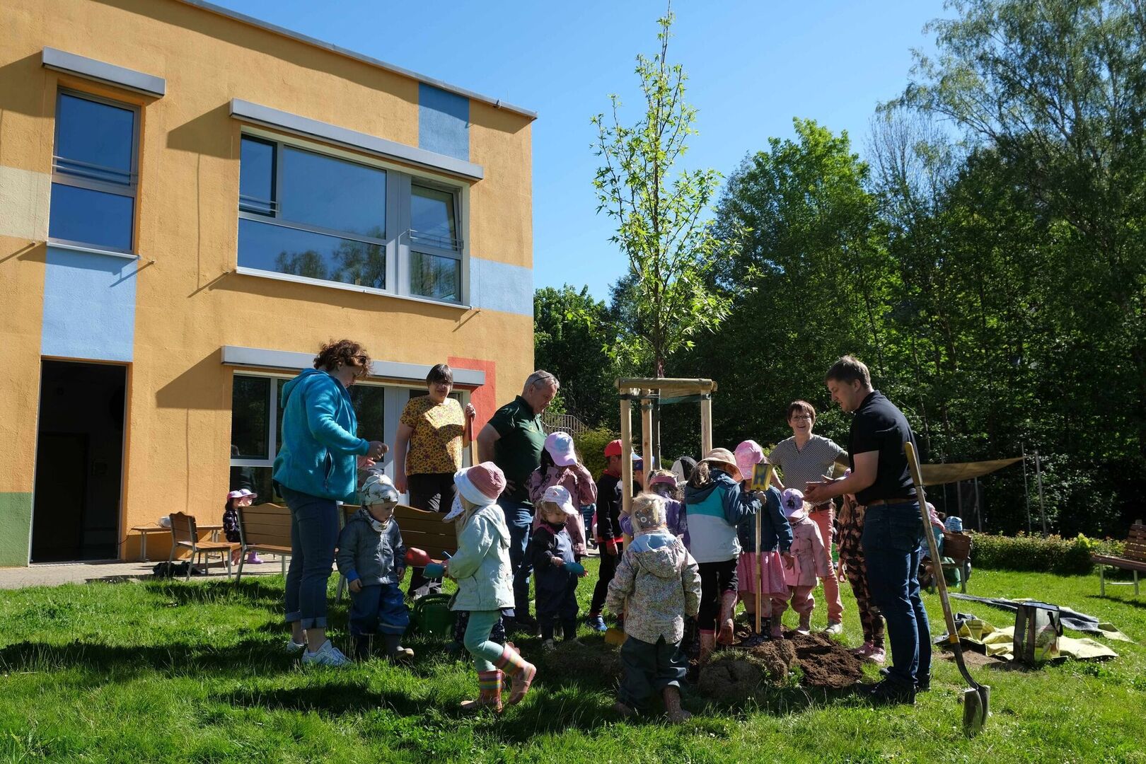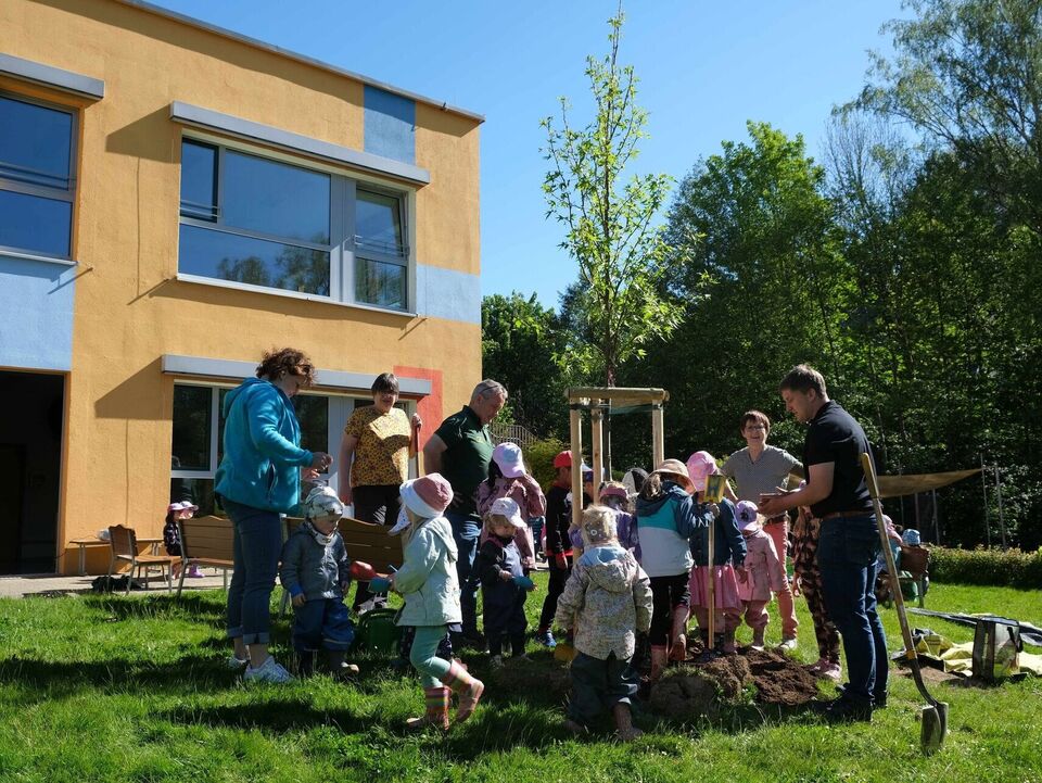 Aber nicht nur in Dresden waren wir als Kinderarche Sachsen e.V. mit anderen aktiv. Bei uns in der Christlichen Kindertagesstätte „Unterm Regenbogen“ durften wir erleben, dass uns Menschen vor Ort und darüber hinaus unterstützen. Gemeinsam mit Herrn Keul vom Verband Garten-, Landschafts- und Sportplatzbau Sachsen e.V., Herrn Freiberg von der Baumschule Leutersdorf und Frau Klein von der Gärtnerei Klein konnten wir einen weiteren Baum in unserem Garten pflanzen. Er wurde uns geschenkt und damit in eine nachhaltige Zukunft investiert – ein Schattenspender für die Kinder und hilfreich angesichts des Klimawandels. Wir bedanken uns ganz herzlich für diese sichtbare Unterstützung!